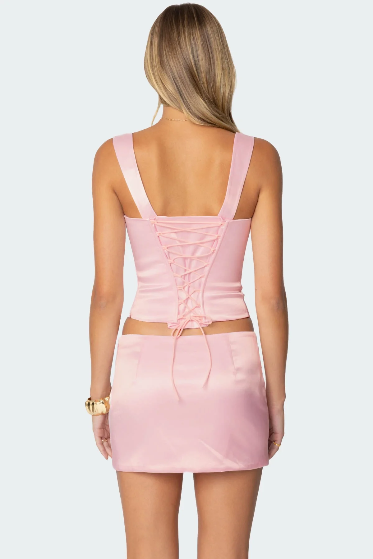 Corset Boned bodice Satin effect fabric Matching set Polyester, Spandex Model wears size S Model height is 5’8 Item care: Machine wash at maximum 30ºC, do not bleach, tumble dry low, iron at a maximum of 110ºC, do not dry clean.