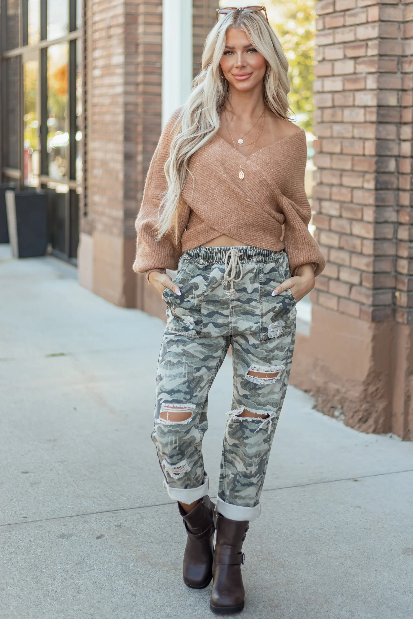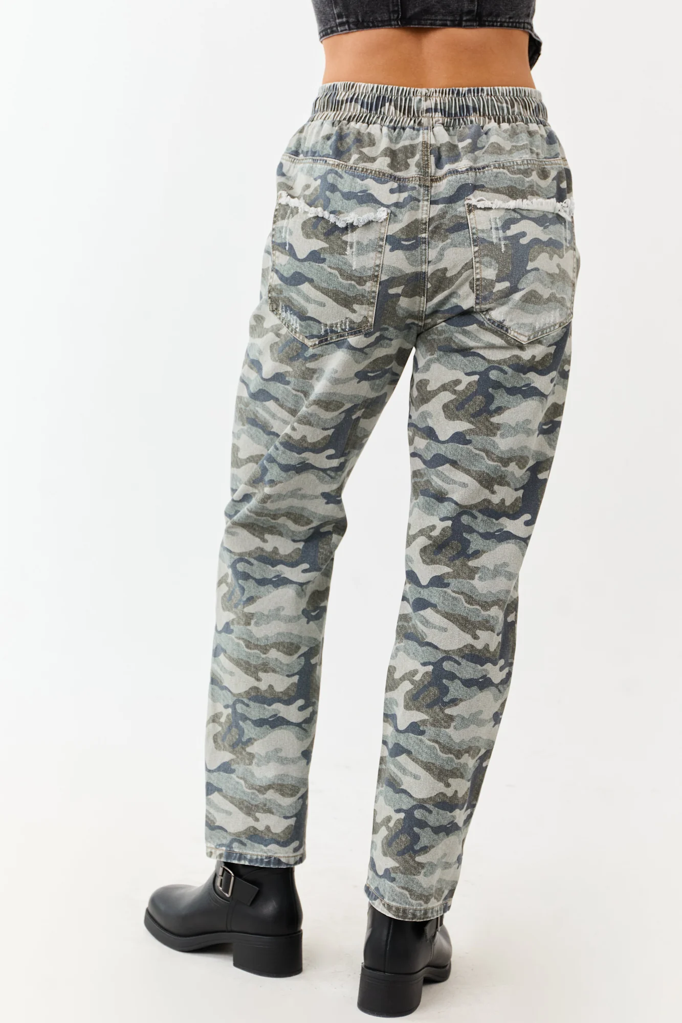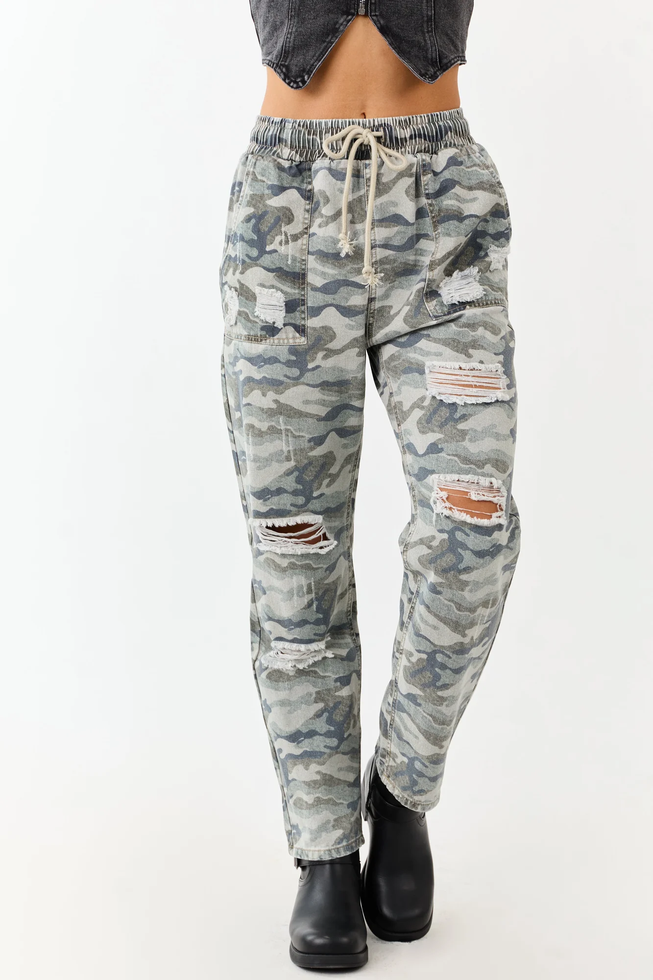 Blend edgy and casual style with these camo print denim pants. Featuring a comfortable drawstring waist and relaxed fit, these pants are perfect for any occasion. Made from 100% cotton with spruce, juniper, and charcoal camo shades. The distressed design adds a trendy touch. These pants have a non-stretchy denim material with a smocked waistband and cinching drawstring, offering a unique and fashionable look. With four pockets and an inseam of 28 inches, these pants are as functional as they are stylish. Pair them with your favorite top for a complete outfit. Available in sizes XS to XL. Model is wearing size Small. Waist: 26″, Hip: 40″.