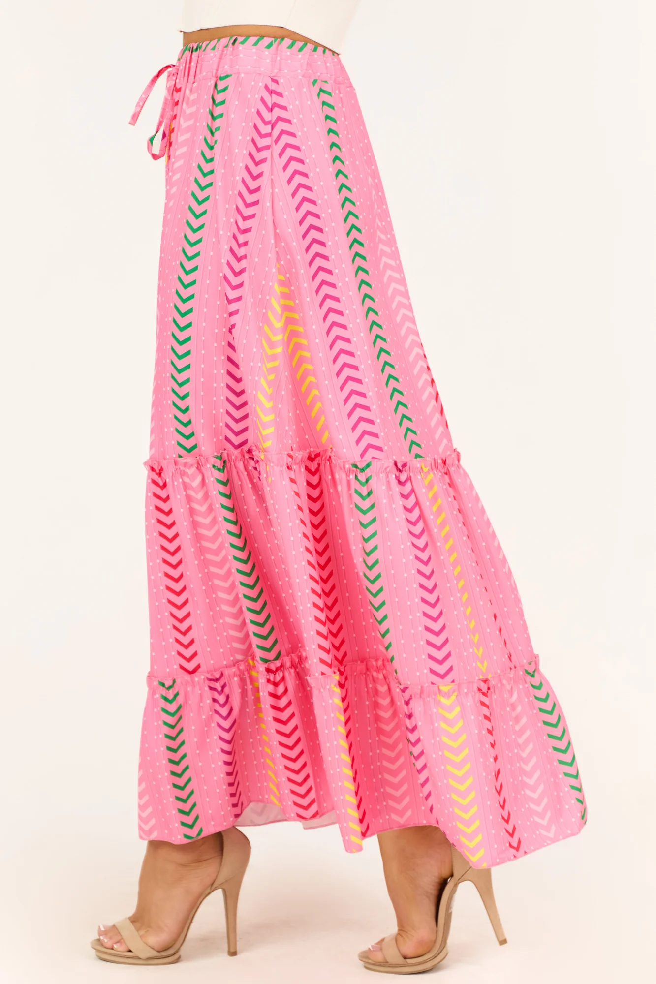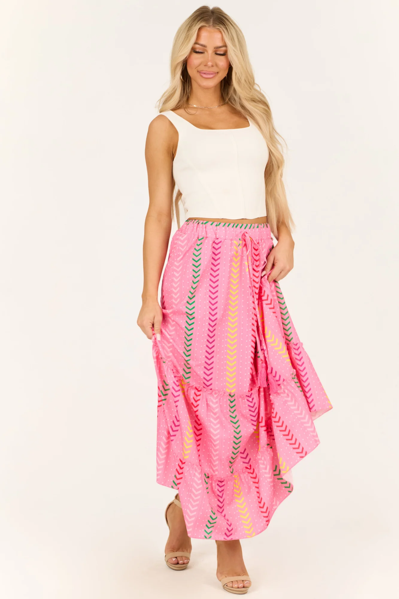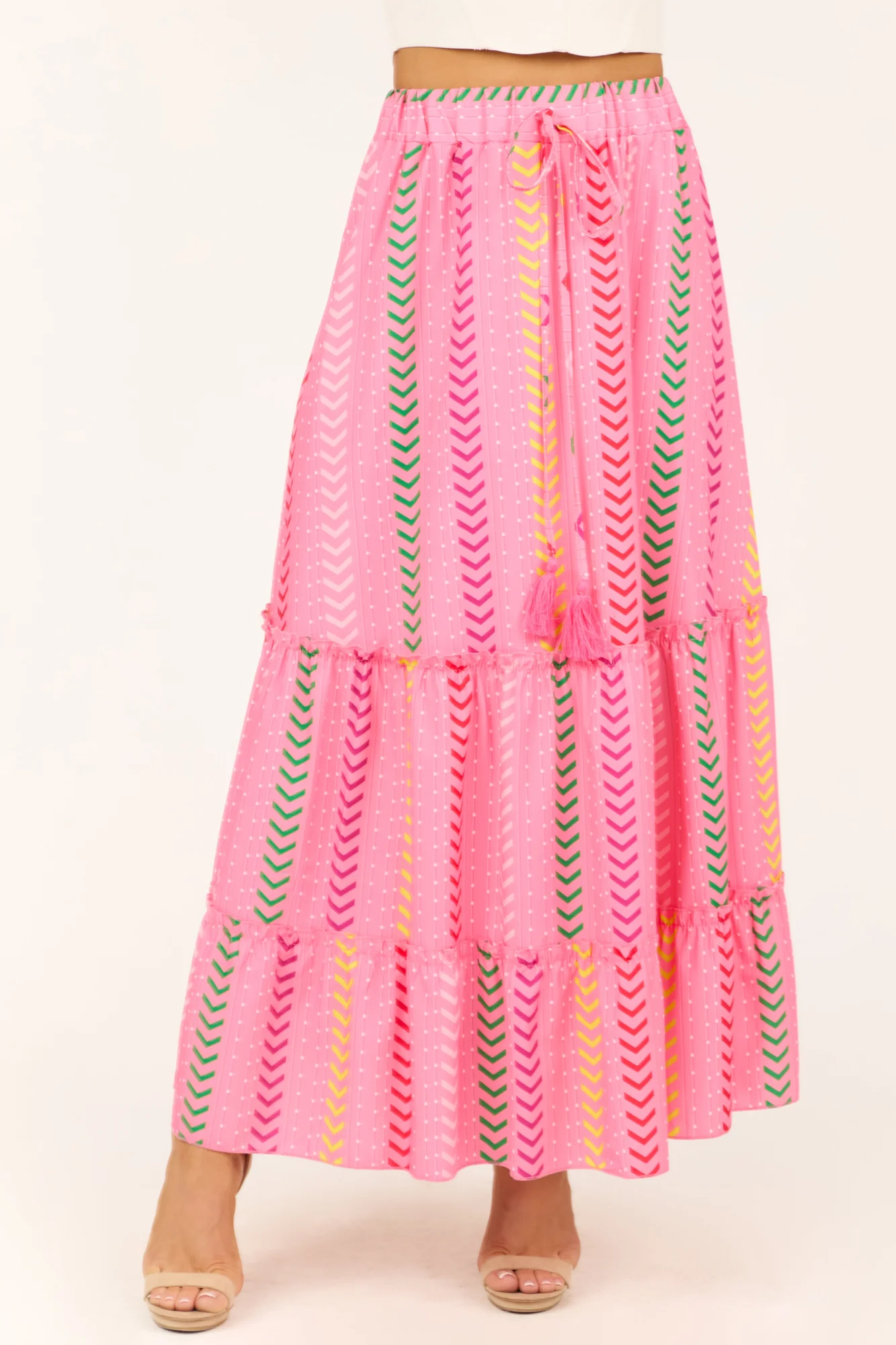 Indulge in the vibrant charm of our Canary Yellow Chevron Print Maxi Skirt! Crafted from 100% Polyester, this non-stretchy woven skirt features a flattering tiered ruffle design in shades of Lipstick, Blush, Hunter Green, and Berry. The elastic waistband ensures a comfortable fit, while the non-functional tassel tie detail adds a boho-chic touch. Perfect for both casual outings and special occasions. Available in sizes S, M, and L. Model is 57″ and wearing a size Small.