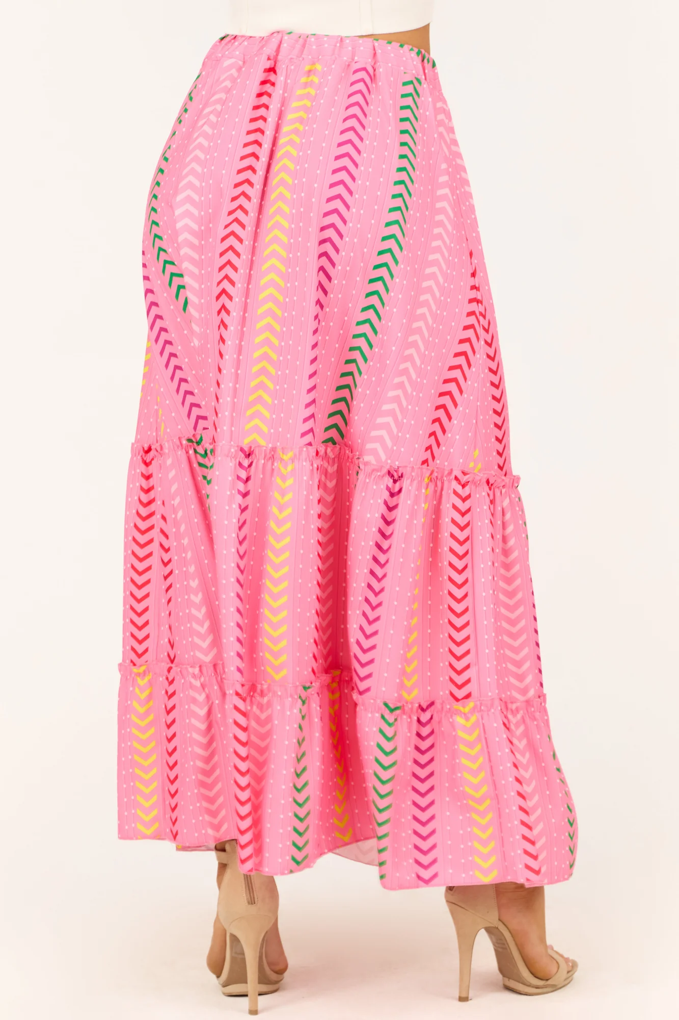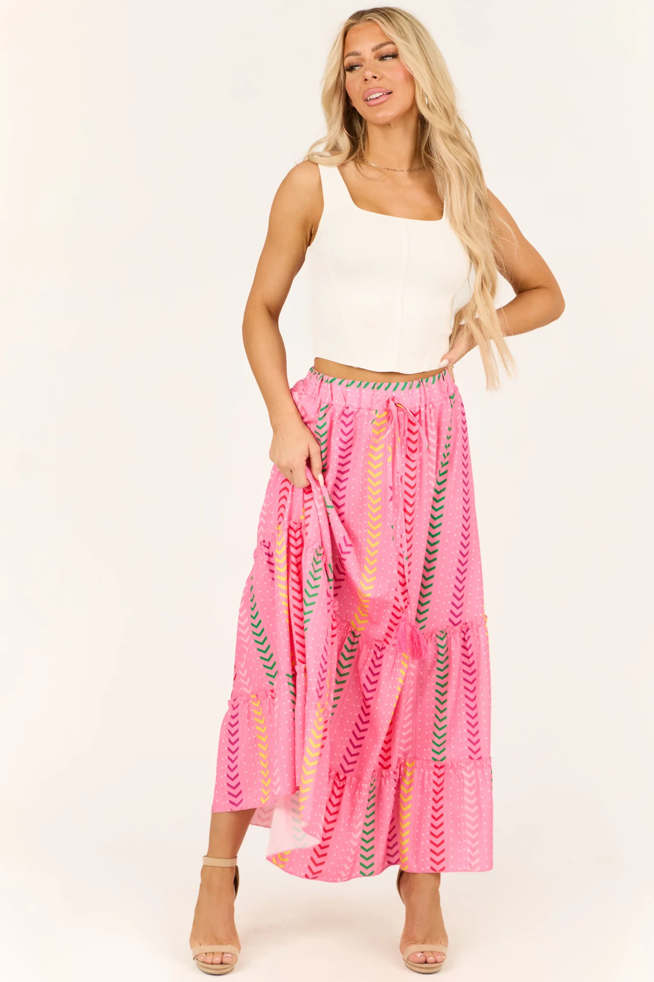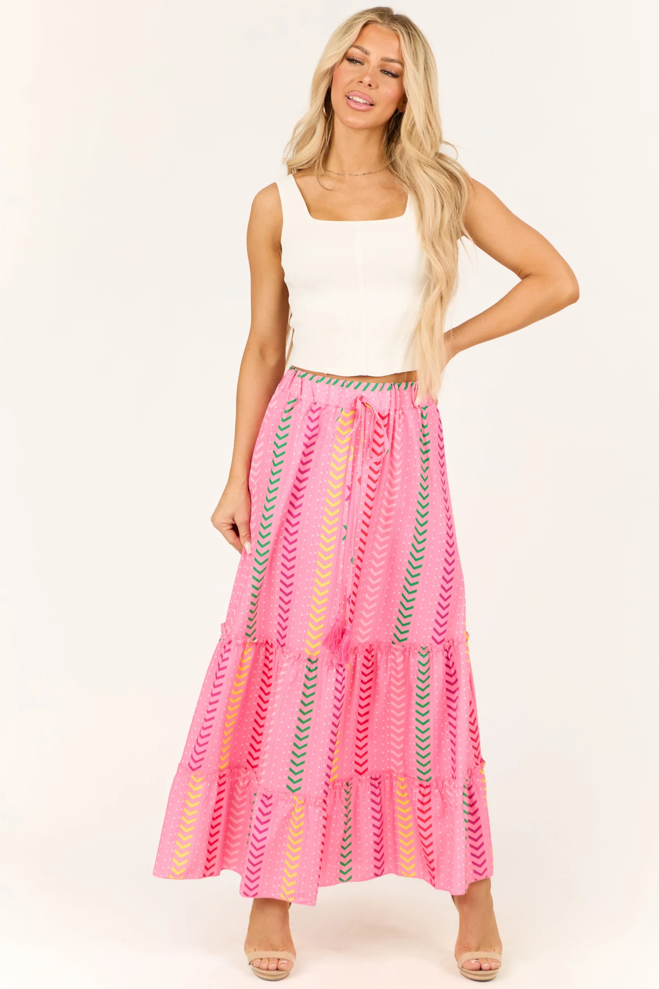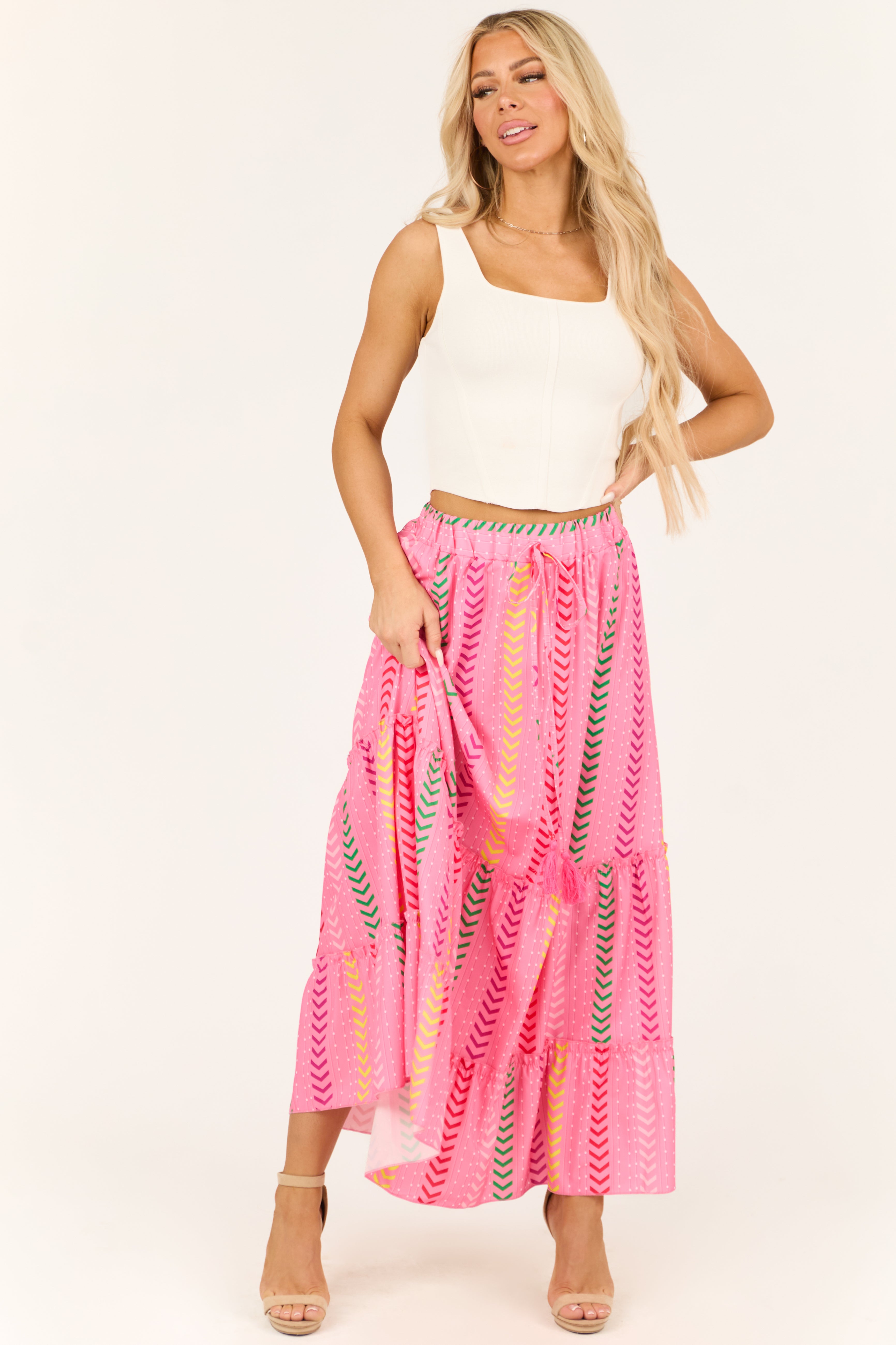 Indulge in the vibrant charm of our Canary Yellow Chevron Print Maxi Skirt! Crafted from 100% Polyester, this non-stretchy woven skirt features a flattering tiered ruffle design in shades of Lipstick, Blush, Hunter Green, and Berry. The elastic waistband ensures a comfortable fit, while the non-functional tassel tie detail adds a boho-chic touch. Perfect for both casual outings and special occasions. Available in sizes S, M, and L. Model is 57″ and wearing a size Small.