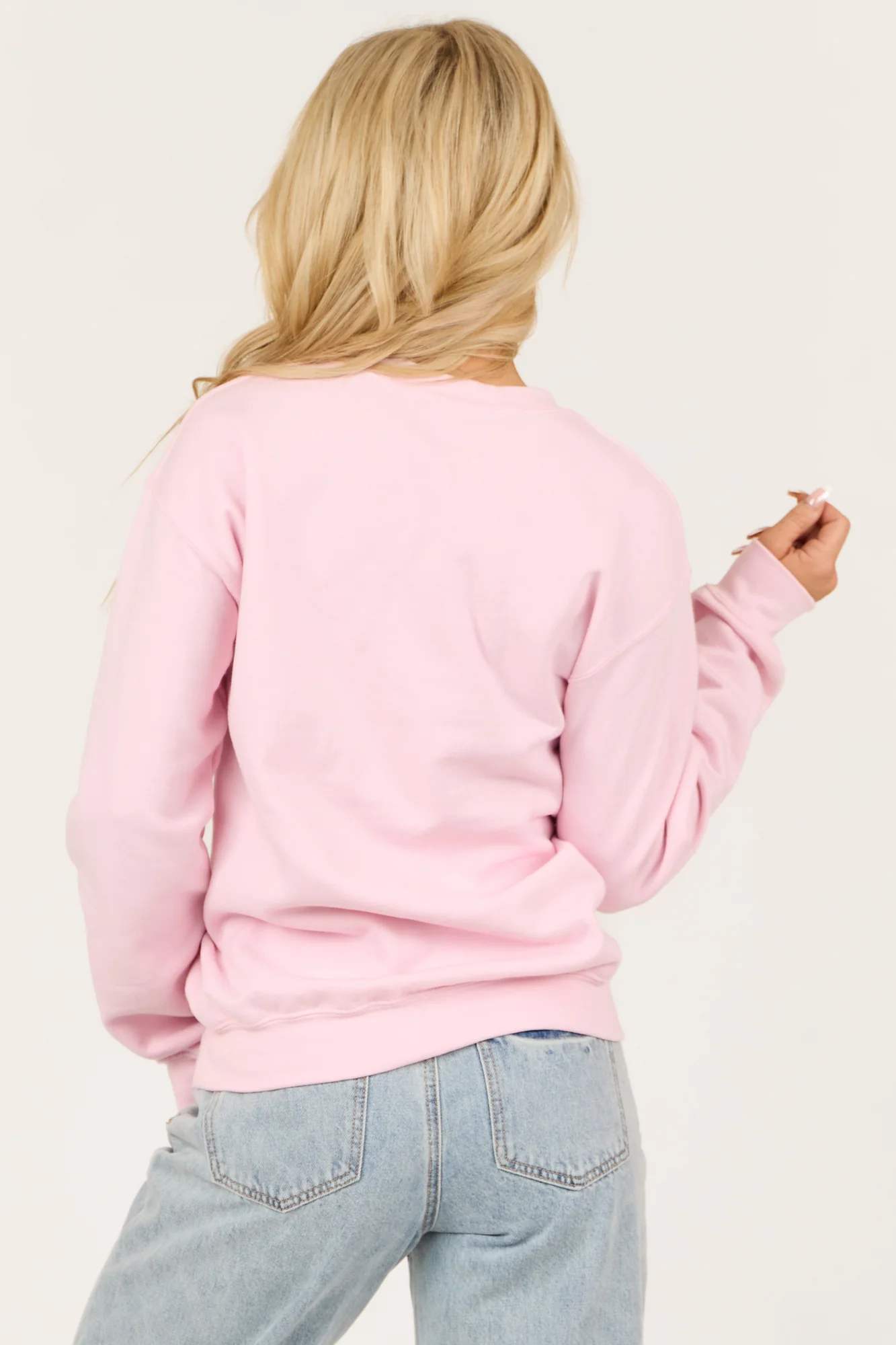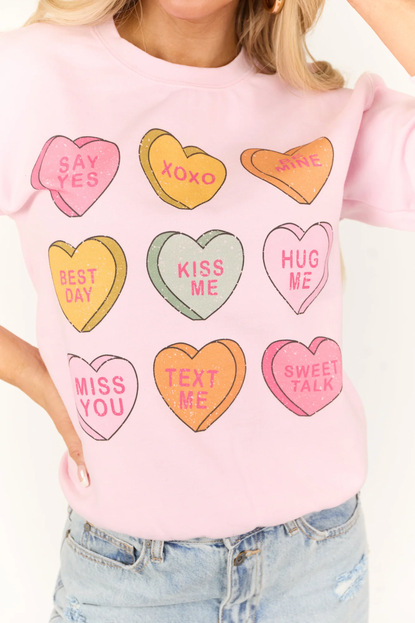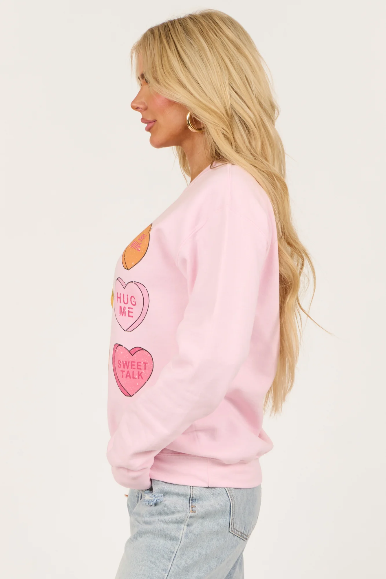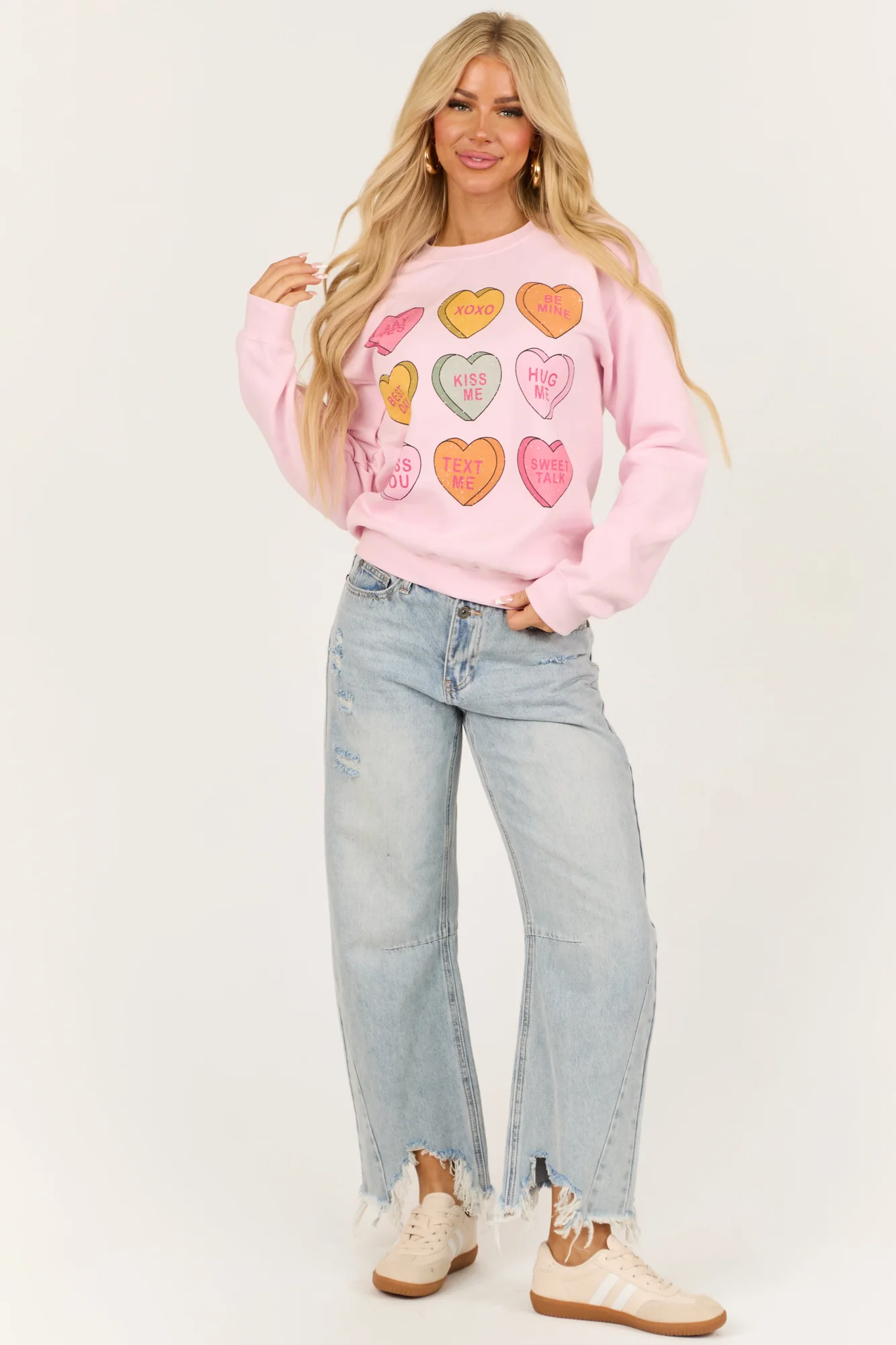 Indulge in sweetness with our Candy Hearts Graphic Crewneck Sweatshirt in Baby Pink. Crafted from a stretchy knit blend of 50% Polyester and 50% Cotton, this sweatshirt features a charming Candy Hearts Graphic in Bubblegum, Raspberry, Marigold, Mango, Juniper, and Baby Pink shades. With a cozy crew neckline, ribbed trim, long sleeves, drop shoulder, banded cuffs, and lengths available in 26″, 27″, and 28″, it offers both style and comfort. Perfect for casual outings and lounging. Washing instructions: Machine wash cold, use non-chlorine bleach, tumble dry low heat, avoid ironing and dry cleaning. Model is wearing size Small. Model Stats: Height 57″, Bust 34″, Waist 26″.