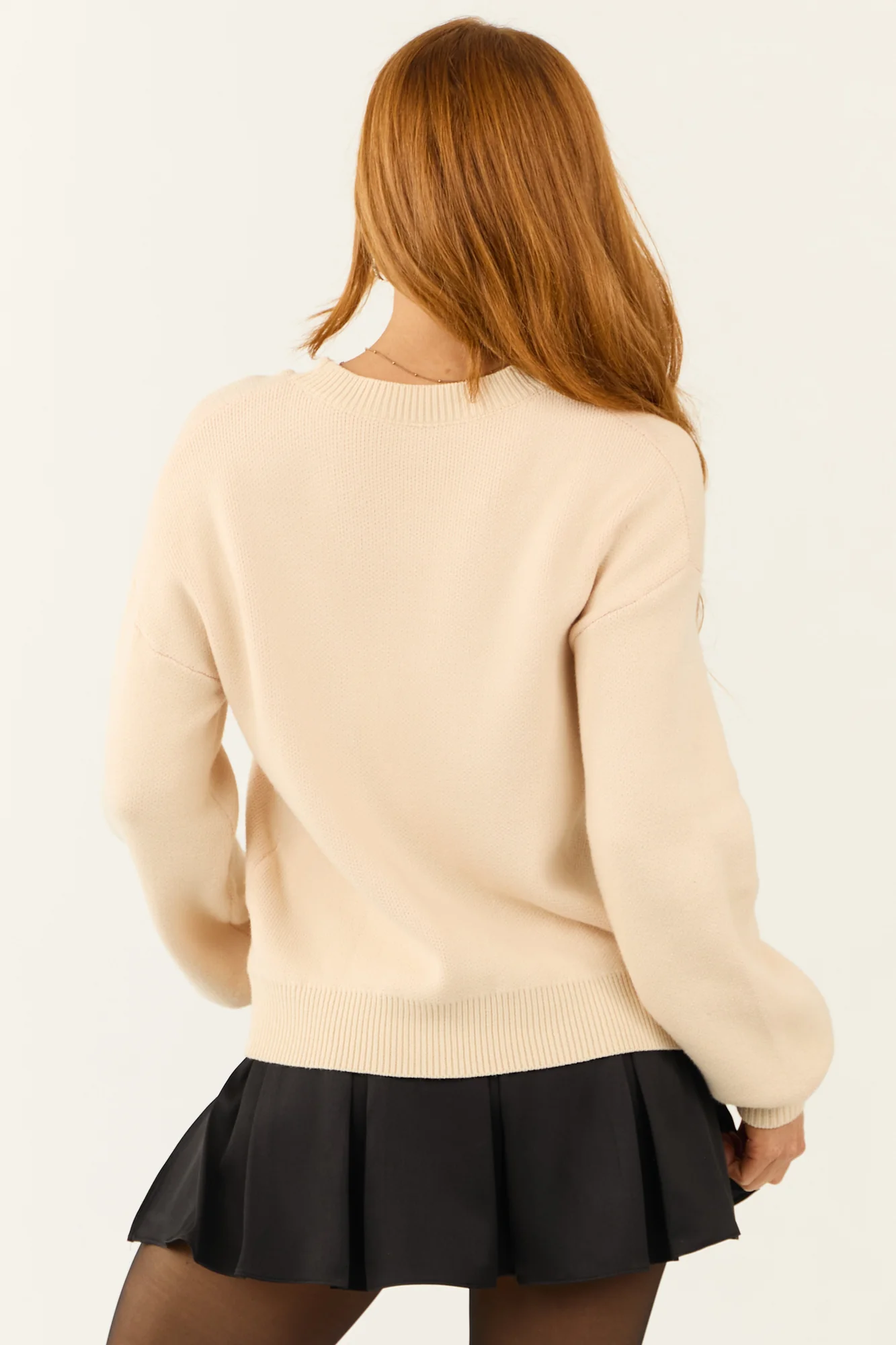 Indulge in cozy comfort with our Carnation Graphic Puff Sleeve Knit Sweater. Crafted from stretchy ribbed knit fabric, this sweater features a charming bow graphic in a delightful shade of carnation. The long sleeves, banded trim, and drop shoulder design exude a relaxed vibe, making it perfect for all-day wear. Made of 85% Acrylic and 15% Polyester for a soft feel. Available in sizes S, M, L, and XL. Line dry recommended. Upgrade your wardrobe with this stylish piece!Model wears size Small – Height: 55″, Bust: 31″, Waist: 24″