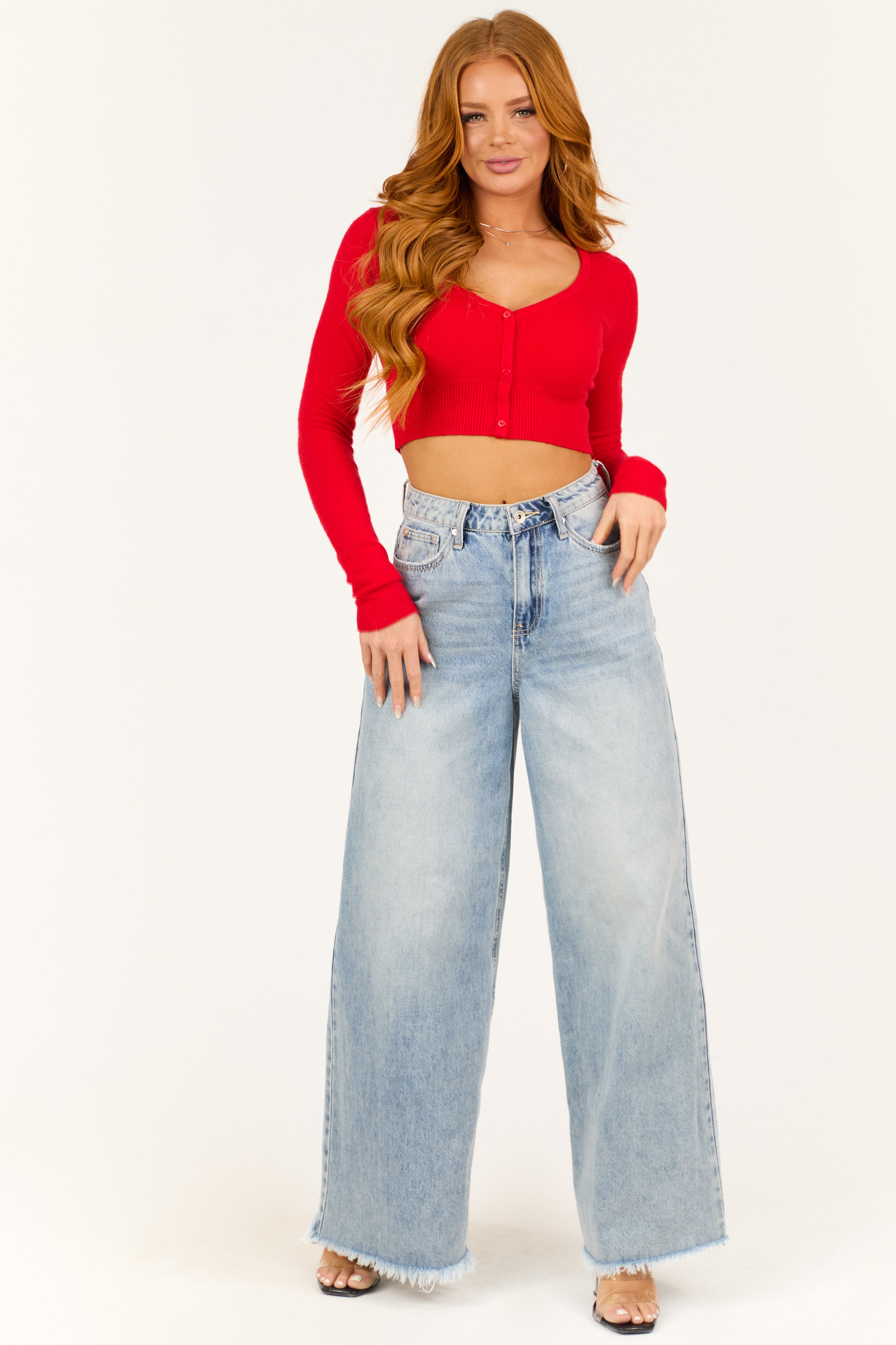 Indulge in luxury with our Cashmere V-Neck Cropped Top in bold red. Made from a stretchy knit blend of acrylic, polyester, nylon, and cashmere, this ultra-cropped top features a ribbed trim, long sleeves, and a chic V neckline. Stay stylish and comfortable all day long. Perfect for all occasions. Available in sizes S, M, and L. Imported. Care instructions: Hand wash cold, line dry. Model is wearing size Small. Model details: Size 1, Height 55″, Bust 33″, Waist 24″.