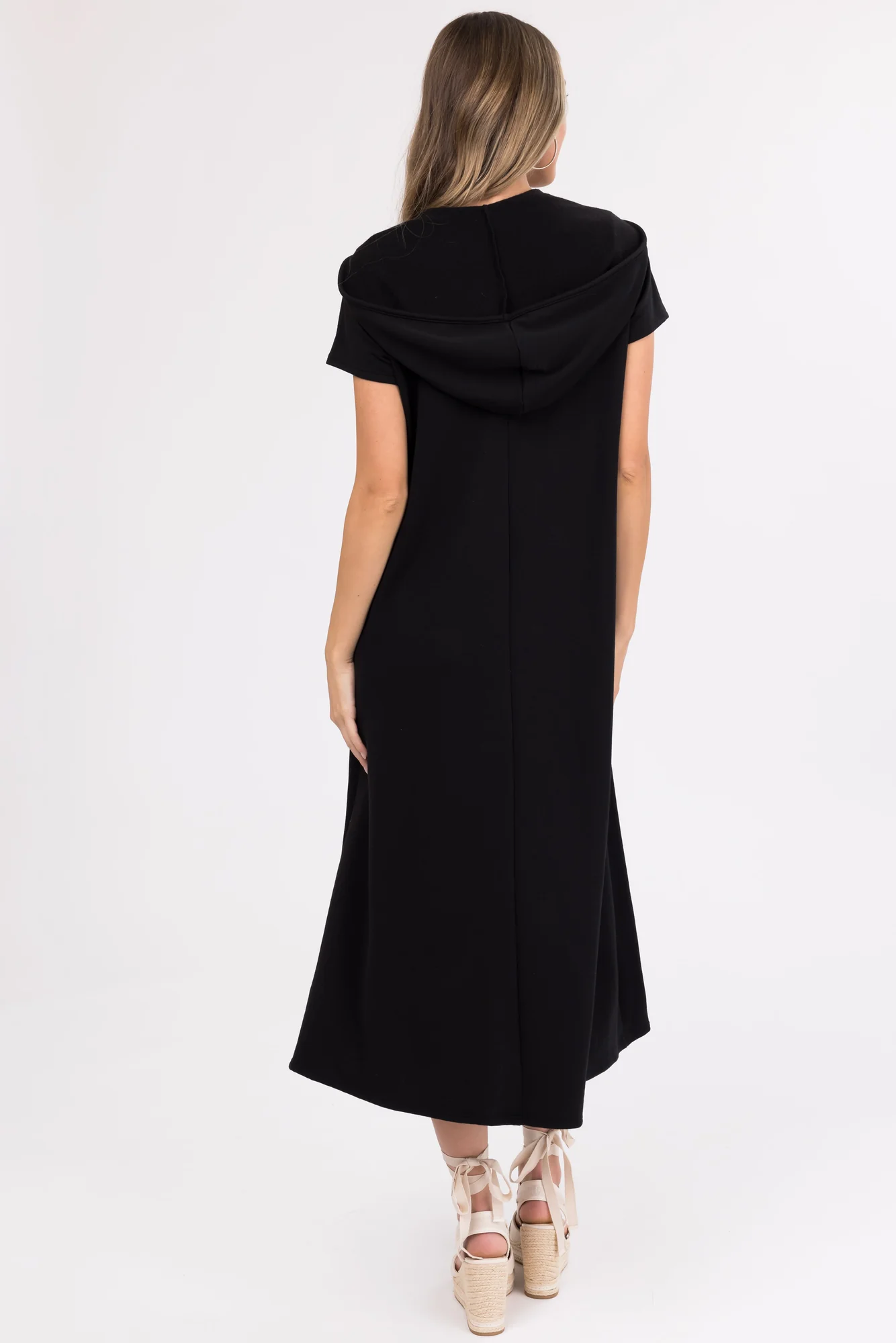 Experience comfort and style with our Black Oversized Casual Hooded Maxi Dress that comes in sizes Small, Medium, and Large. This dress features a loose fit, semi-stretchy knit fabric, a hooded V neckline, and convenient pockets. Made in the USA from 78% Polyester, 18% Rayon, and 4% Spandex, this dress is both fashionable and easy to care for. It suits a variety of occasions and matches true to size. Take your outfit to the next level with this elegant and versatile piece. Please note: Hand wash cold, do not bleach, hang or line dry. Model is wearing a size Small – Size 1, Height 58, Bust 32, Waist 25.
