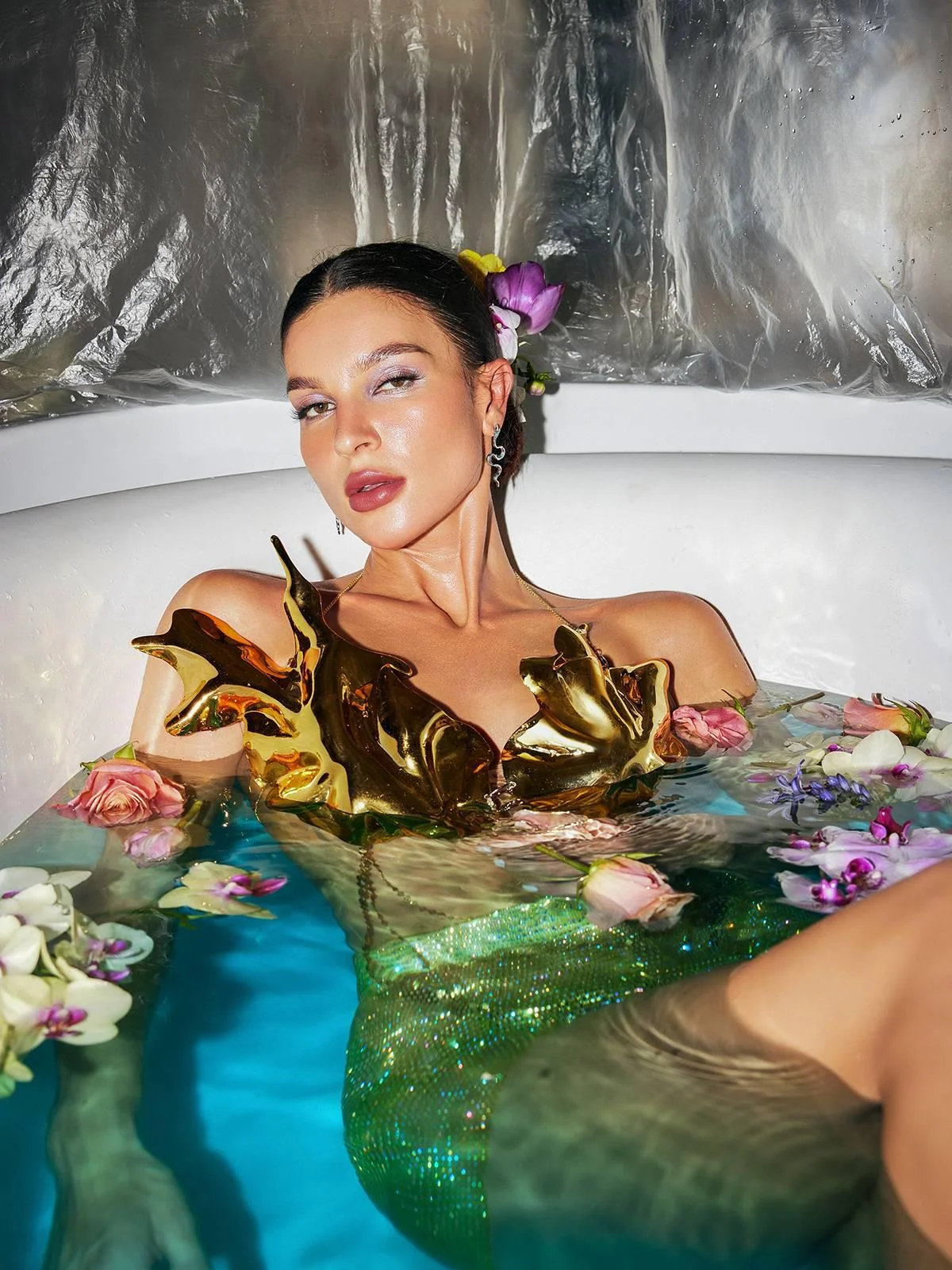 Tags: chain armor top, Edgy Fashion, High-Quality Materials, metallic leaf details, premium style