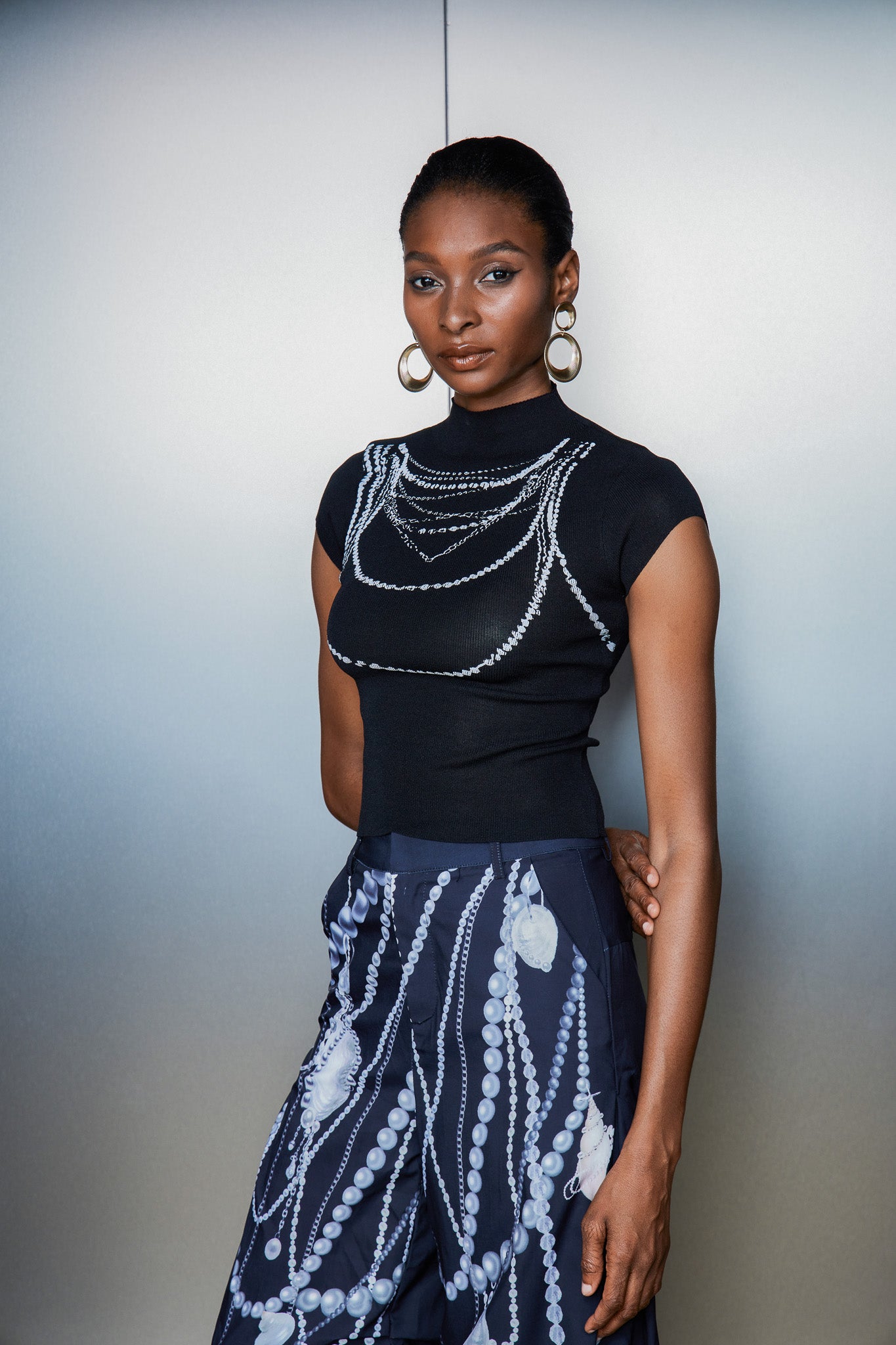 Elevate your style with the Chain Print Bodycon Black T-Shirt . This chic essential features a bold chain print design on a sleek, body-contouring silhouette. Crafted for comfort, this T-shirt is perfect for casual outings or adding a rebel edge to office wear. Made for urban fashionistas, this tee offers a statement look that seamlessly blends modern design with expert tailoring. Experience slight stretch and easy care with gentle machine wash. Color may vary due to lighting effects on images.