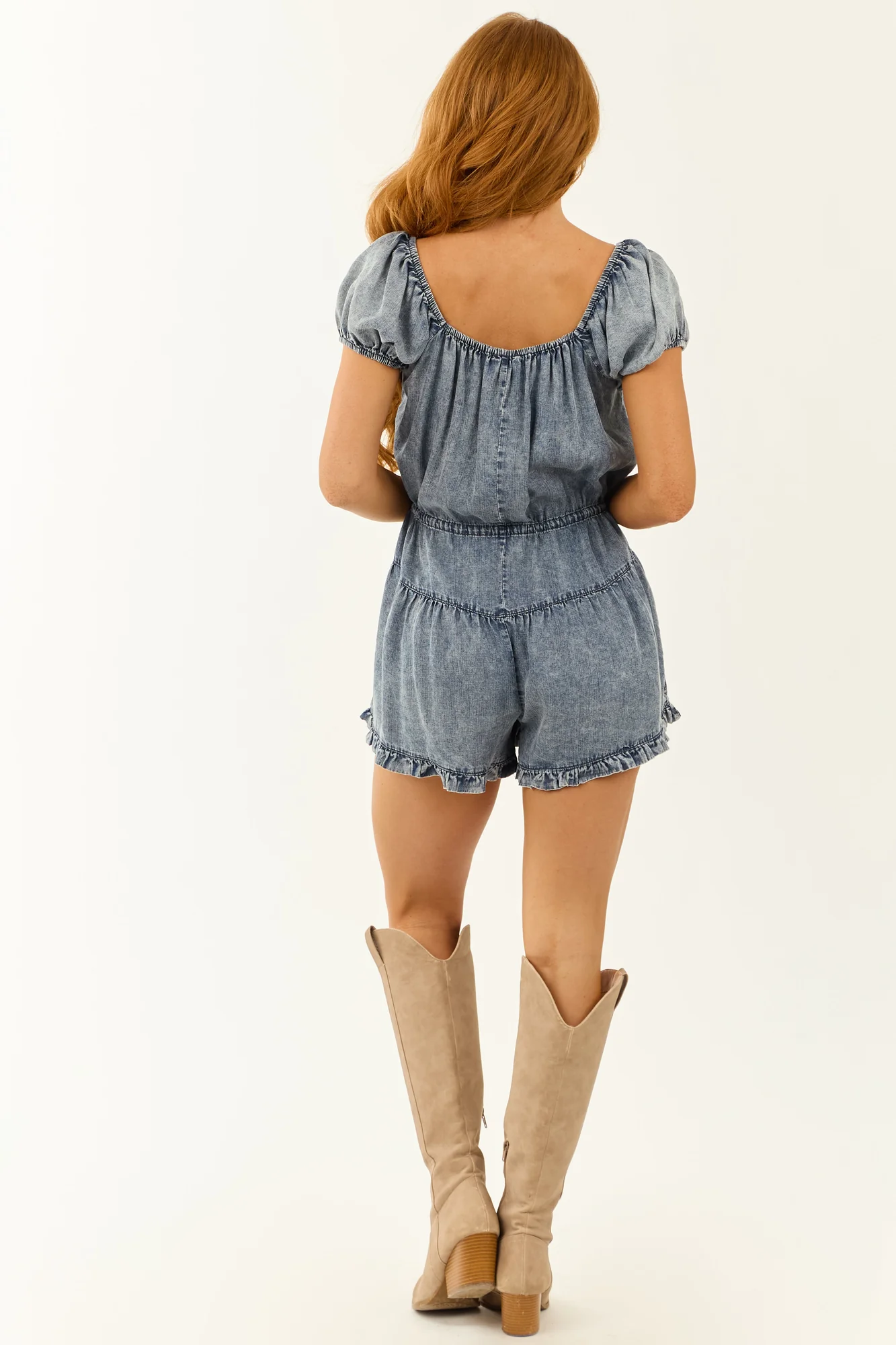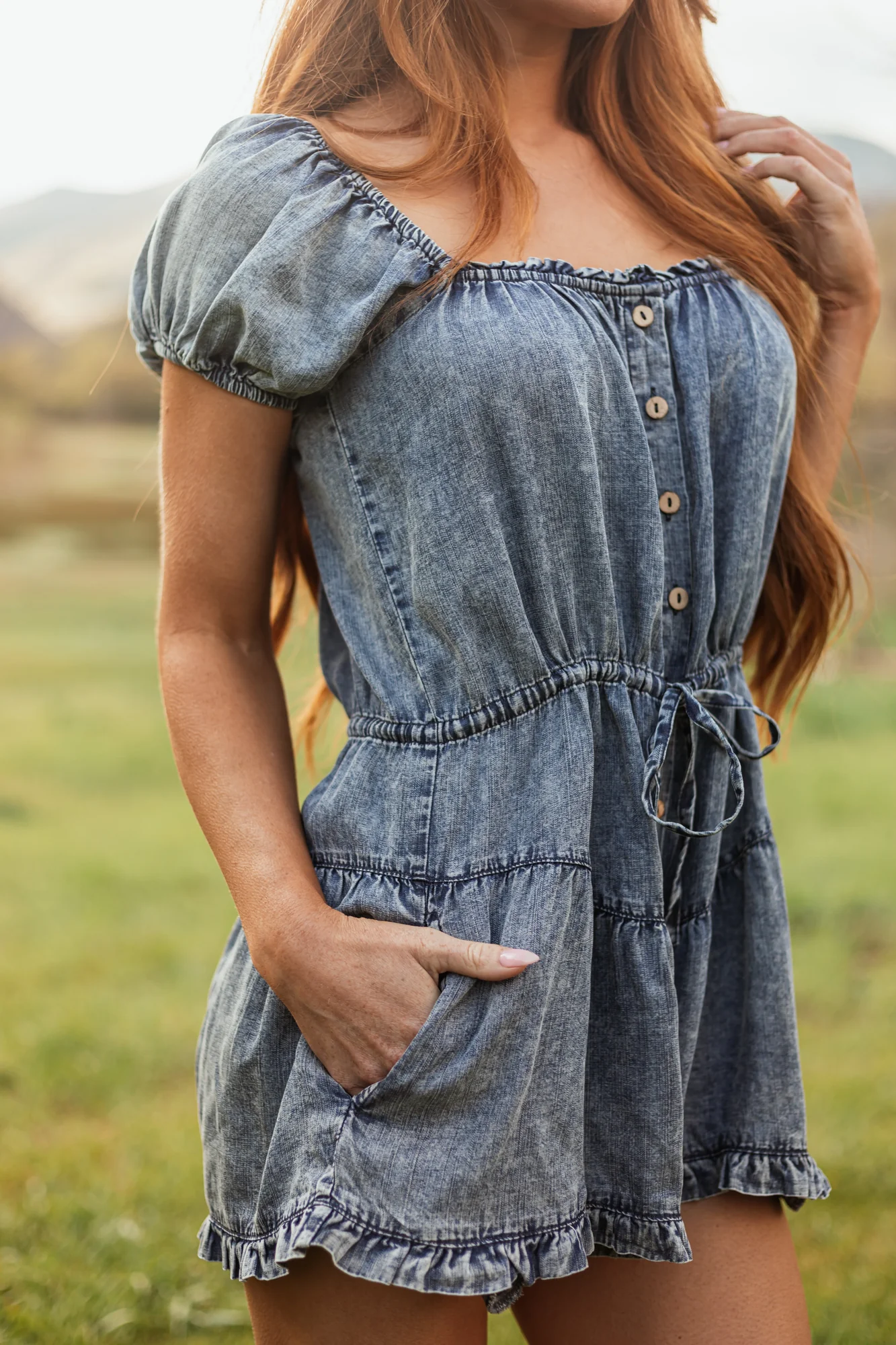 This lightweight chambray denim romper features puff sleeves, elastic cuffs, side pockets, and a flattering frill hem. Made of 100% Tencel for all-day comfort. Perfect for a casual day out, simply add sunnies and strappy sandals. This romper fits slightly loose with an adjustable cinching waist tie. Feel relaxed and stylish in this versatile piece. Size small measures: Bust 33-35″, Waist 39″, Torso Length 31″, Inseam 3″, Sleeve 7″. Model is wearing a size Small.