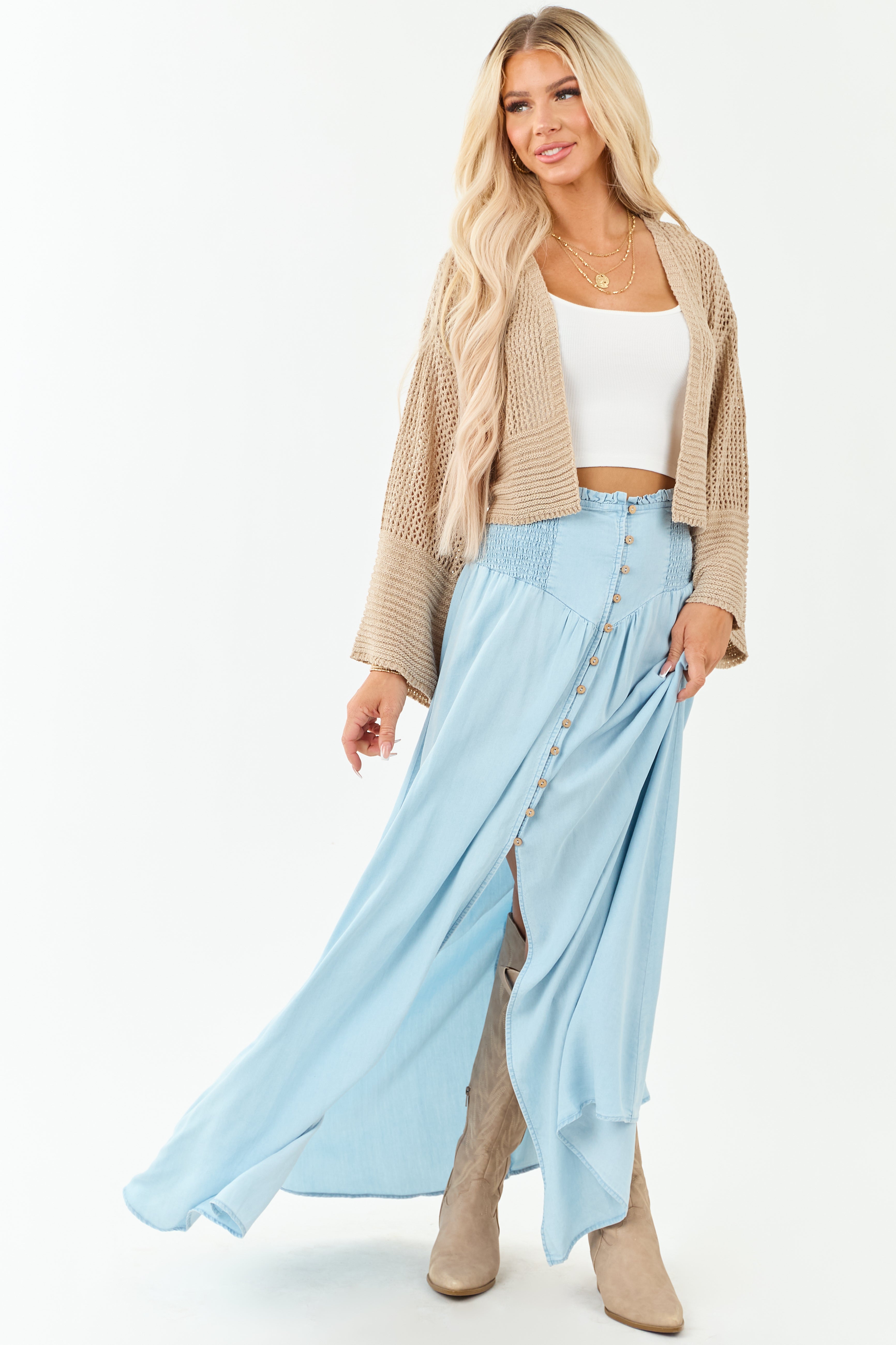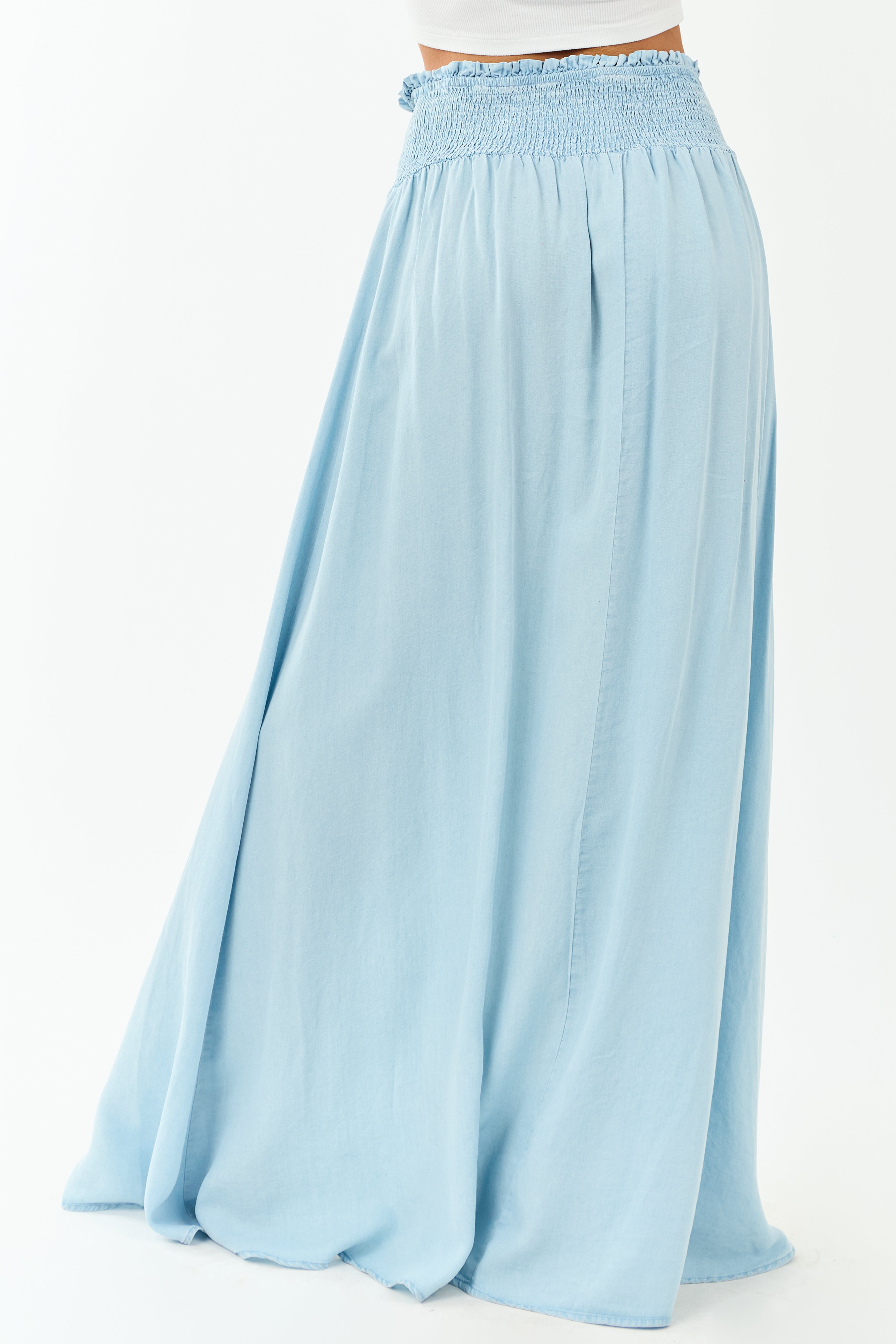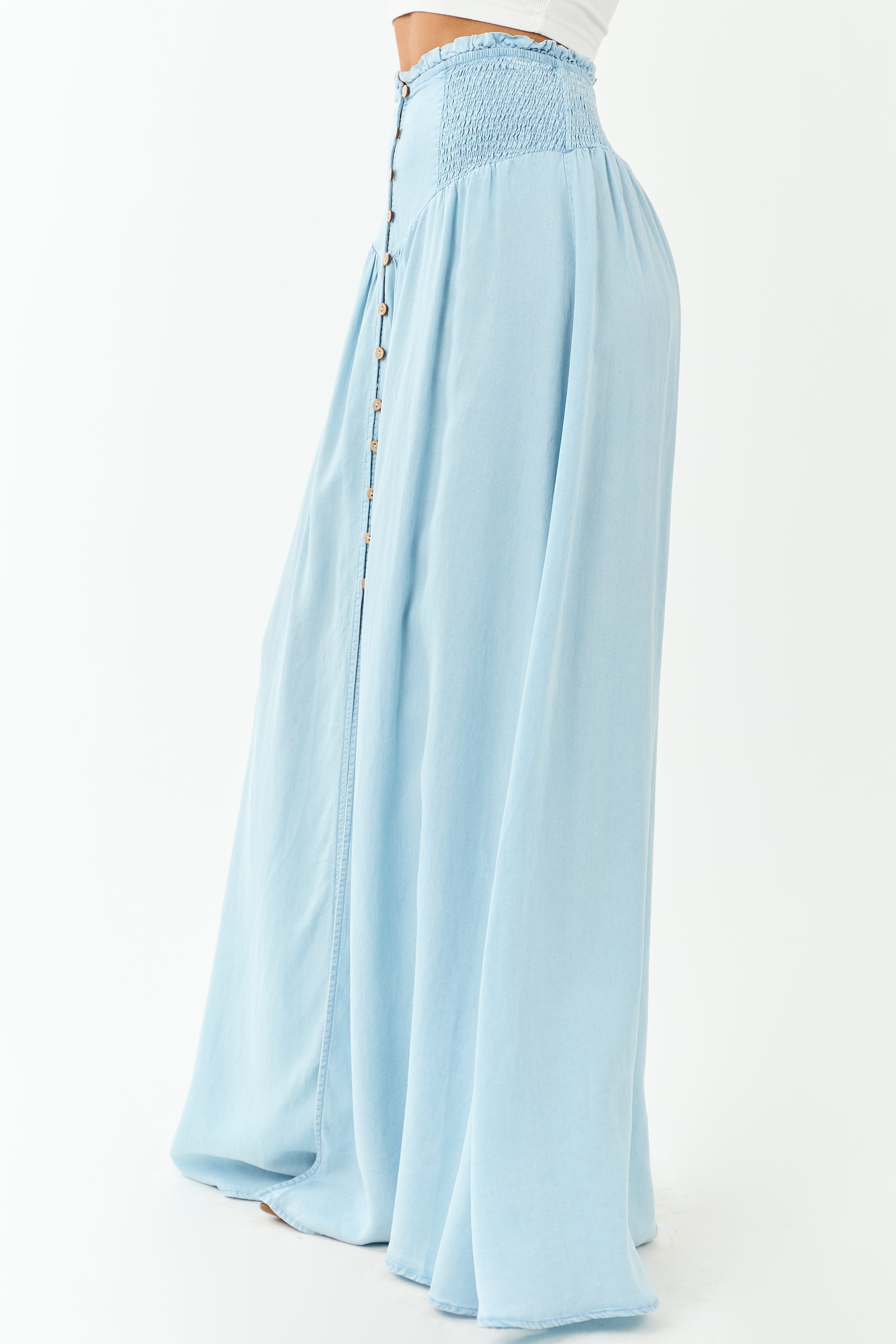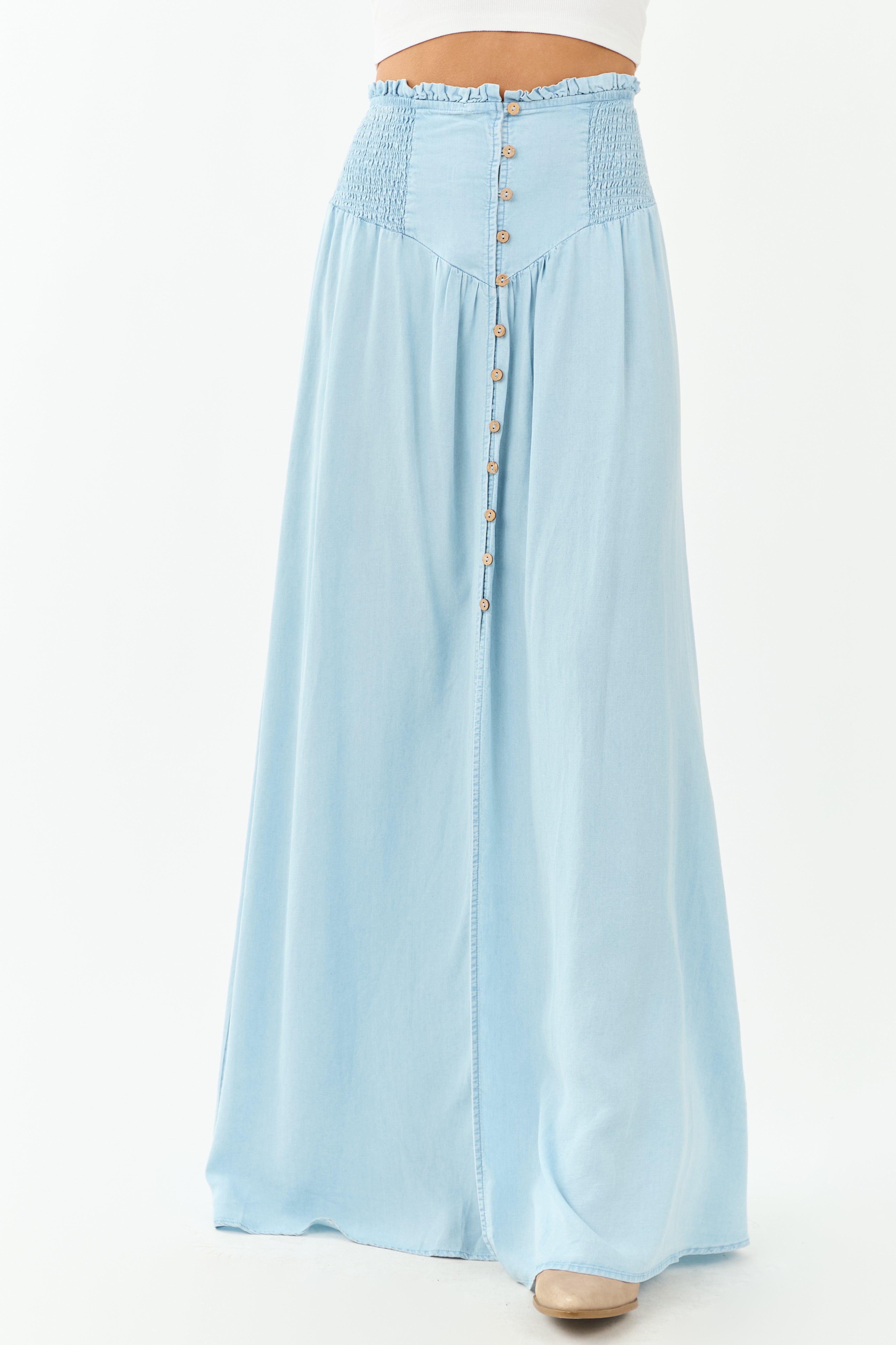 Elevate your beachside look with this chic chambray denim maxi skirt featuring a front slit design. Made of non-stretchy 100% Tencel with a smocked waistband for comfort. Perfect for pairing with crochet tops and fringe accessories for barefoot adventures. This button-down skirt is unlined and offers a relaxed fit. Available sizes: S, M, L. Waist options: 28-29″, 29-30″, 30-31″. Length: 45″, 45.5″, 46″. Update your summer wardrobe with this stylish skirt. Model is 57″ tall, wearing size Small.