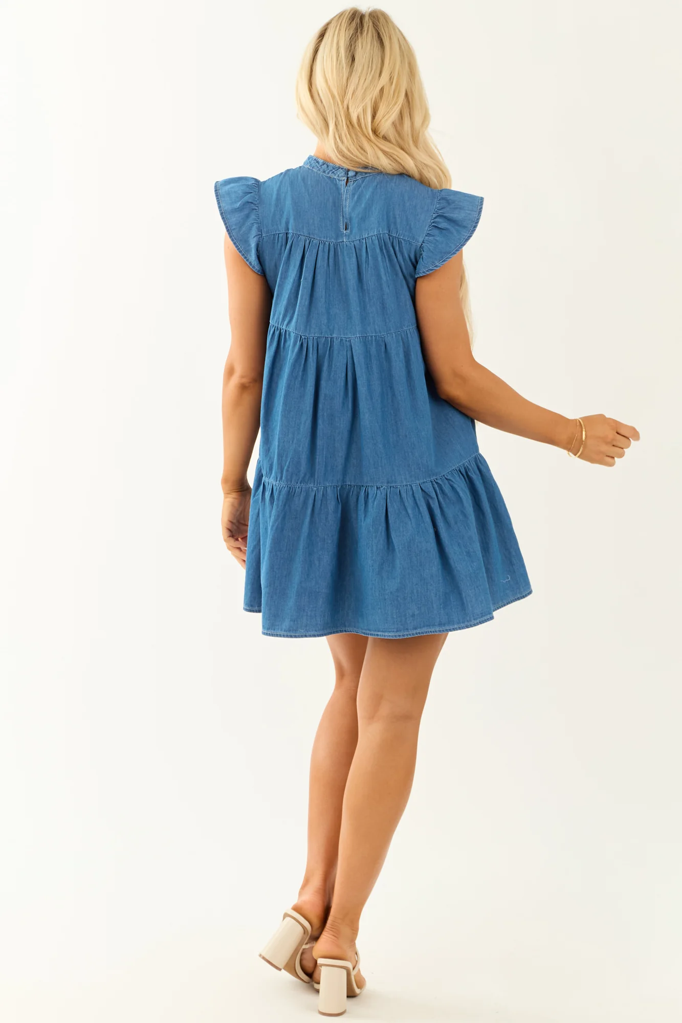 This lightweight chambray mini dress is versatile and comfortable, featuring ruffle short sleeves, pleated yoke, and side pockets. Perfect for a casual day out, this dress is made of non-stretchy chambray denim and comes in varying sizes (S, M, L). Unlined and tiered for a unique look. Get yours today!