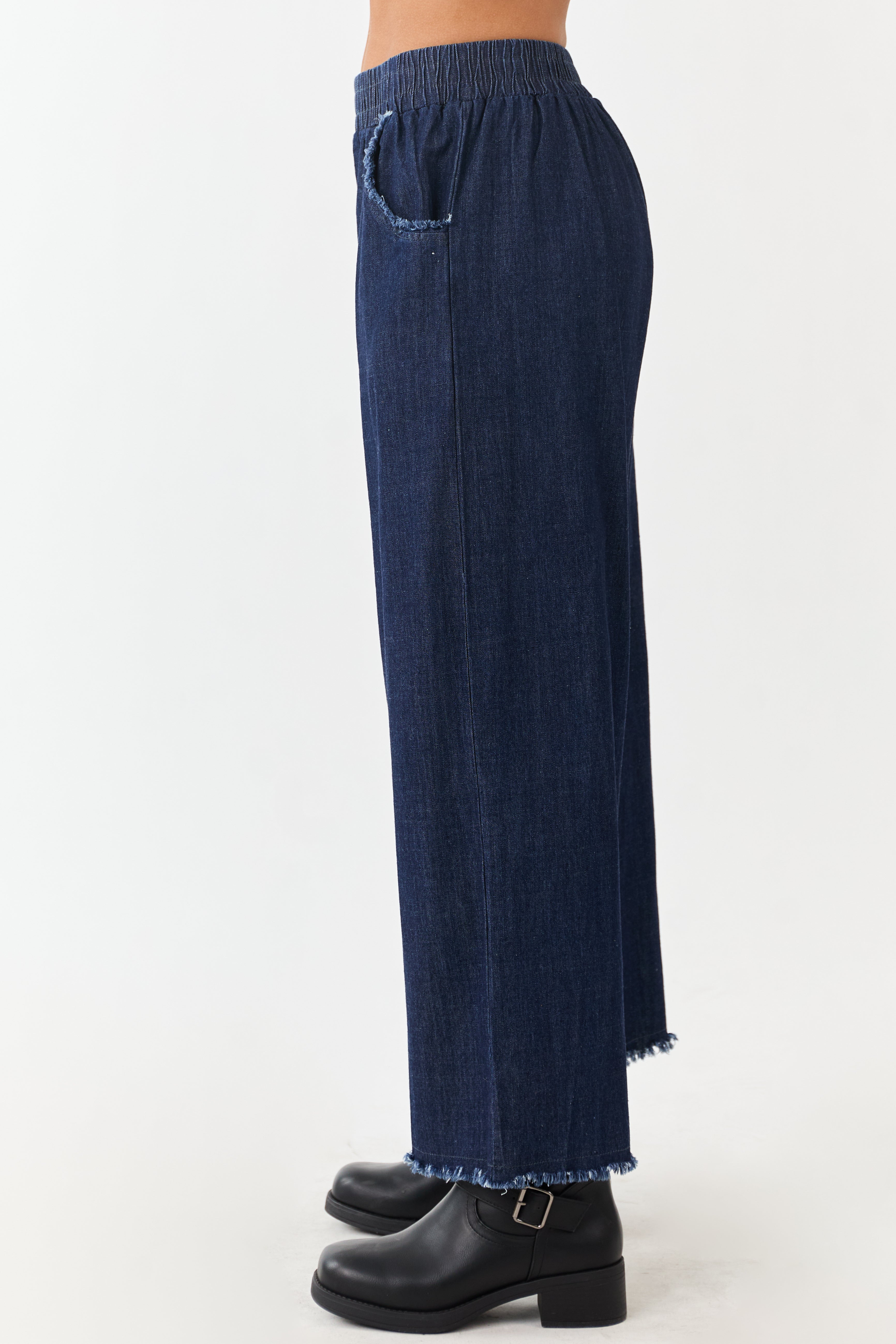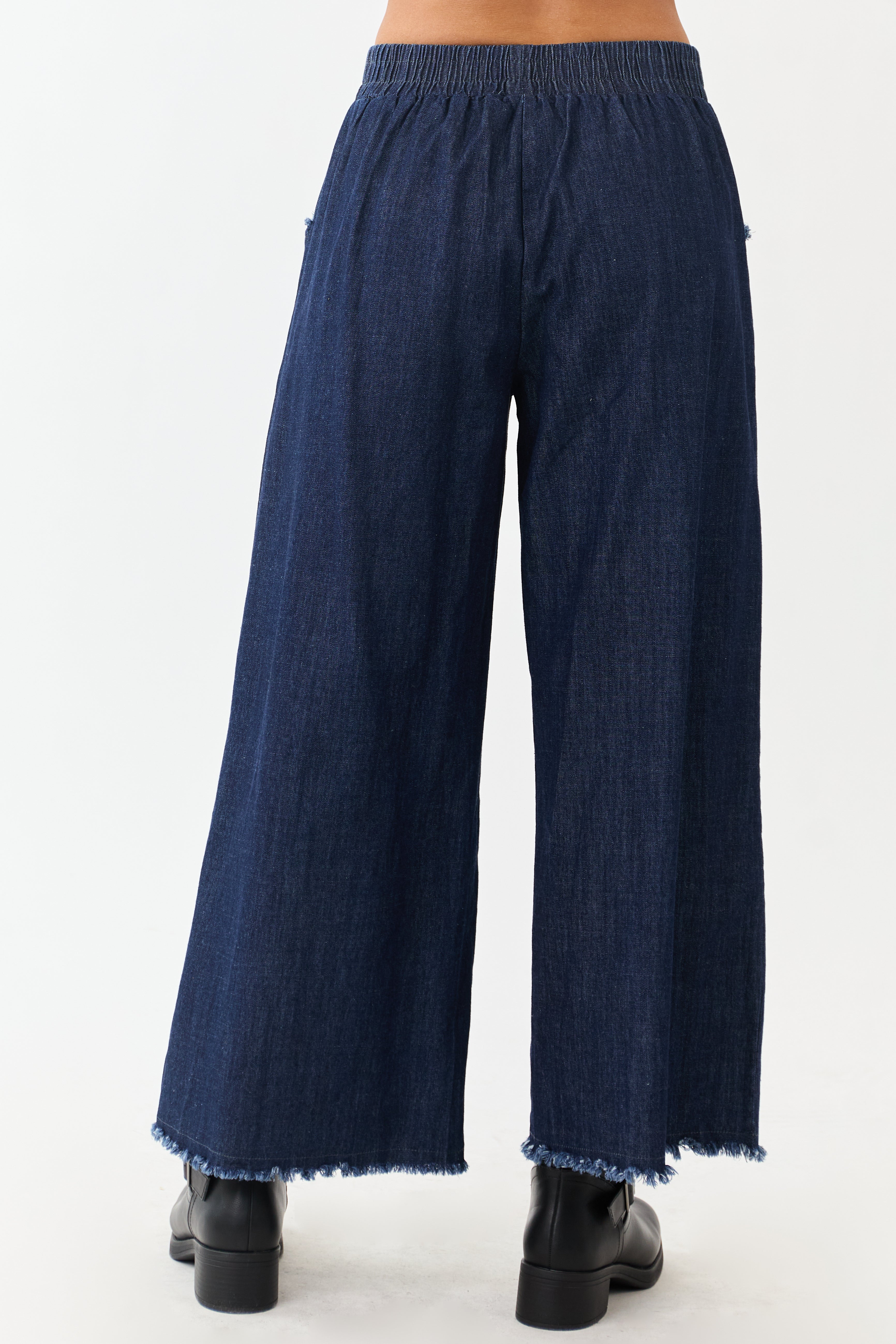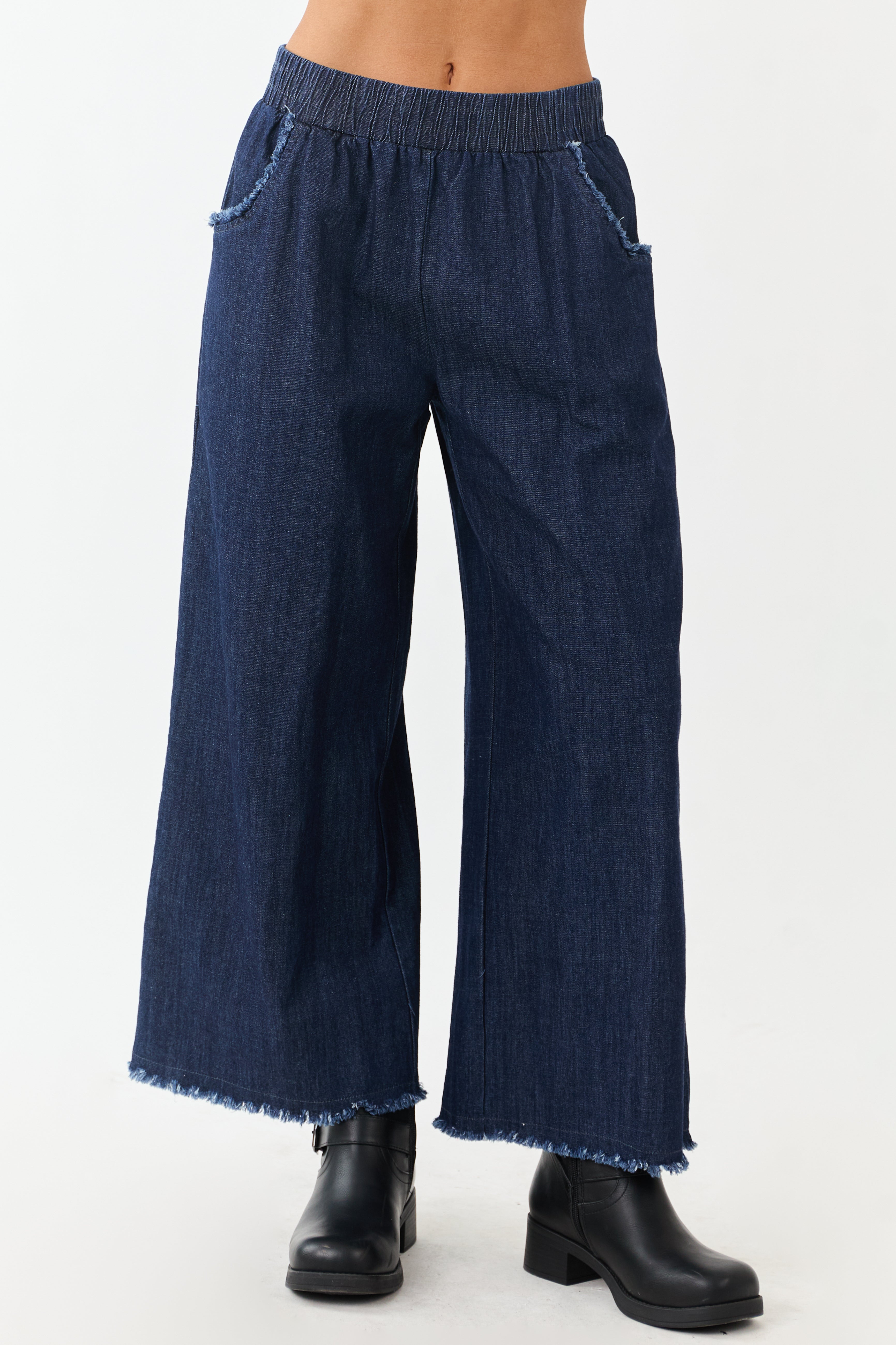 Experience unmatched comfort and style with our Dark Wash Chambray Wide Leg Cropped Pants. Crafted from lightweight denim, these pants feature a wide leg cut, elastic waistband, frayed pockets, and a high-waisted design for a trendy look. Perfect for casual outings or dressy occasions. Imported. Model is 57″ and wears a size Small. Enhance your wardrobe with these versatile bottoms today!