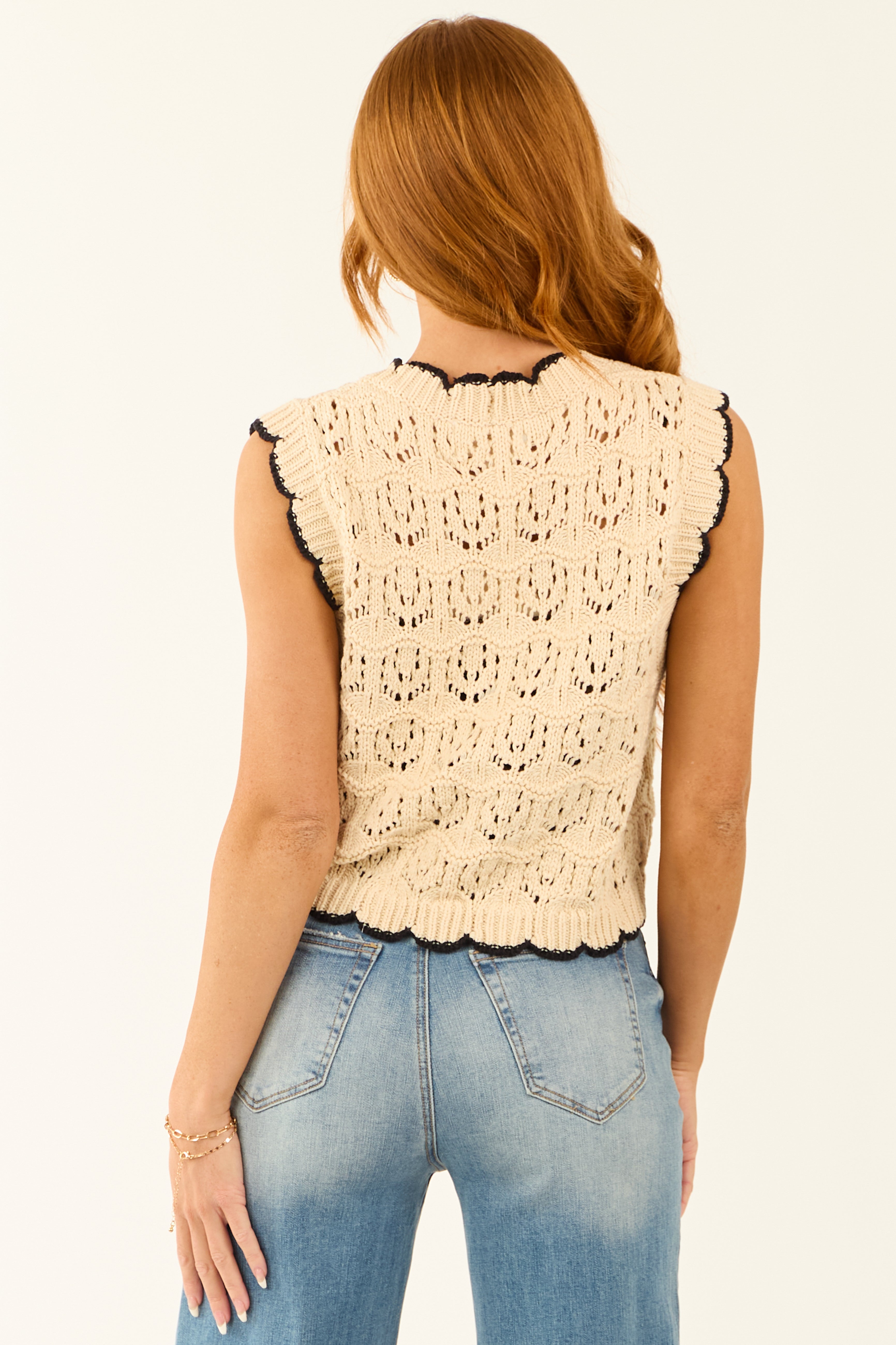 This elegant Champagne Crochet Knit Vest with Double Tie Detail comes in sizes S, M, and L. The stretchy knit fabric with black trim offers a stylish fit with a slightly cropped length and scalloped hem, perfect for any occasion. Made of 60% Cotton and 40% Acrylic, this vest is comfortable and versatile. Hand wash cold for easy care. Model is wearing a size Small.