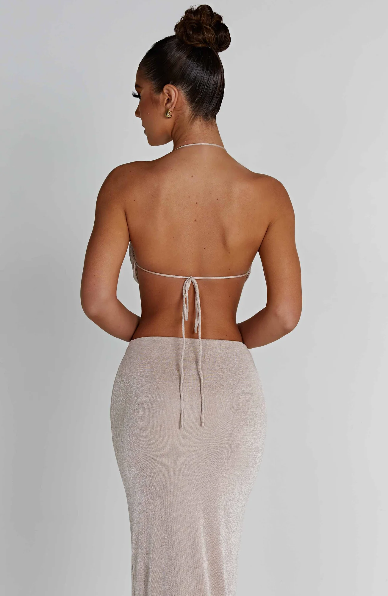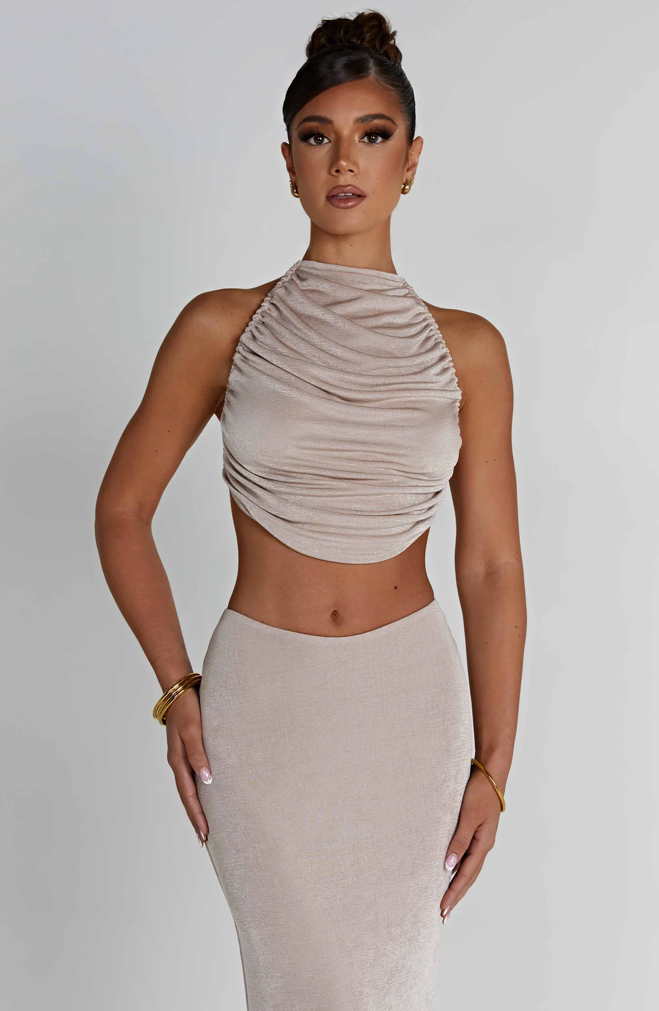 Indulge in the allure of the Champagne Draped High Neck Crop Top from DIA. Crafted in premium high shine jersey, this backless top features a tie fastening, high neck, and body-hugging fit. The alluring draped design adds a touch of sophistication. Pair with the matching skirt for a complete ensemble. Ideal for special occasions or nights out. Available in sizes XS to XXL.