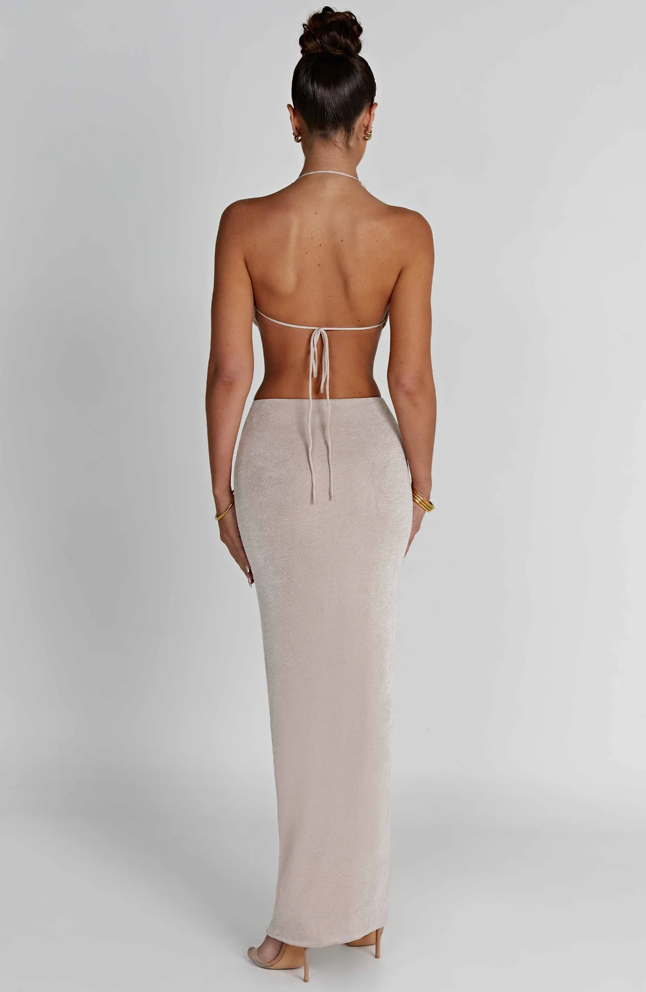 Indulge in the enchanting glow of the Champagne High Shine Maxi Skirt by DIA. Crafted from premium jersey fabric with a stunning sheen, this skirt offers a flattering body-hugging silhouette. Featuring a trendy low waist design, maxi length, and a sleek knot paired with the Fifi top, its perfect for all occasions. Model is wearing size XS. Elevate your style with this exquisite piece.