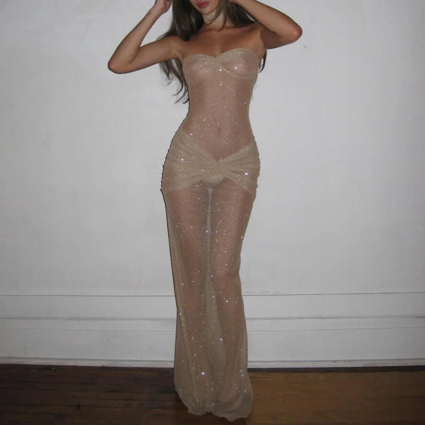 Elevate your wardrobe with this exquisite champagne mesh maxi dress, designed to make a statement at any special occasion. Crafted from high-quality fabric infused with glitter, this strapless dress features a sweetheart neckline, ruched detailing, and a floor-length skirt for a graceful and dramatic flair. The flattering silhouette accentuates your natural shape, while the invisible back zipper ensures a seamless look. Ideal for formal events or evening gatherings, this dress combines style and comfort effortlessly. Dry clean only. Made of nylon, spandex, and polyester for durability and luxury. Get a perfect fit with our complimentary replacement or local tailoring assistance. Discover more fashion inspiration on Instagram for chic looks.
