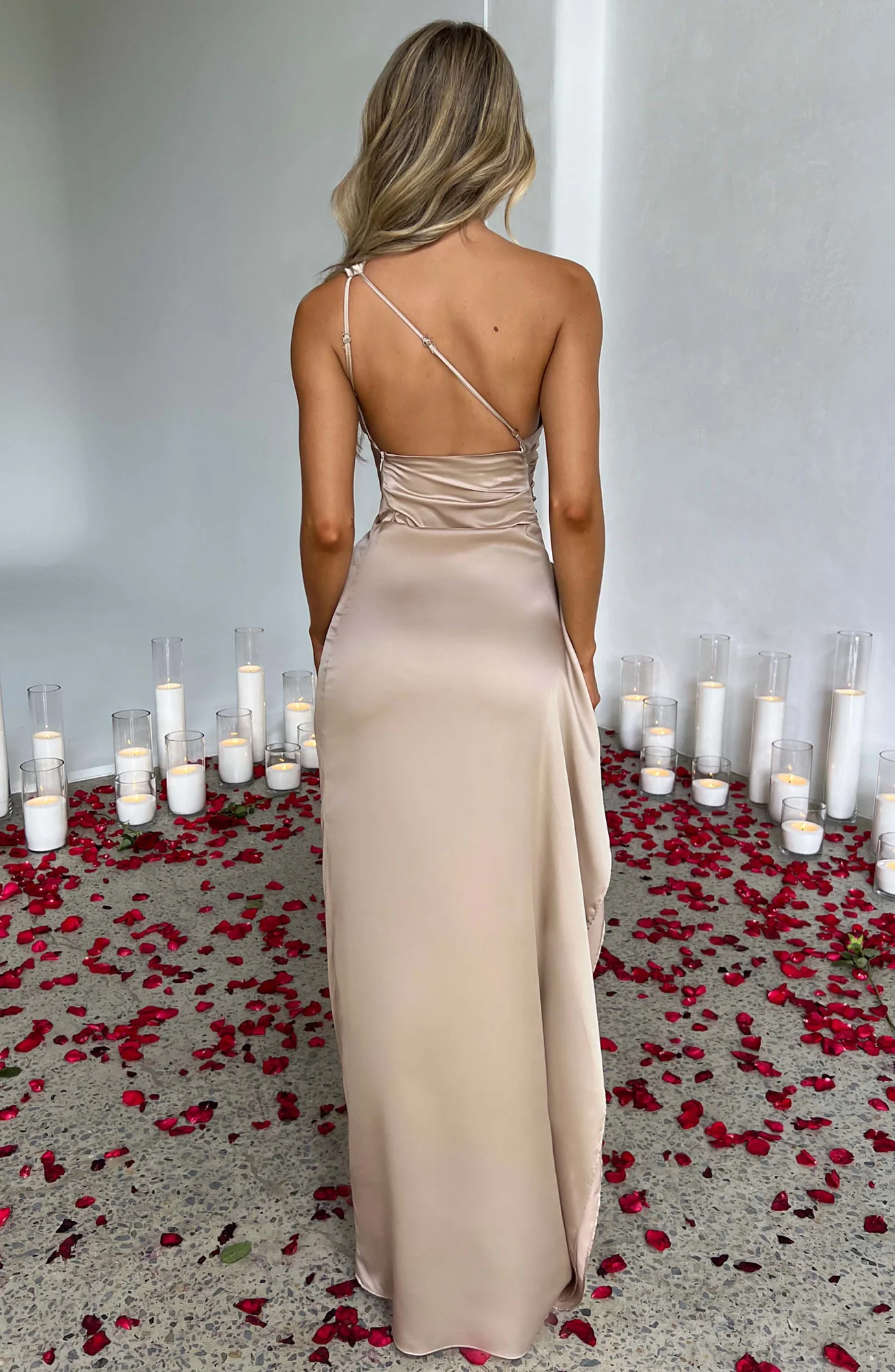 Elevate your style with the Champagne one-shoulder maxi dress, Ariel. Crafted from premium lightweight satin, this gown offers a body-hugging fit with draped detailing and a sultry thigh-high split. Perfect for weddings, parties, or any special occasion. Available in sizes XS to XXL.