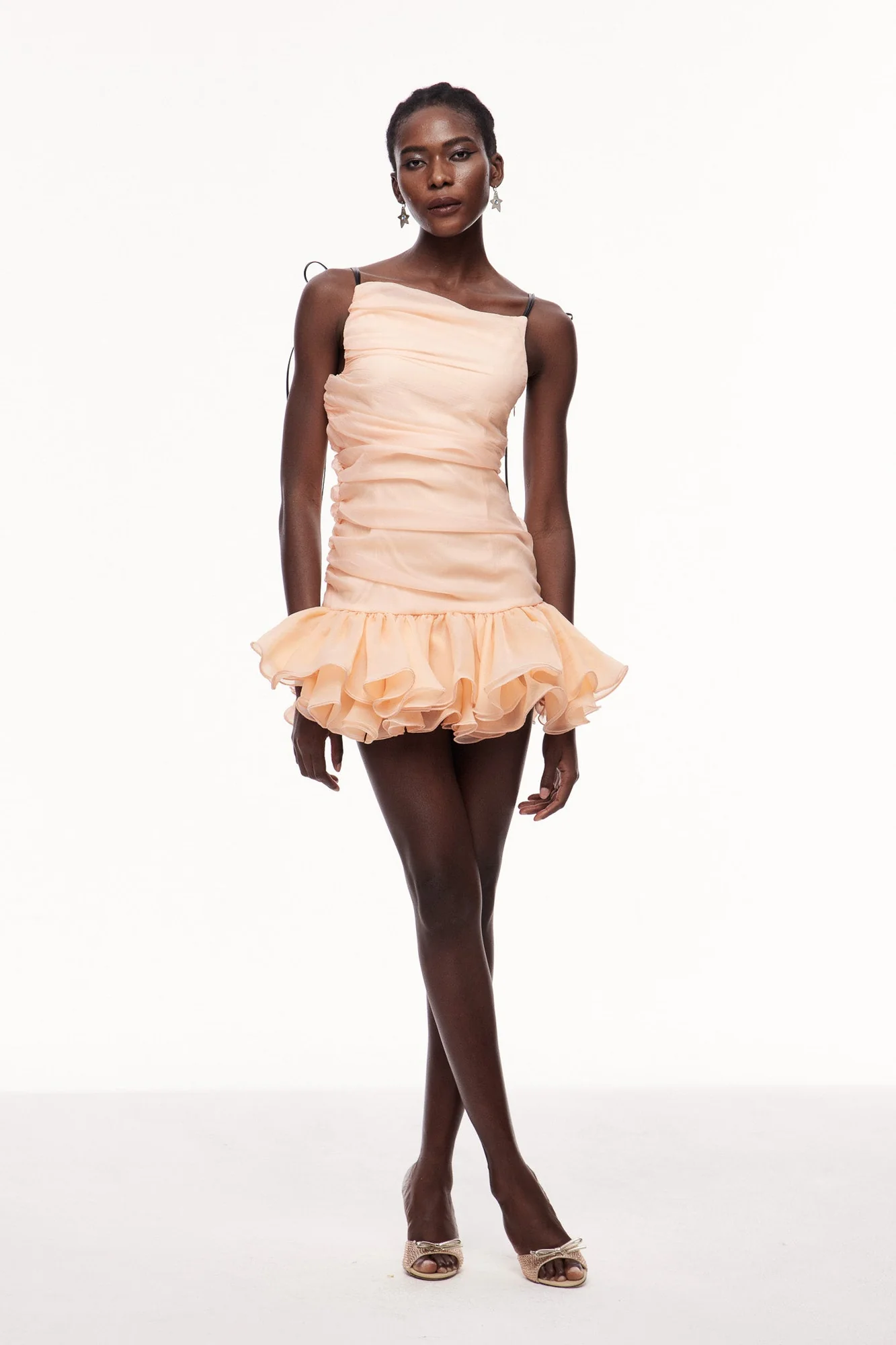 Indulge in the sophistication of the Champagne Ruched Ruffle Mini Dress, featuring a blend of elegant ruching and delicate ruffle details that create a flattering silhouette. This dress offers a modern and youthful appeal with its mini length, perfect for any daytime or evening occasion. Designed for both comfort and style, this playful yet sophisticated dress is a must-have in every wardrobe. The non-stretch fabric allows for ease of movement. Clean and maintain by indulging in a gentle machine wash. Please note that colors may vary due to lighting during photography.