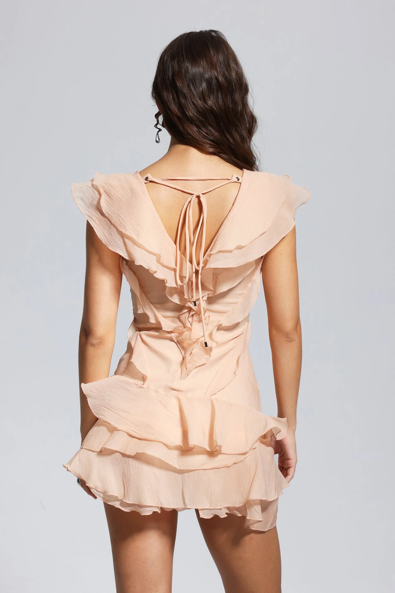 Elevate your wardrobe with our expertly crafted champagne ruffle asymmetric mini dress. This sophisticated piece features a flattering V-neckline, elegant ruffled details, and a stylish asymmetric hemline. Made from 100% Polyester with slight stretch for comfort. Ideal for special occasions where you want to exude timeless grace and romantic coquette charm. Please note that the color may vary slightly due to lighting differences in images. Stay chic with ease – gentle machine wash.