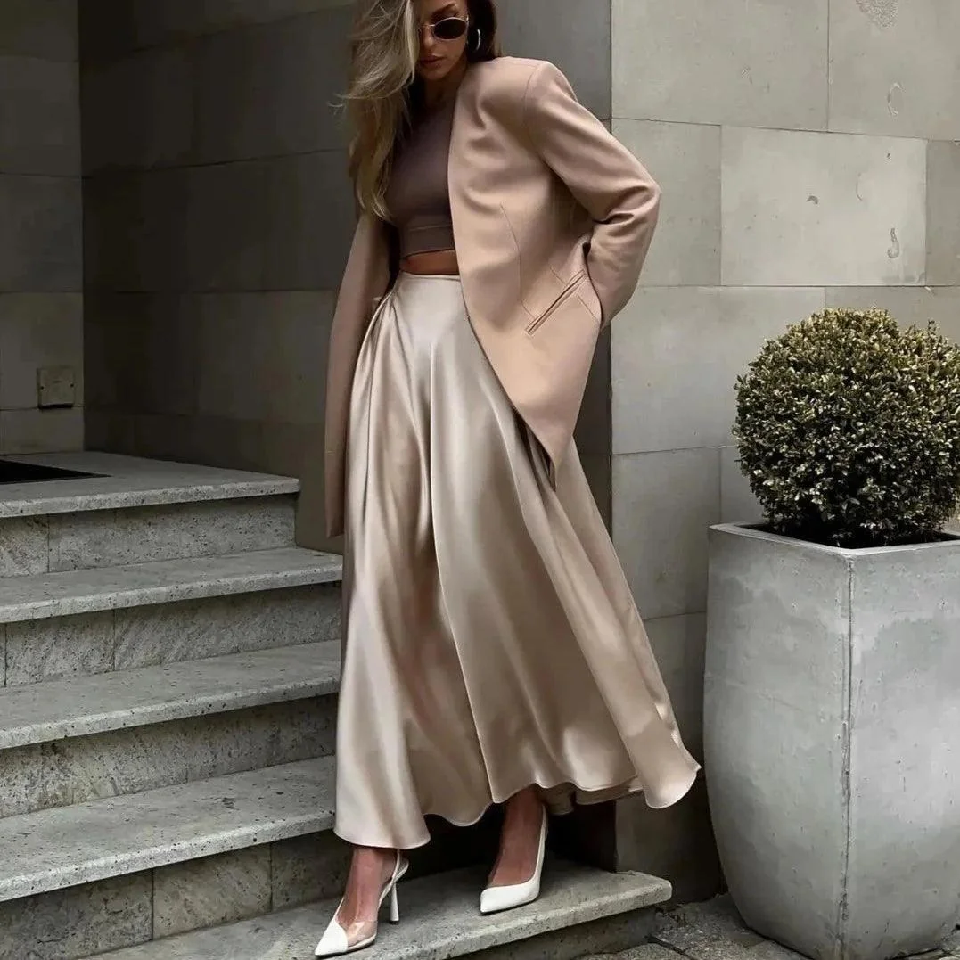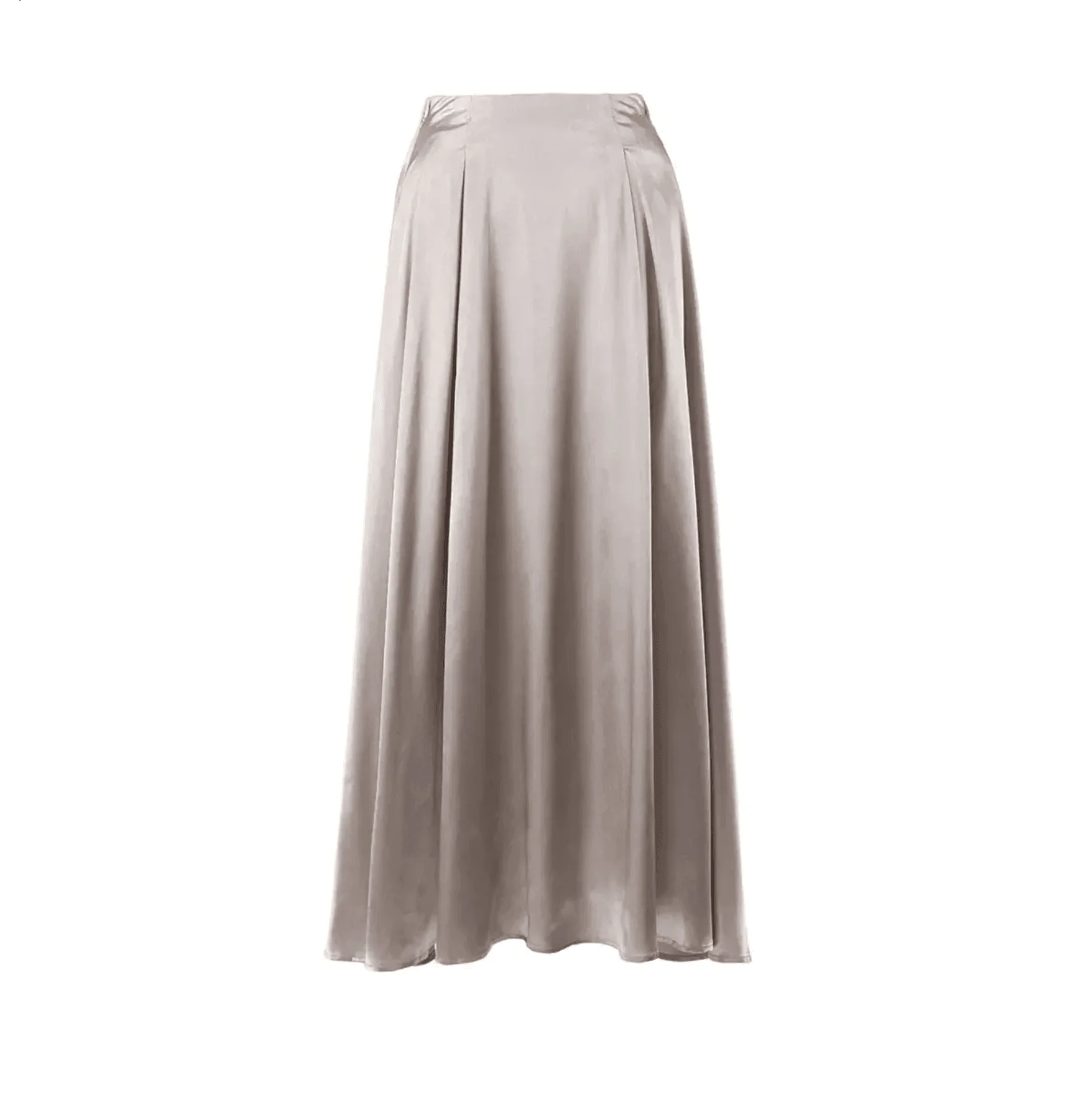 Elevate your wardrobe with our Champagne Satin Maxi Skirt featuring a luxurious shimmering satin fabric that gracefully flows with each step. The high waist flatters your figure while the flowing silhouette exudes elegance. Designed with a subtle side slit for a touch of allure, this skirt is available in multiple colors for all occasions. Stay comfortable all day in its breathable material. Dress up for dinner parties or daytime events with this chic and polished skirt. Pairs perfectly with fitted tops or relaxed blouses to showcase your unique style. For size exchanges, contact us for a hassle-free experience.