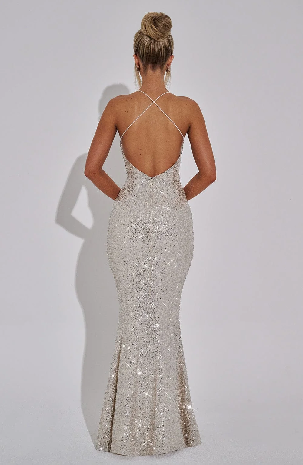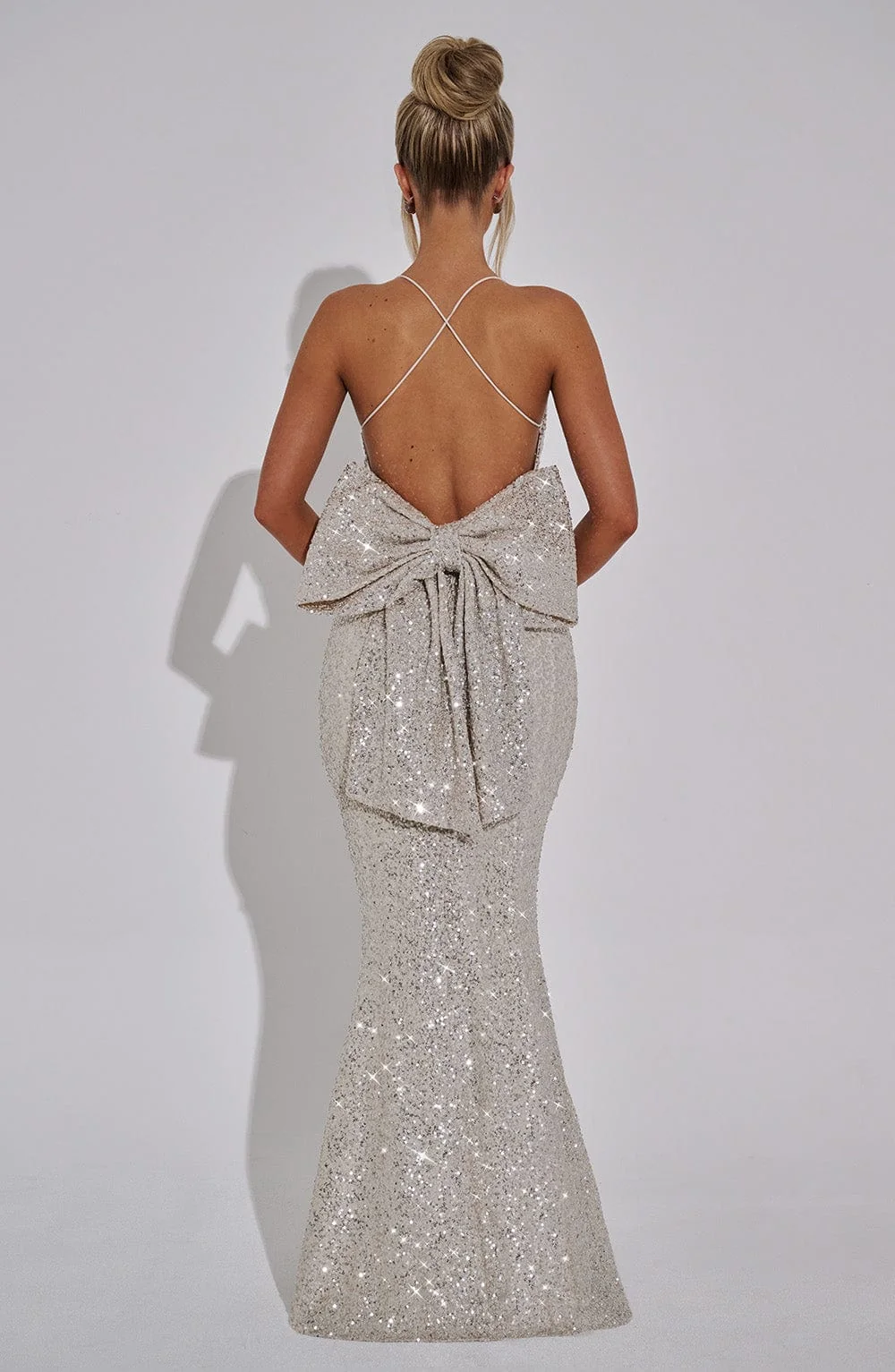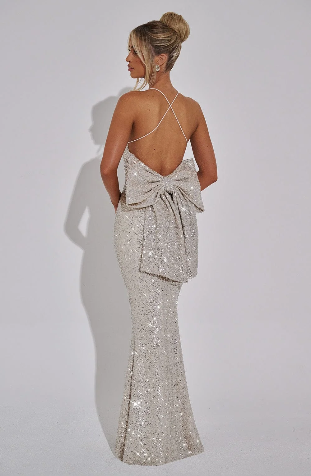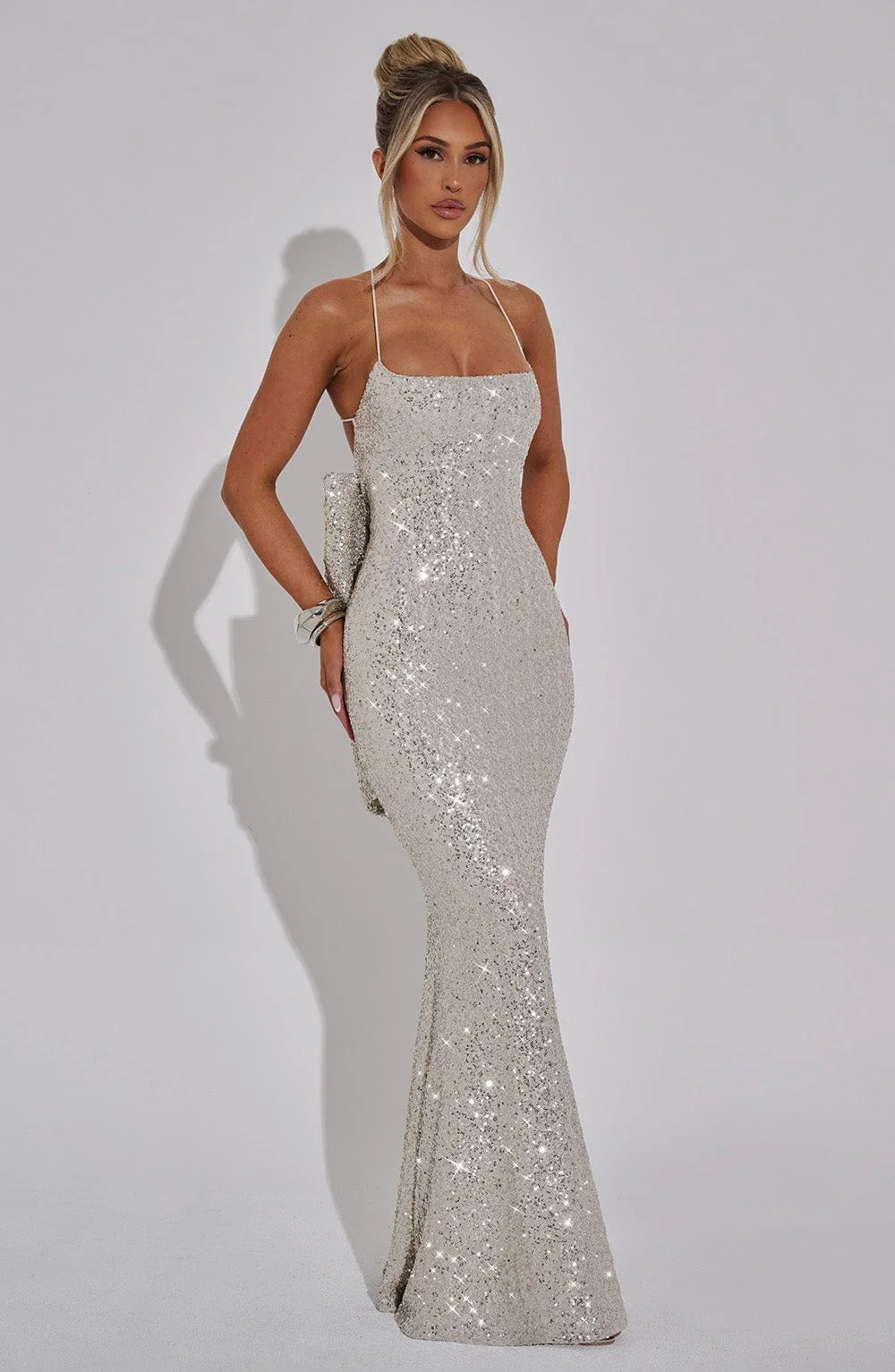 Elevate your look with our Champagne Sequin Fit Flare Maxi Dress. This stunning gown features luxury textured sequin fabric that contours your body beautifully. The fit and flare silhouette adds graceful movement, while the elasticated spaghetti straps and scoop neckline ensure both style and comfort. Complete with a detachable bow for a touch of whimsy. Ideal for special occasions, weddings, proms, and evening events. Color: Champagne. Material: Luxury Textured Sequin. Style: Fit and Flare. Features: Elasticated Spaghetti Straps, Detachable Bow, Invisible Zipper Fastening. Length: Maxi.