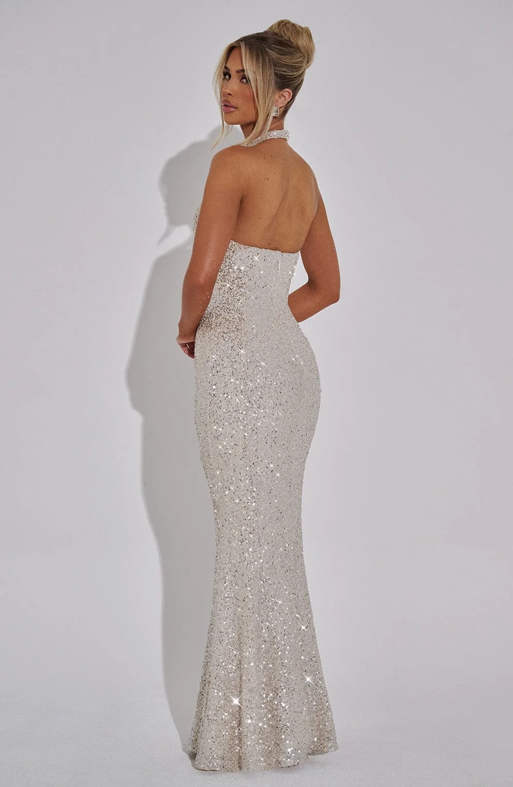 Illuminate any occasion with our gorgeous Champagne Sequin Mermaid Maxi Dress. Crafted from luxurious textured sequin fabric, this dress features a flattering plunge scoop neckline, halterneck straps, and a body-hugging fit for head-turning elegance. The mermaid skirt and invisible zipper deliver added sophistication. Perfect for weddings, parties, proms, and more, this fully lined dress ensures you shine all night long. Embrace the glamour and grace with this stunning ensemble in champagne color.