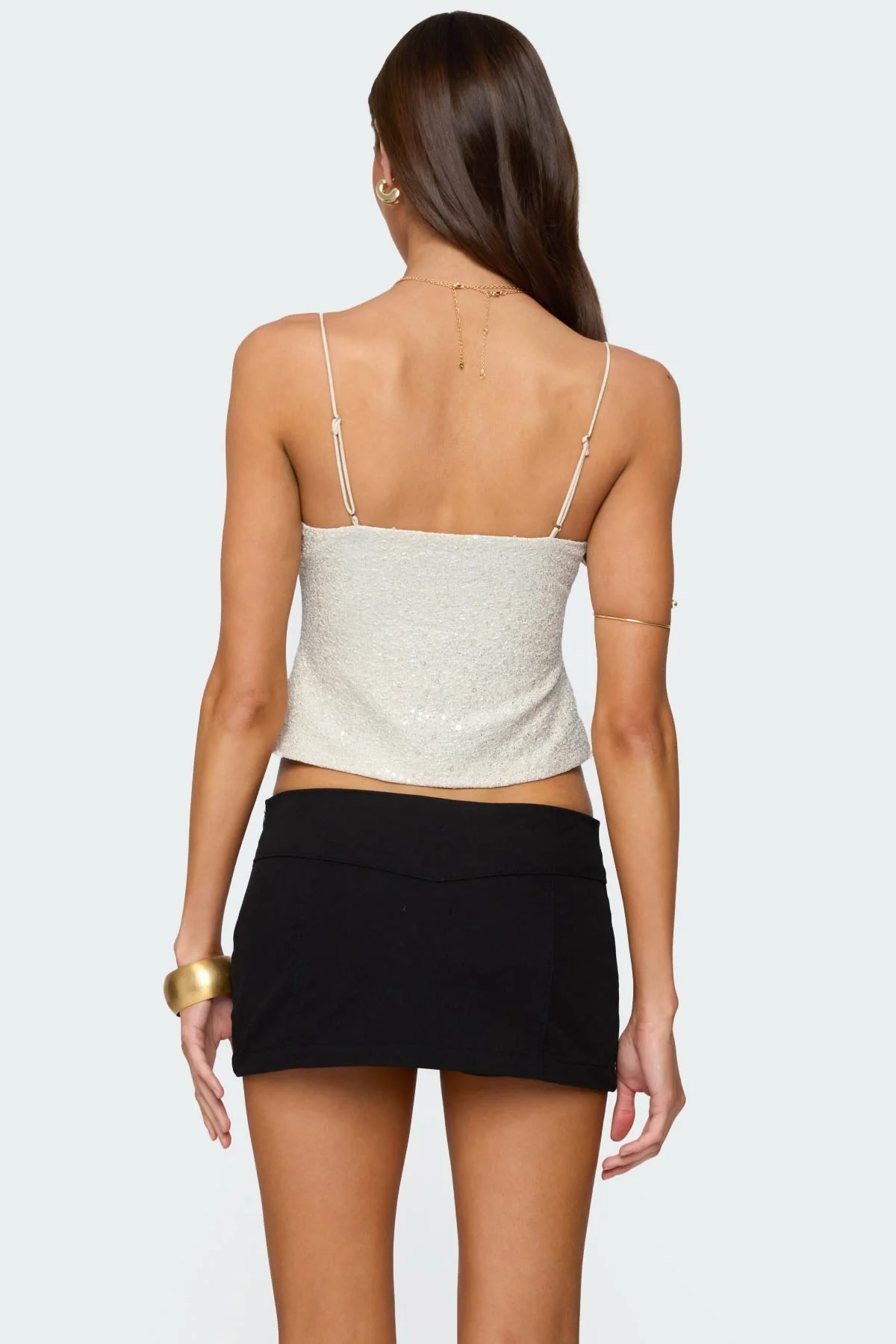 Upgrade your wardrobe with this stunning Champagne Sequin Textured Tank Top featuring adjustable straps for a perfect fit. The metallic and sequin embellishments add a touch of glamour to this tank. Made from high-quality polyester and spandex blend fabric, this tank promises both style and comfort. Ideal for evenings out, this tank can be machine washed for easy care. Elevate your style effortlessly with this chic tank top.