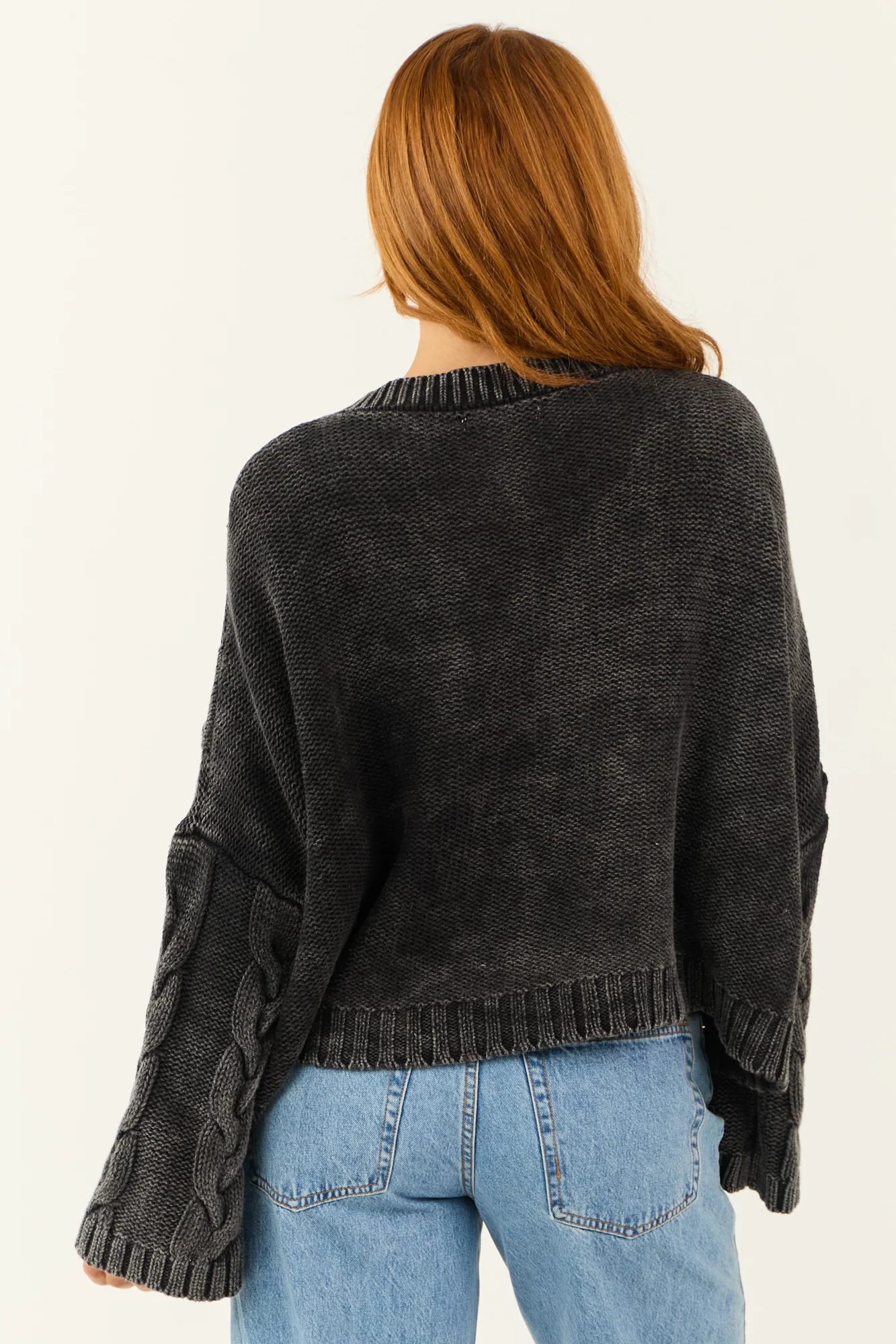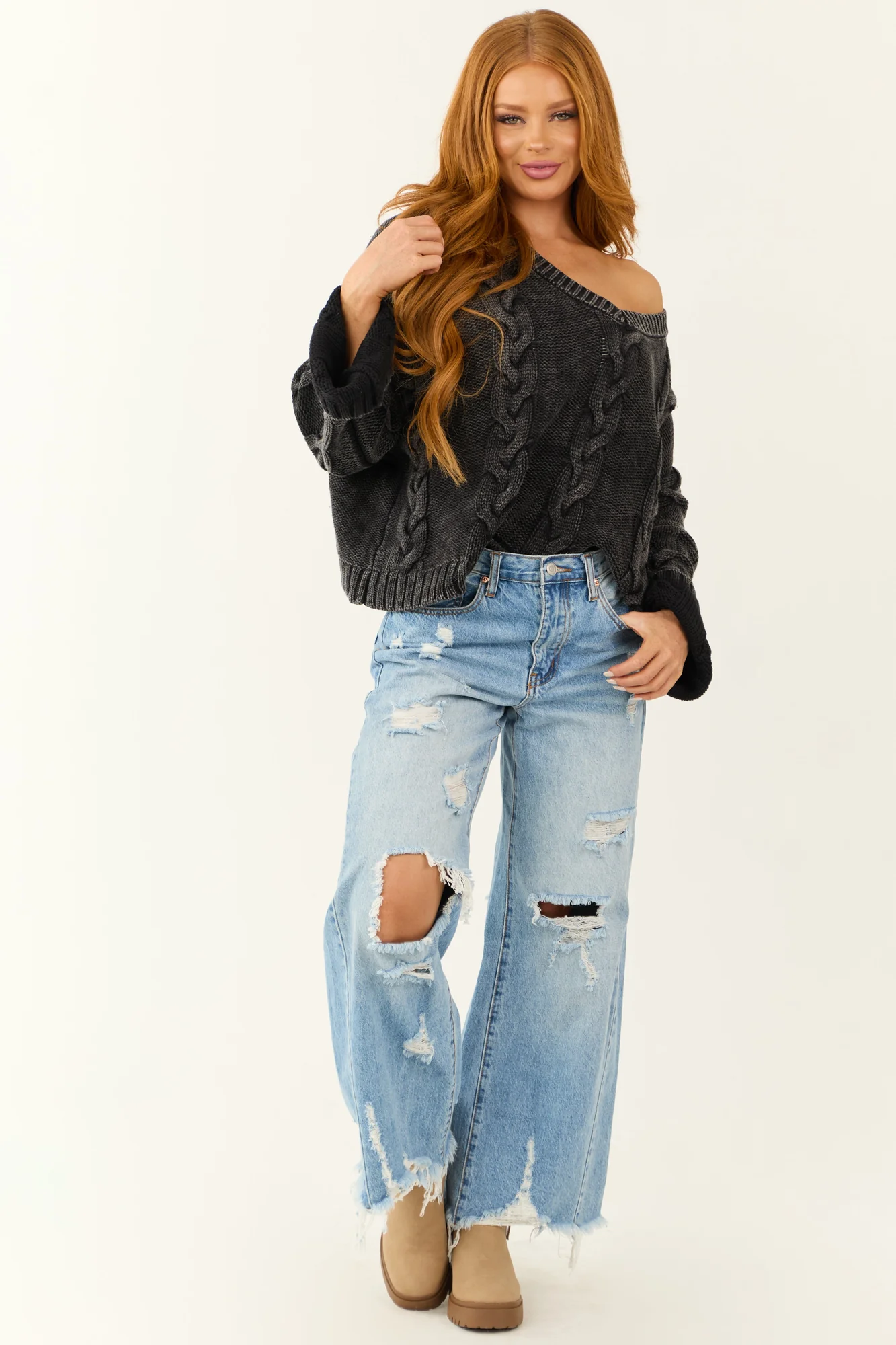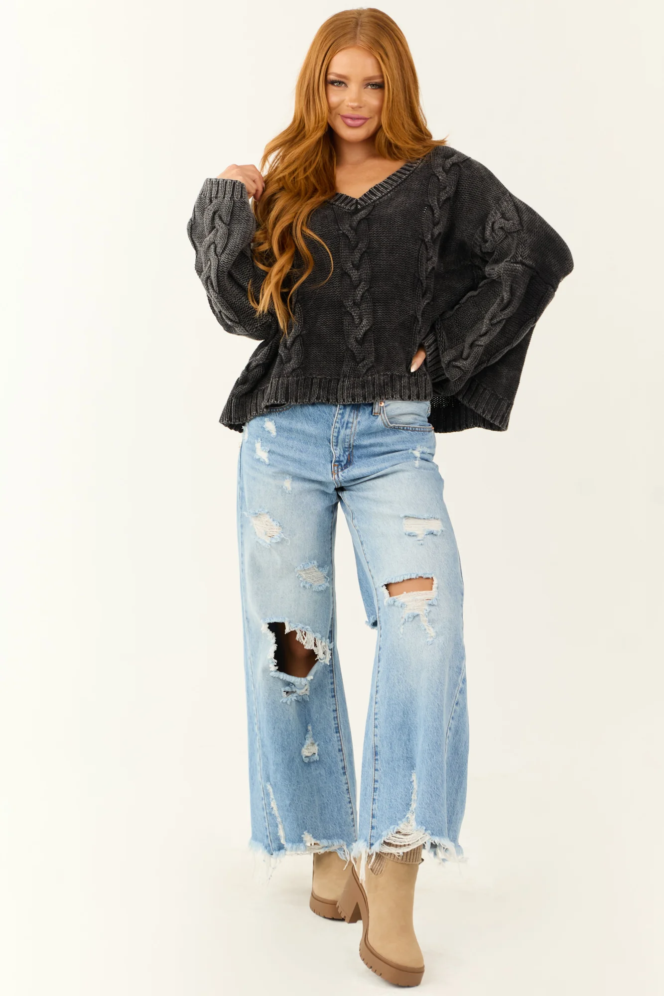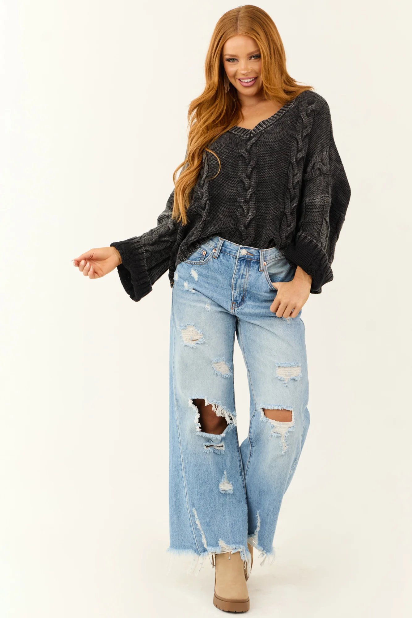 Stay cozy and stylish in this Charcoal Cable Knit V-Neck Sweater made of 100% Cotton. The oversized fit with stretchy cable knit, banded trim, and drop shoulder design offers comfort and trendiness. Available in sizes S, M, and L. Perfect for daytime wear during the winter season. Model is wearing a size Small.