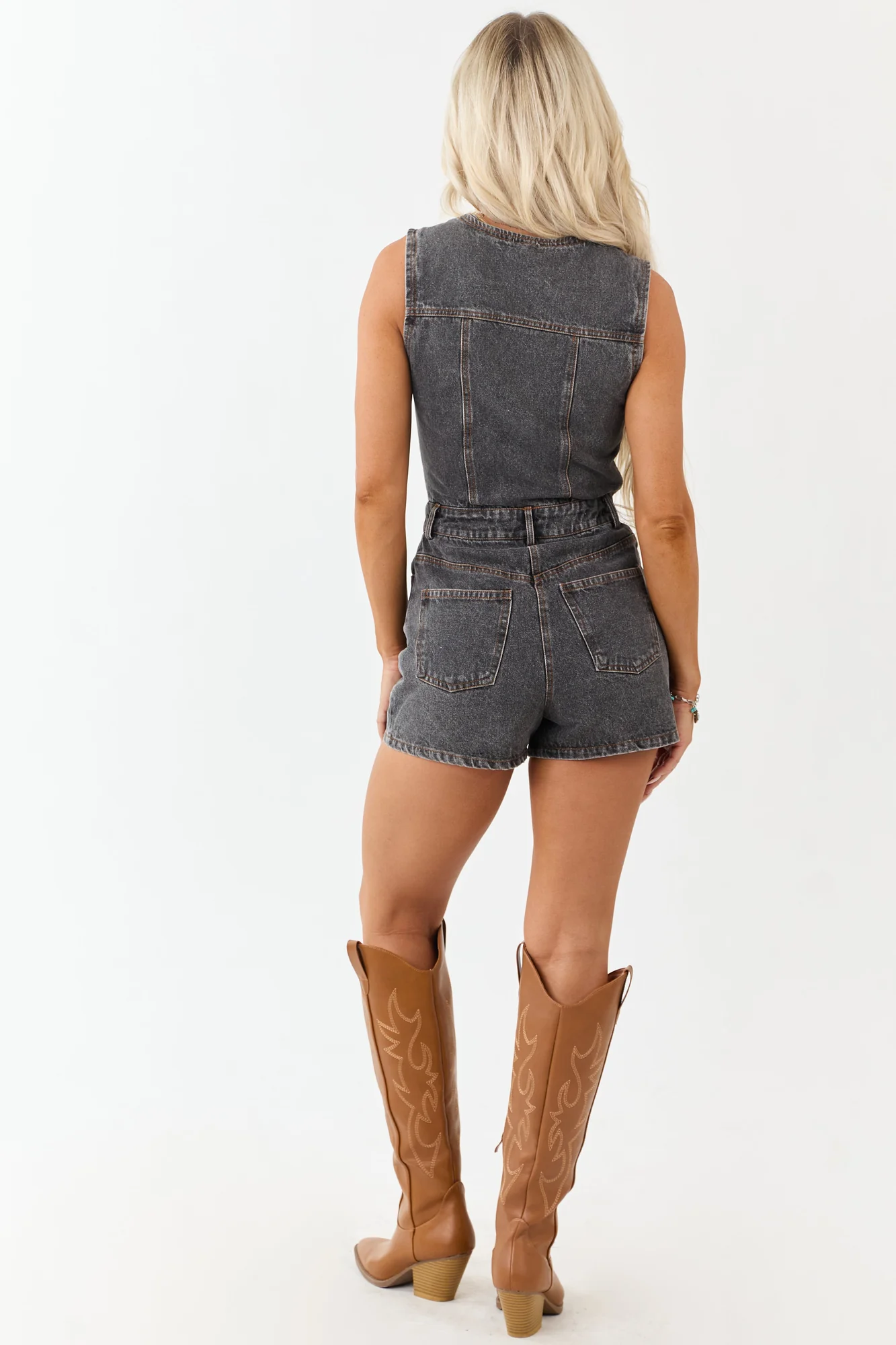Discover versatile style with our Charcoal Denim Vest Style Romper featuring a vest-style top, front cut-out design, and size options XS to L. Crafted from non-stretchy 100% cotton denim, it offers a unique two-piece illusion with practical details like 4 pockets, belt loops, and front buttons. Perfect for casual outings or trendy events, this romper adds a touch of flair to your wardrobe. Model is wearing size XS. Available in gray color.