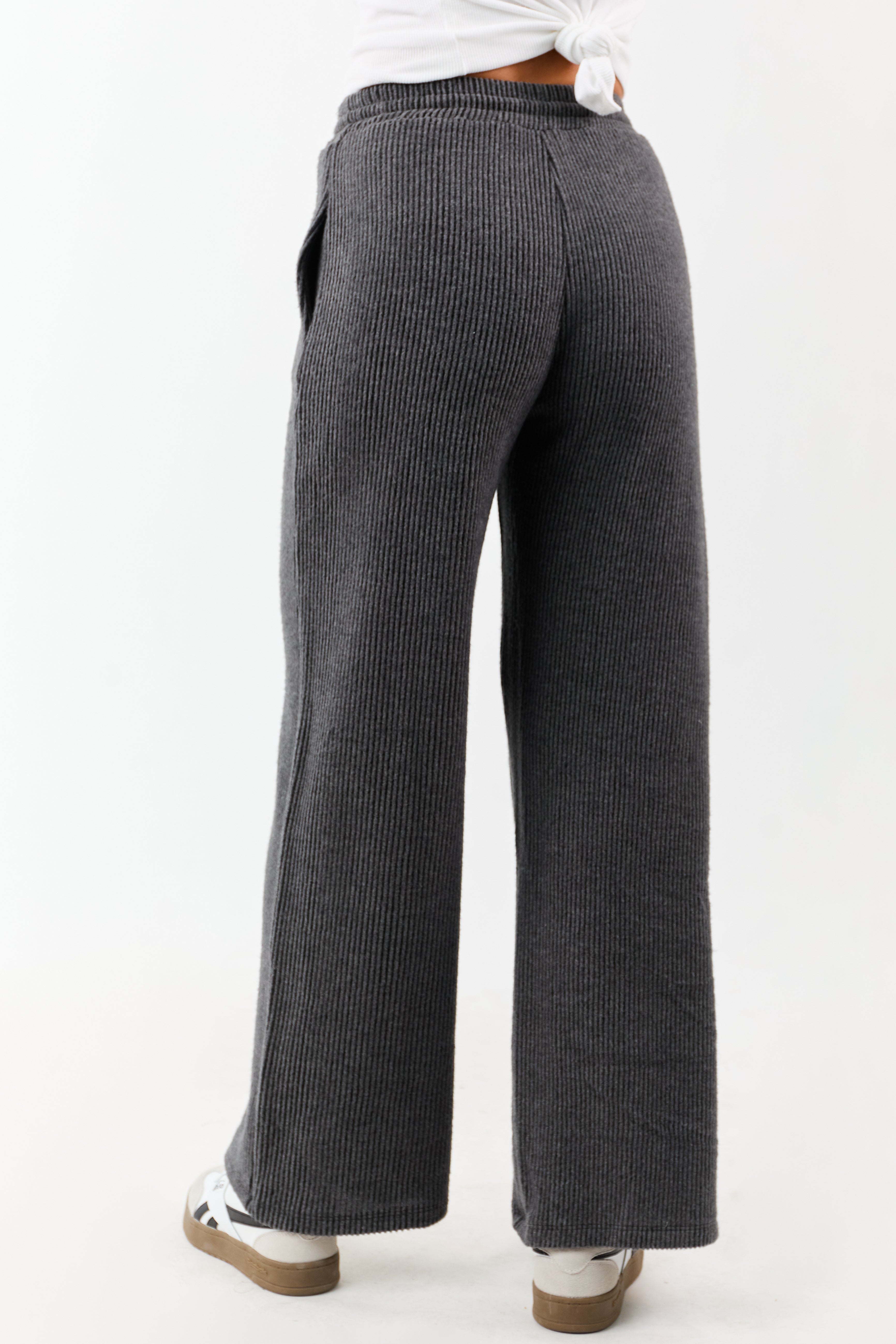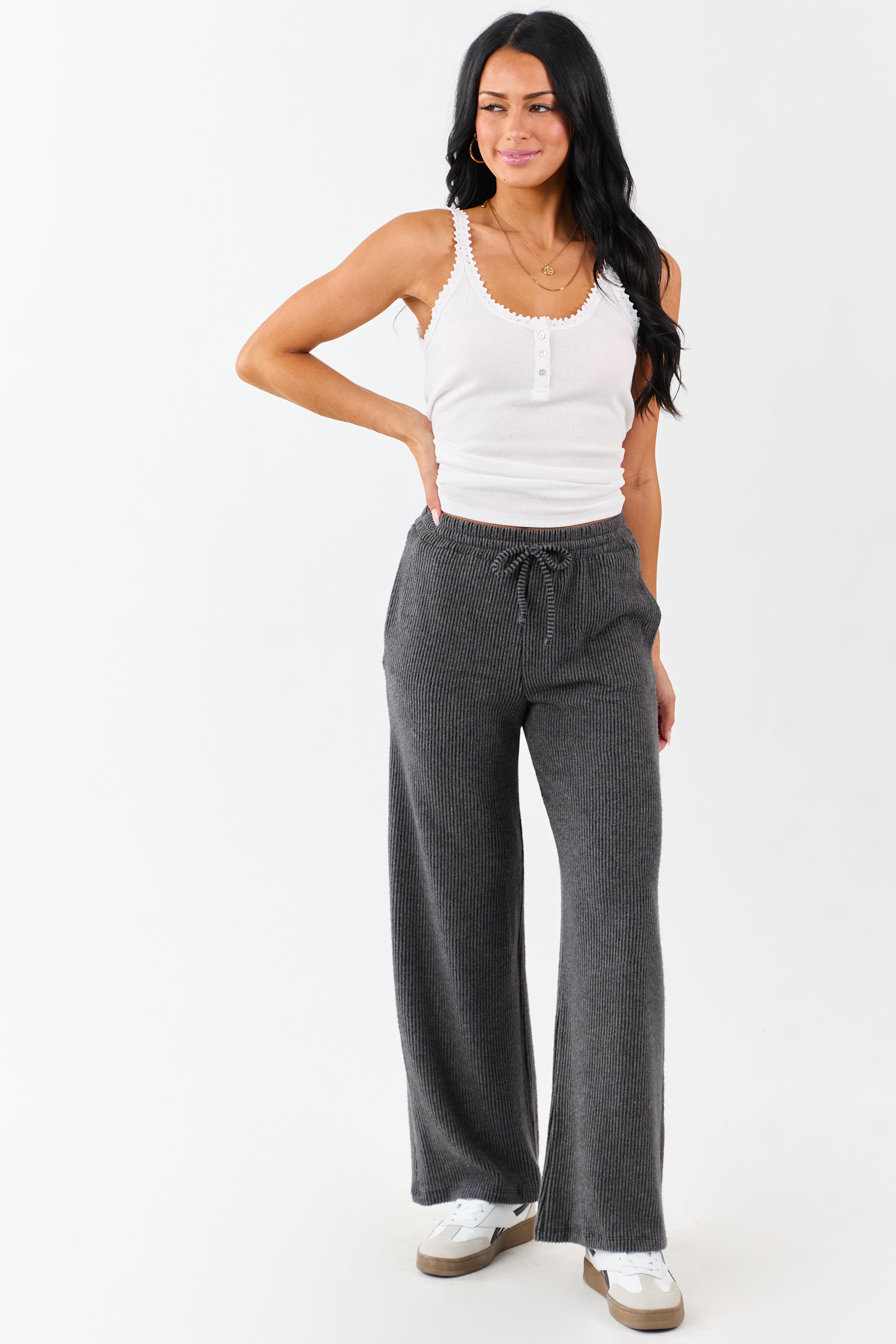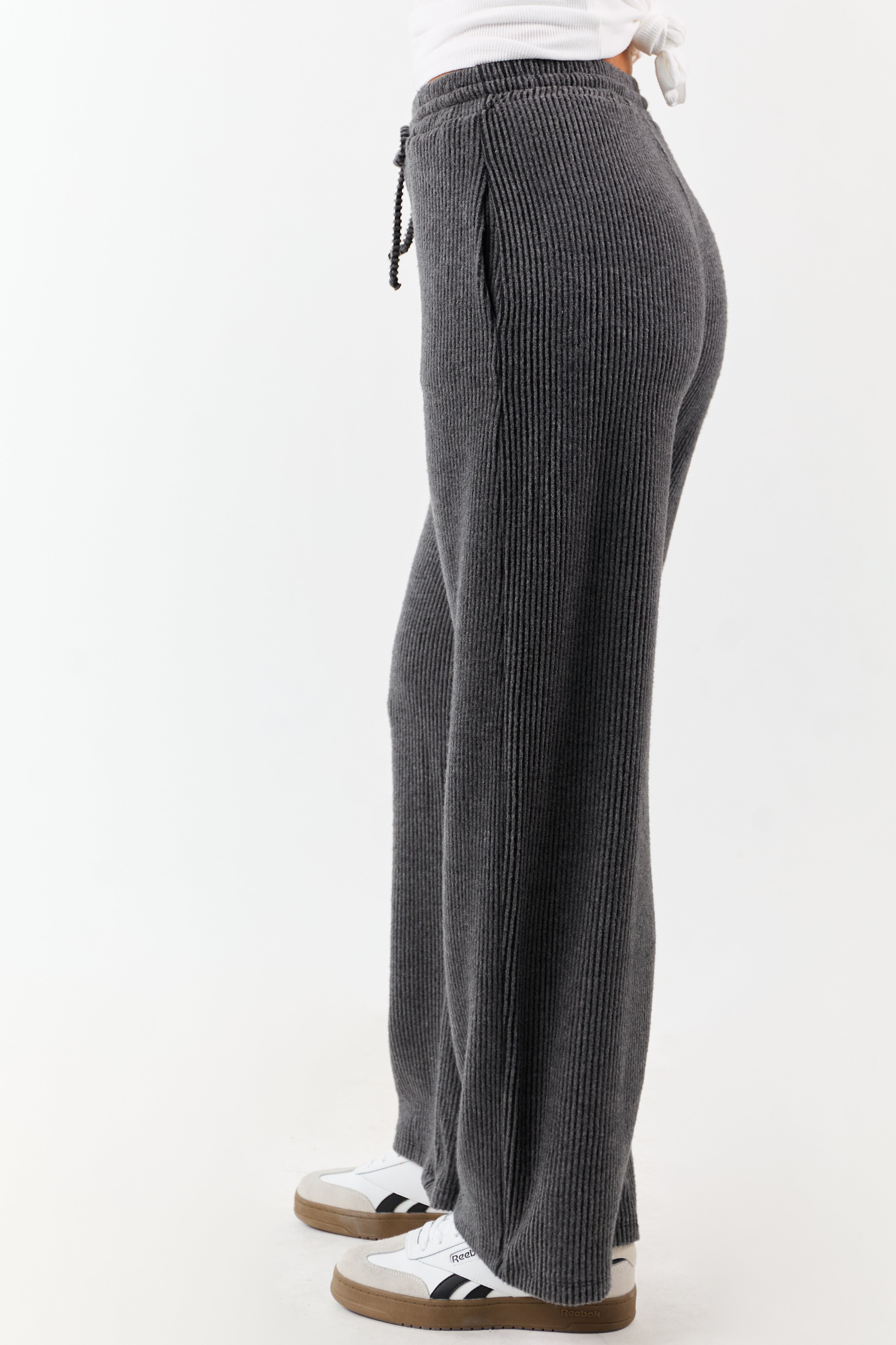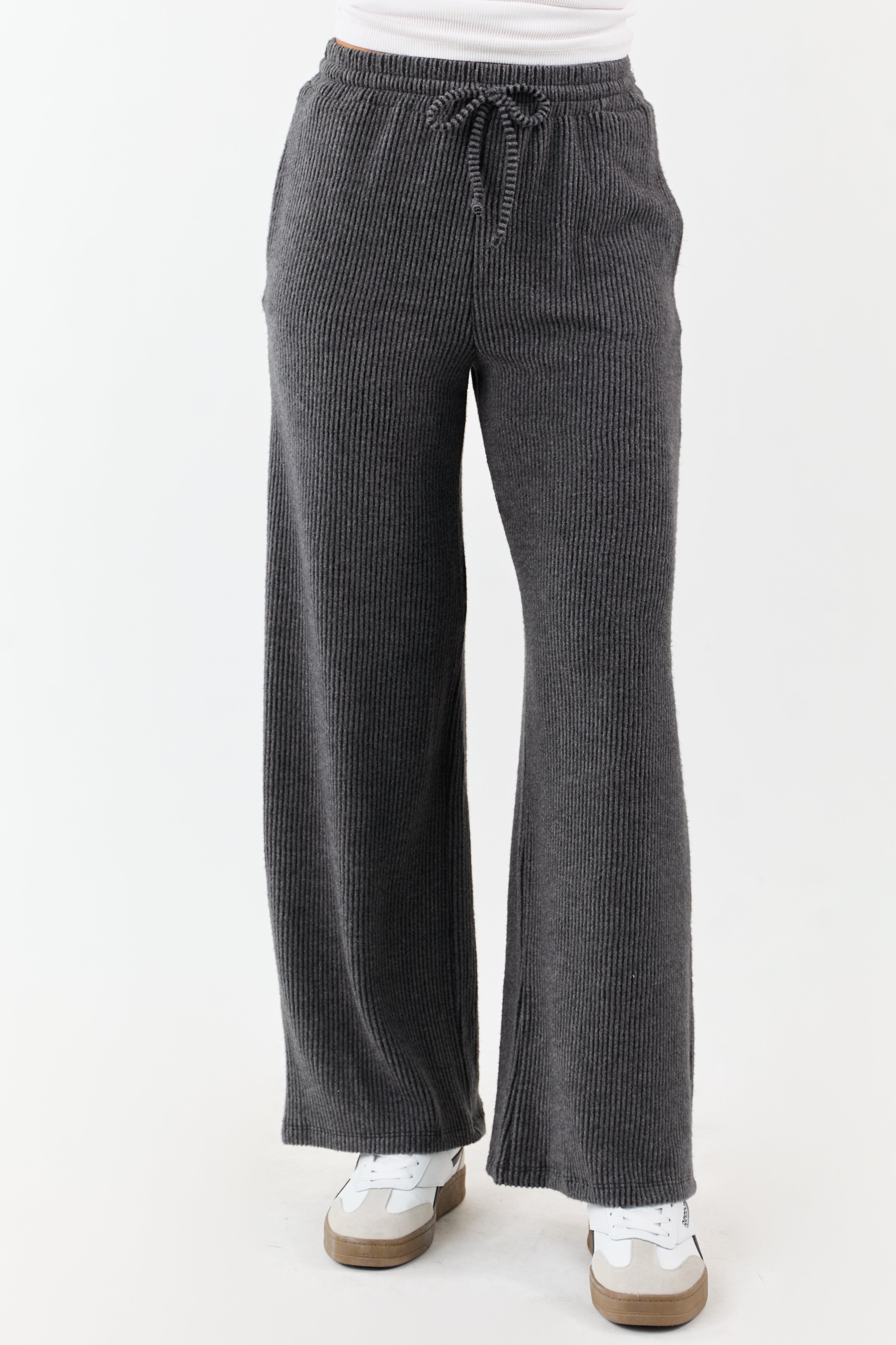 Stay comfortable and stylish all day with these charcoal knit wide leg drawstring pants. Ideal for coffee runs or cozy nights in, these pants feature a high-waisted design with a stretchy soft ribbed knit fabric for a perfect fit. The side pockets and inseam of 30 inches add practicality to the chic design. Made of 63% Polyester, 33% Rayon, and 4% Spandex, these pants are a must-have addition to your wardrobe. The model is wearing a size Small. Model’s measurements: Size 1, Height 59, Bust 34, Waist 26.
