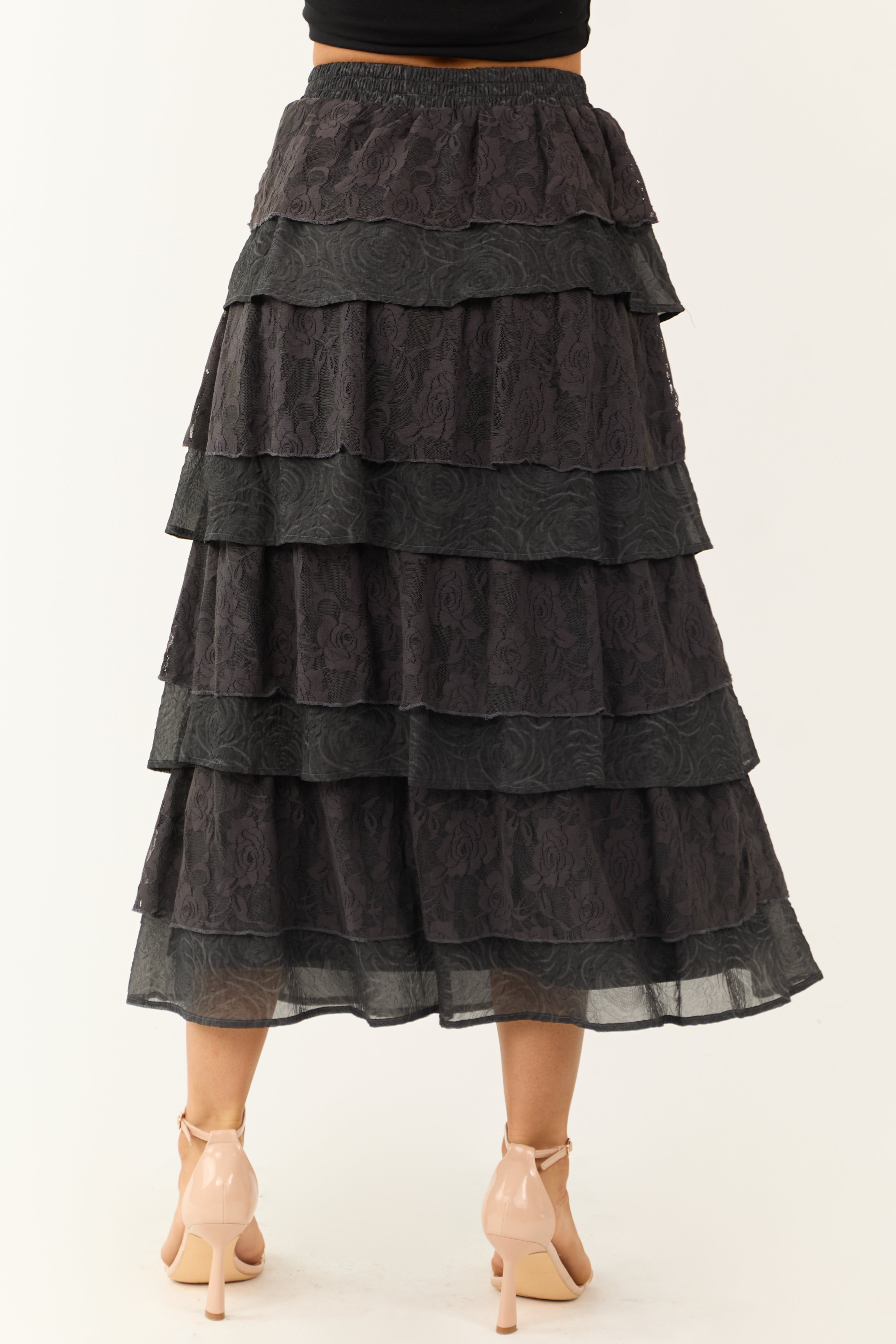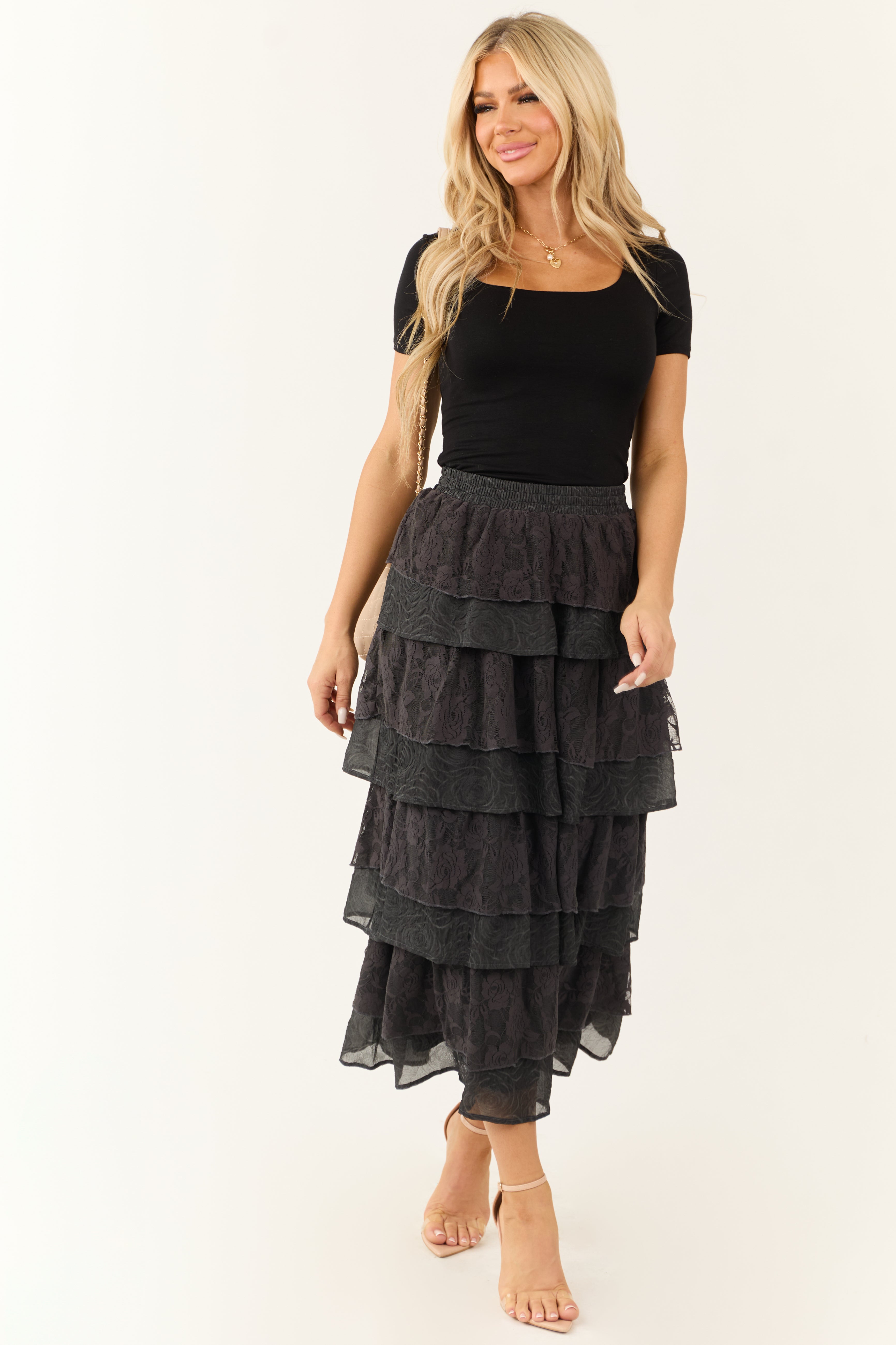 Indulge in elegance with our Charcoal Lace Tiered Maxi Skirt available in sizes S, M, and L. Crafted from stretchy lace knit, this skirt features tiered ruffling, floral jacquard detailing, and an elastic waistband for a comfortable fit. Enjoy the maxi length with intricate lace overlay, lined for quality. Perfect for daytime wear, pair it with your favorite top for a sophisticated look. Hand wash cold, line dry, and iron on low for lasting beauty. Model is Size 1, Height 57″, Bust 34″, Waist 26″.