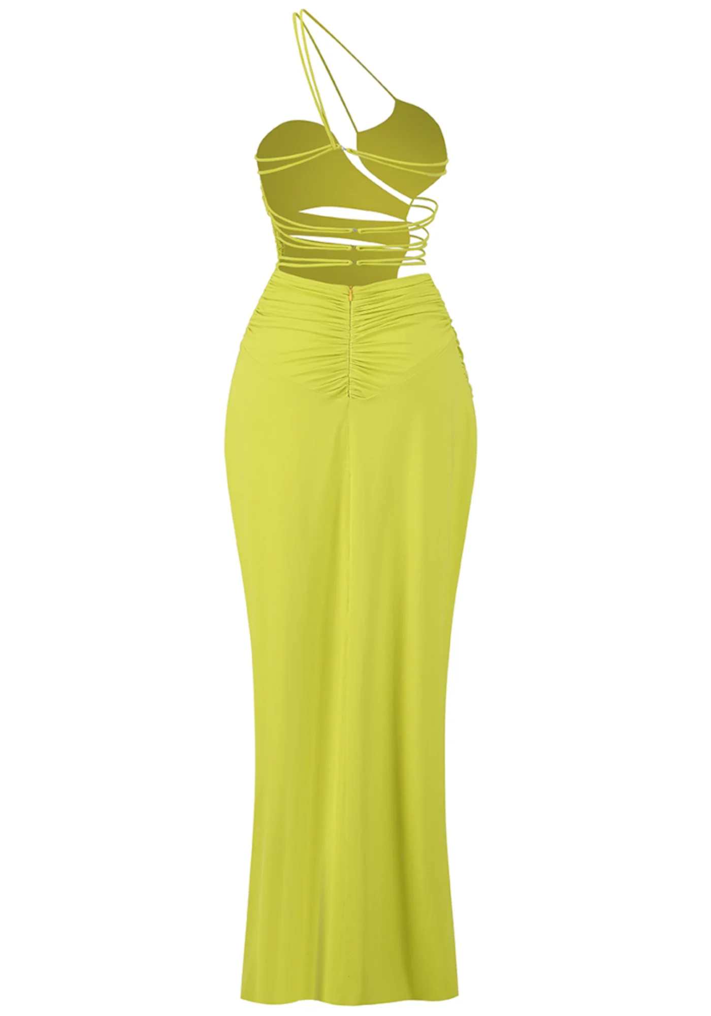 Experience chic elegance with our Chartreuse One Shoulder Maxi Dress. This dress features a one-shoulder design, sleeveless style, and intricate draped details. Crafted from a blend of Polyester and Cotton for durability and comfort. Complete with a concealed YKK zipper for functionality. Care instructions included. Elevate your style effortlessly with this vibrant piece.