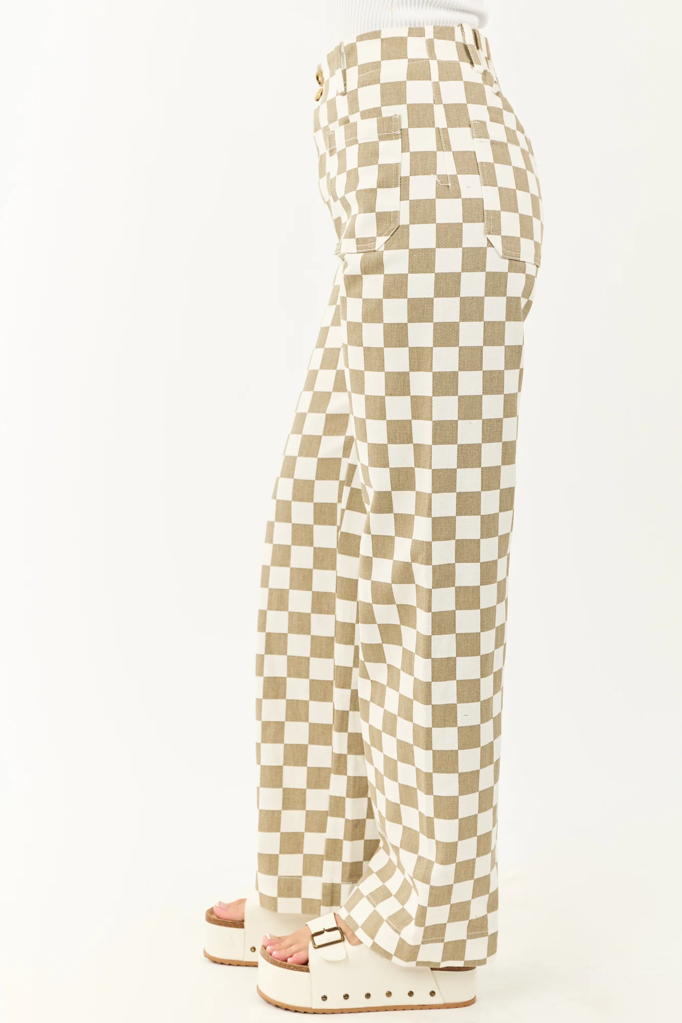 Discover the retro remix of pure cool-girl energy with these comfy wide leg pants in an olive and ivory checkered design. This non-stretchy denim piece features a high rise, back elastic waistband, zipper fly, and double button closure. Perfectly fitting true to size, it comes with belt loops, 4 pockets, and has an inseam length of 30.5″. Crafted from 100% cotton for maximum comfort and style. Imported. Model is 59″ tall, bust 34″, waist 26″, wearing a size Small.