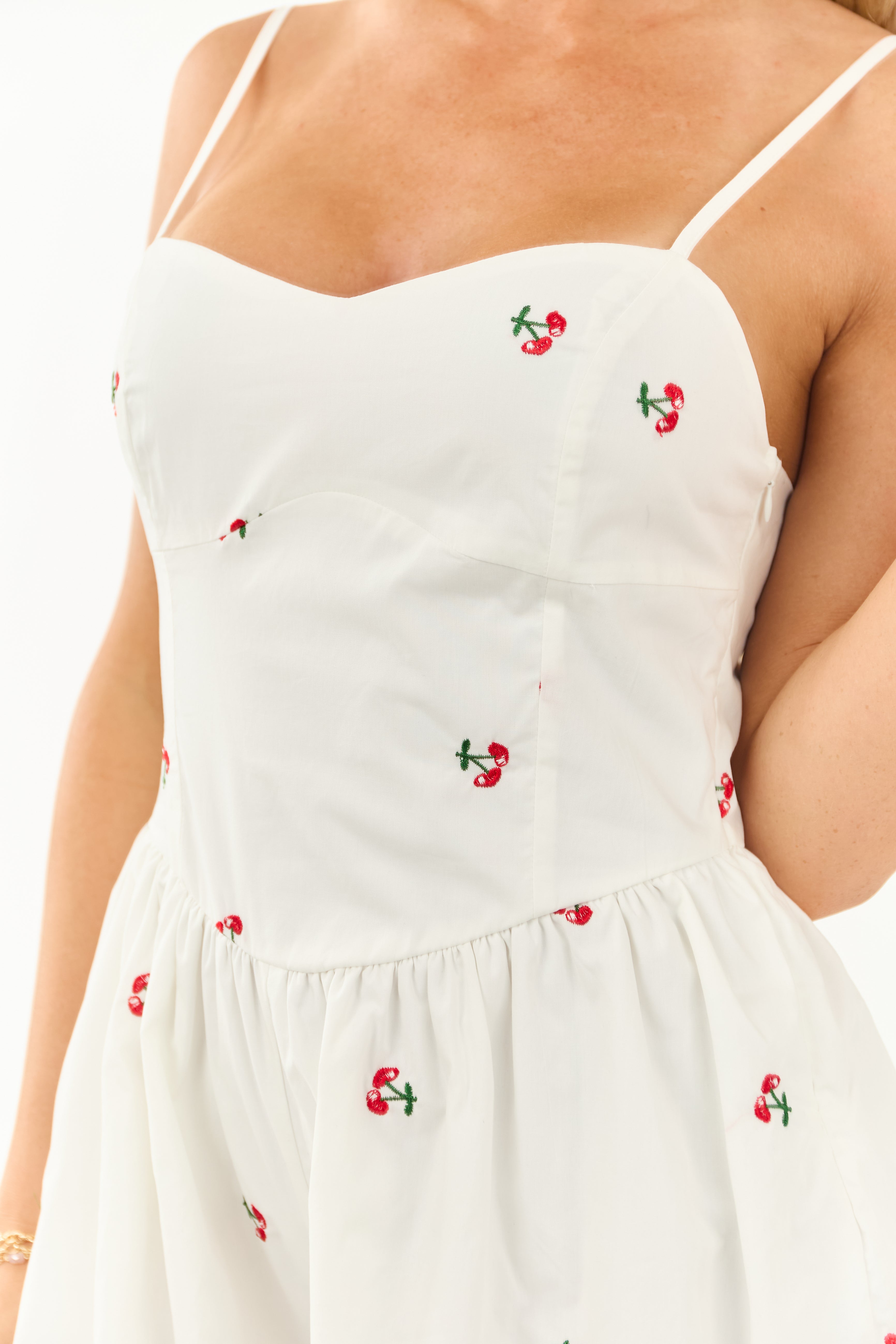 This cherry embroidered romper is ripe with charm and picnic-ready vibes. Fits true to size with a non-stretchy lightweight cotton fabric. It features smocked back design, adjustable spaghetti straps, hidden side zipper, and lovely embroidering in shades of Cherry and Hunter Green. Ideal for summer outings! Available in sizes XS, S, M, L, and XL. Let this adorable romper elevate your style effortlessly.