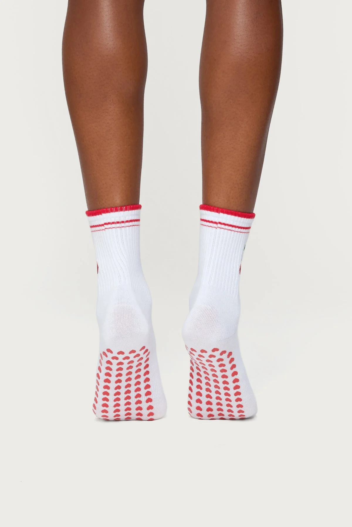 These White Cherry Embroidered Grip Socks are crafted from a blend of Cotton, Polyester, and Spandex. The unique design features an embroidered cherry graphic for a touch of style. Enjoy a secure grip during Pilates or everyday use. The length measures 10.6 inches, and the care instructions recommend machine washing at a maximum of 30ºC with similar colors. Avoid bleach or tumble dry, iron at a maximum of 110ºC, and do not dry clean.