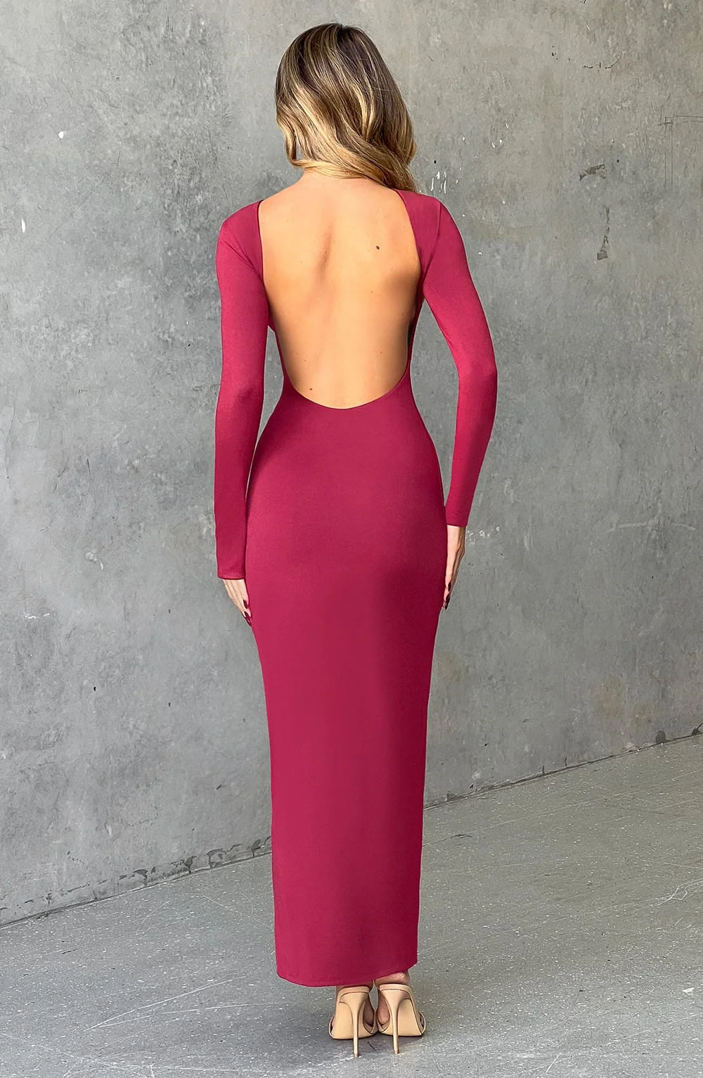 Indulge in luxurious comfort with our cherry-hued flared maxi dress. Crafted from premium modal fabric, this dress features a high neckline, long sleeves, and a mesmerizing low scoop back. The double-layered design offers a second-skin feel that moves with your body, accentuating your natural curves effortlessly. Elevate your style with this buttery soft, fully lined dress that is a true blend of comfort and elegance. Perfect for various occasions from daytime outings to evening affairs. Available in sizes XS to XXL.