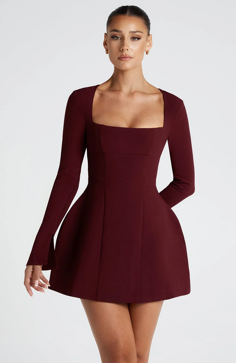 Indulge in the sophistication of the Cherry Lacquer Bubble Hem Mini Dress, expertly crafted from non-stretch crepe. This striking dress boasts a charming square neckline that accentuates your décolletage, complemented by long sleeves with stylish split cuffs. The voluminous bubble-shaped skirt adds a flirty touch, making it the ideal statement piece for any event. Adorned in Cherry Lacquer, this dress features a full, closed back and convenient invisible zipper closure. Elevate your ensemble with this enchanting piece.