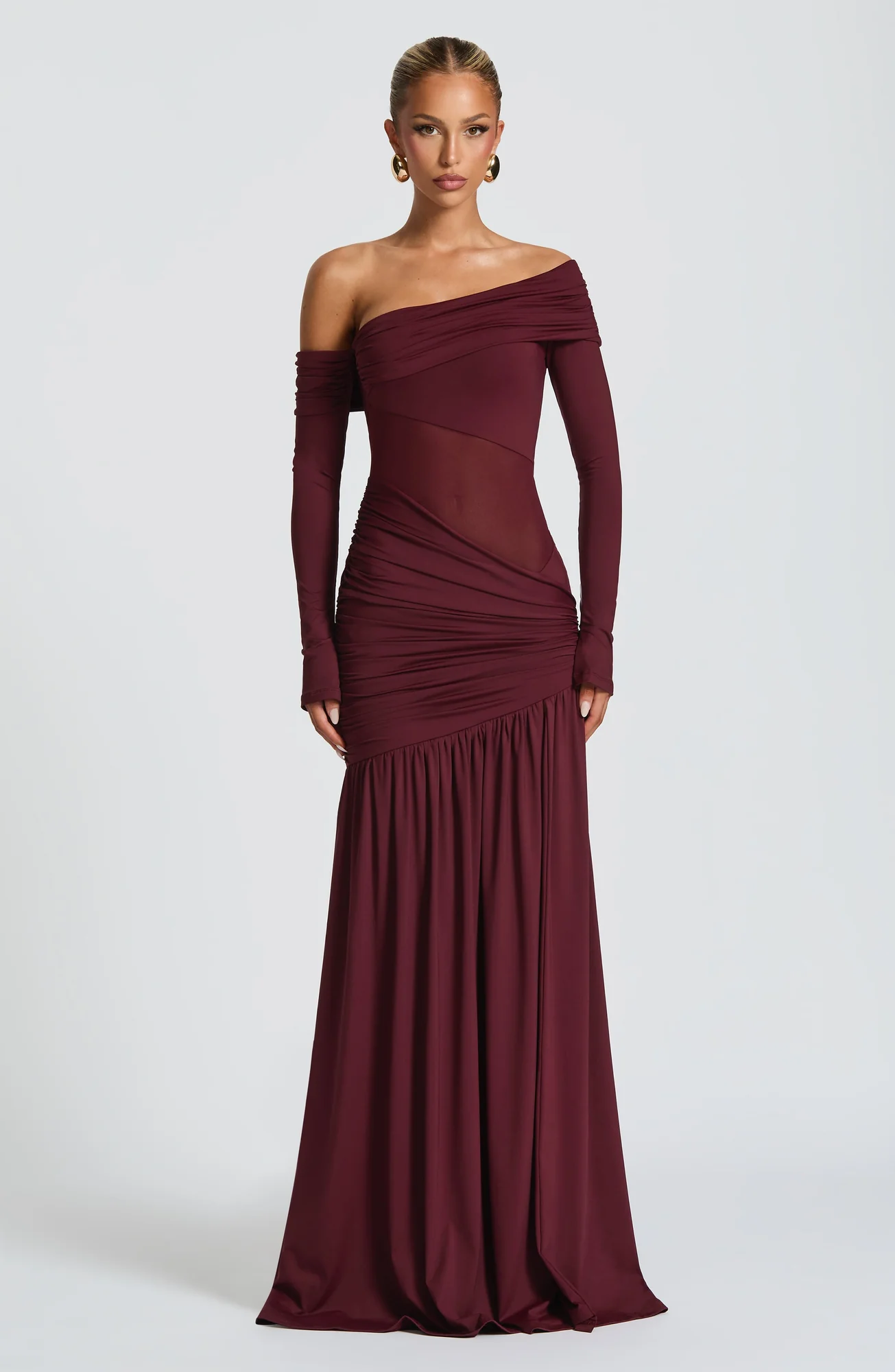 Step into luxury with our Cherry Lacquer Flowy Maxi Dress for women. Crafted from a stretch slinky fabric, this elegant evening gown features an alluring sheer mesh panel on the bodice, an asymmetric neckline, and stylish long sleeves with gently flared cuffs. The ruched detail on the hip adds sophistication, while the full, gathered skirt exudes drama. Embrace timeless elegance with this beautiful dress in Cherry Lacquer. Perfect for evening events, weddings, parties, and more.