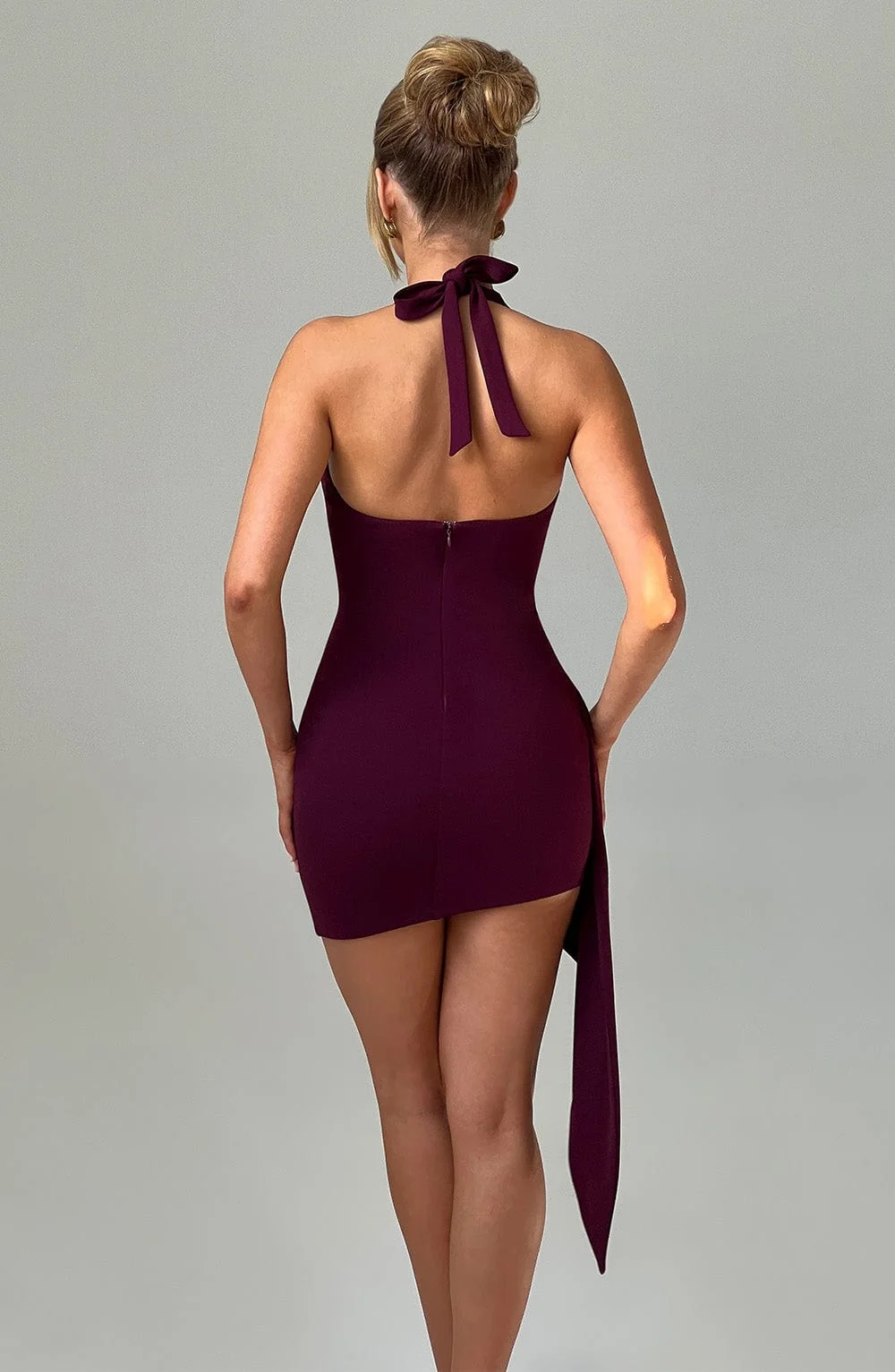 Discover the elegance of the Cherry Lacquer Mini Dress. Crafted from premium stretch crepe, this dress features a flattering fitted silhouette, plunging neckline with a stylish tie at the back, and chic asymmetric pleats. The draped frill detail adds a touch of drama to your look. Fully lined for comfort with an invisible zipper closure. Perfect for any special occasion. Model is wearing a size XS. Available in sizes XS to XXL.