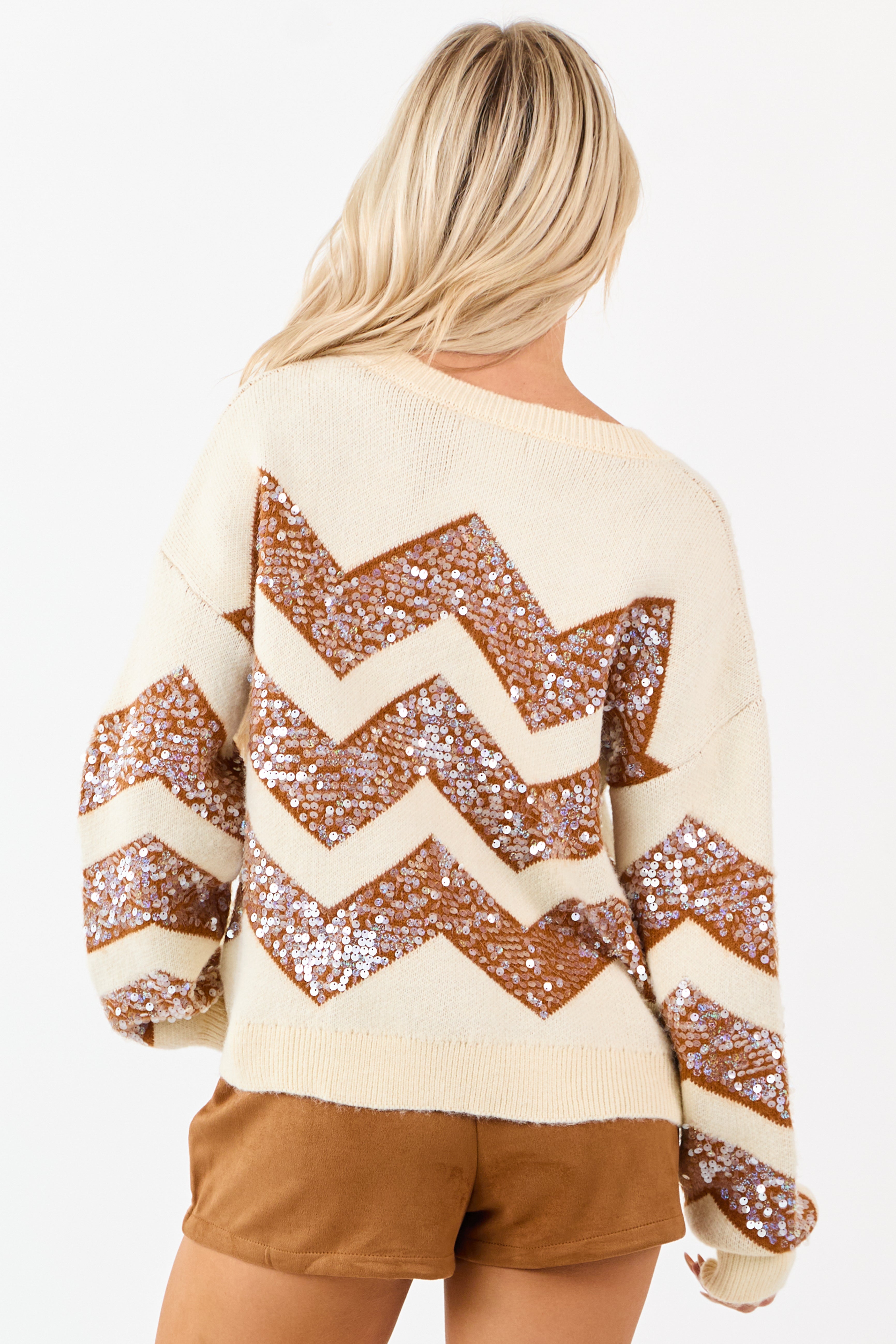 Add a touch of shimmer to your wardrobe with this Chevron Pumpkin and Ivory Sweater. This cozy knit features eye-catching sequins, a relaxed fit, stretchy material, and drop shoulders for an effortlessly chic and comfortable style. Perfect for those looking to stand out with a touch of glamour during the cooler seasons. The fabrics print and cutting process may result in slight variations, making each piece unique. Ideal for casual outings or social events.