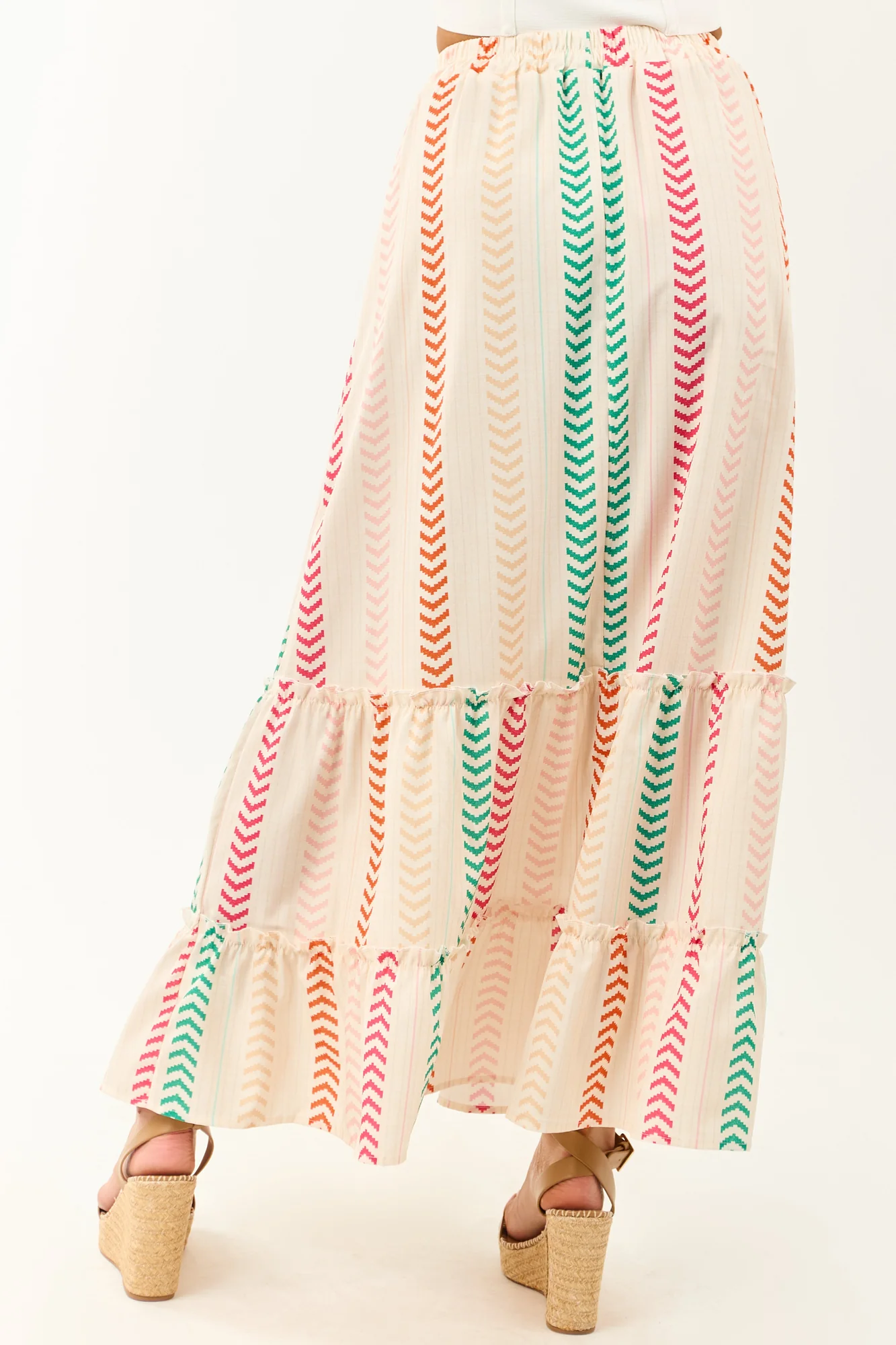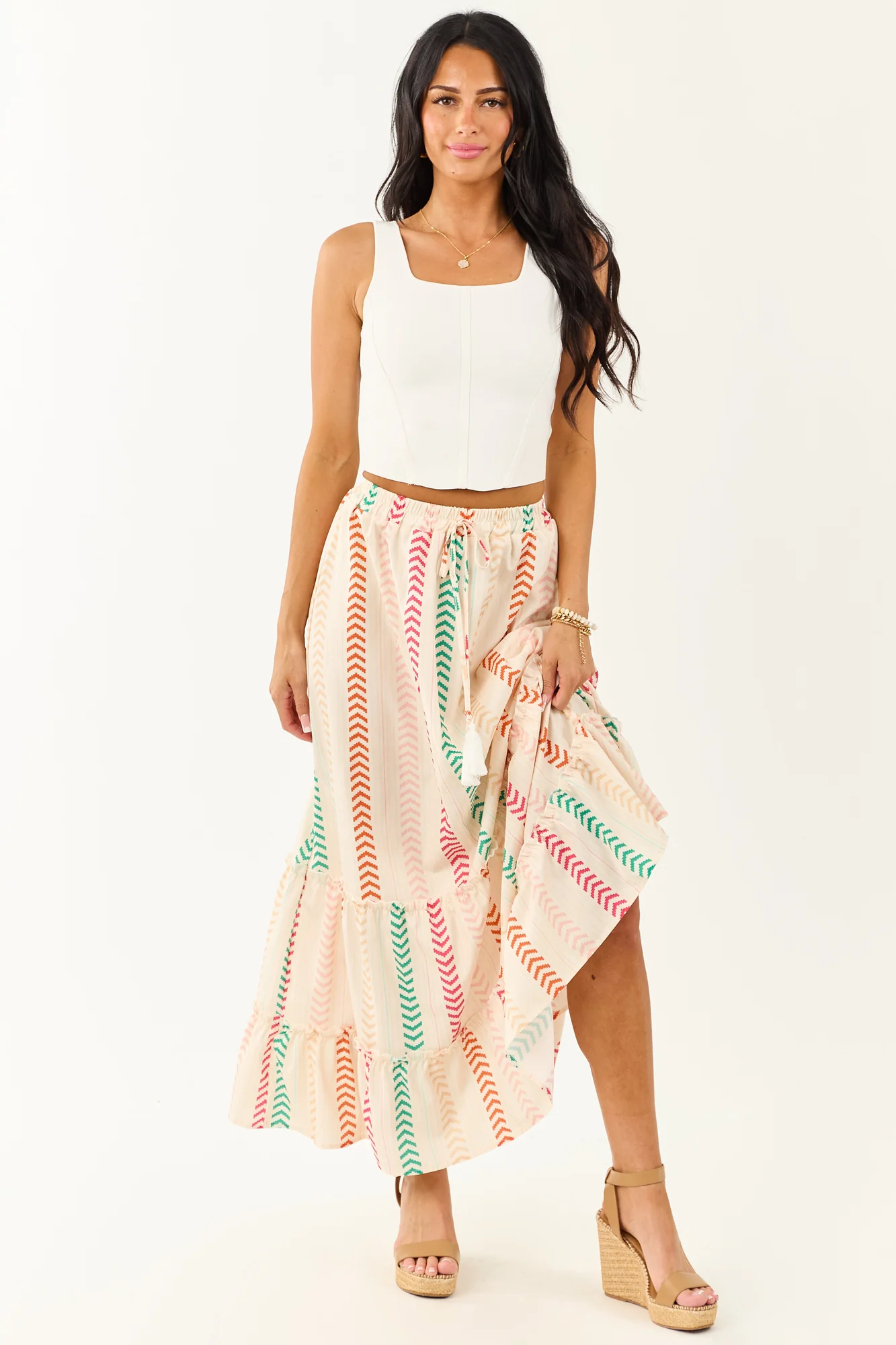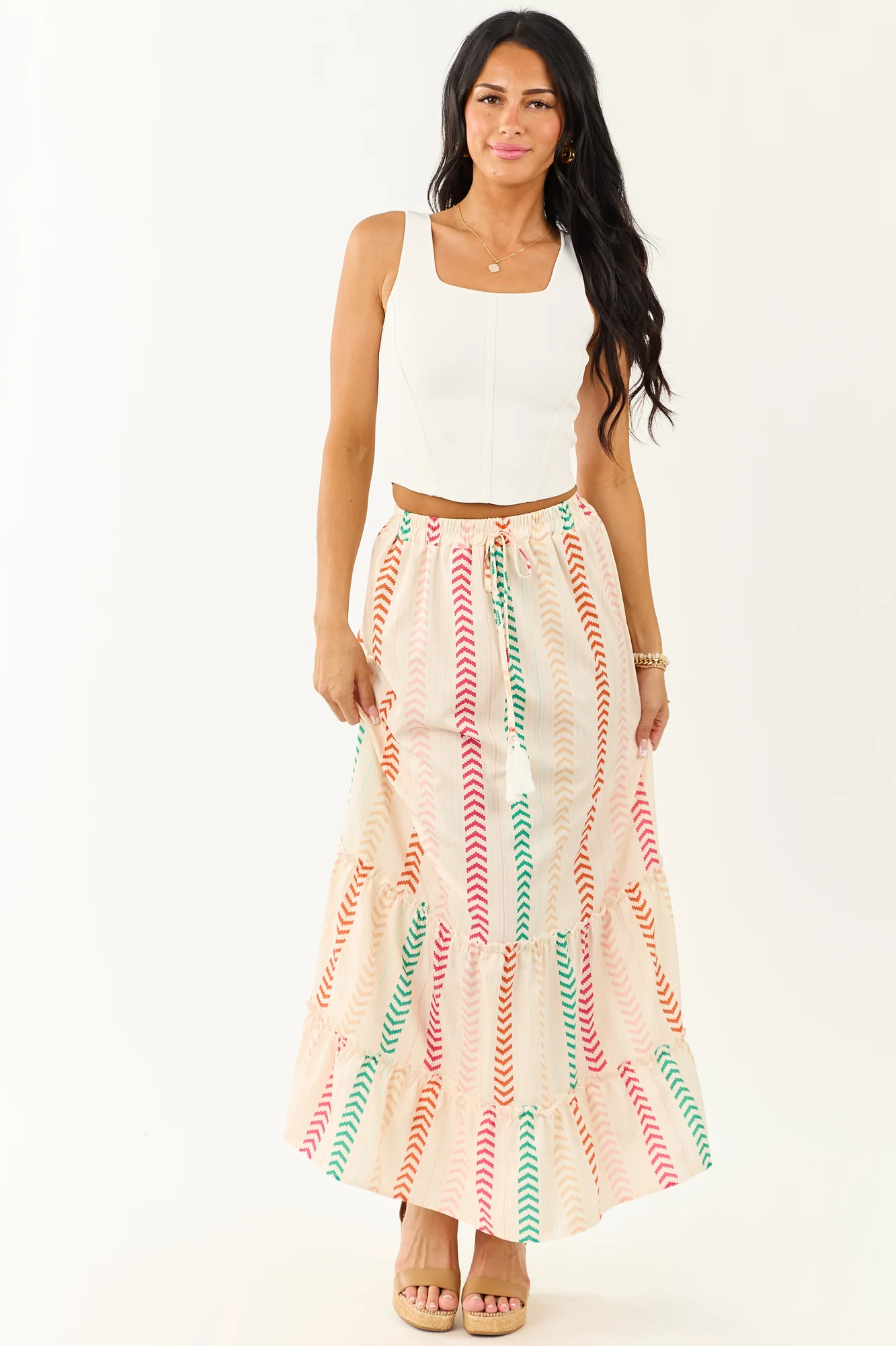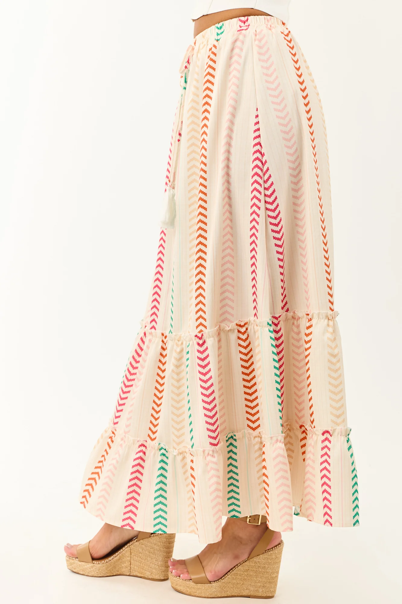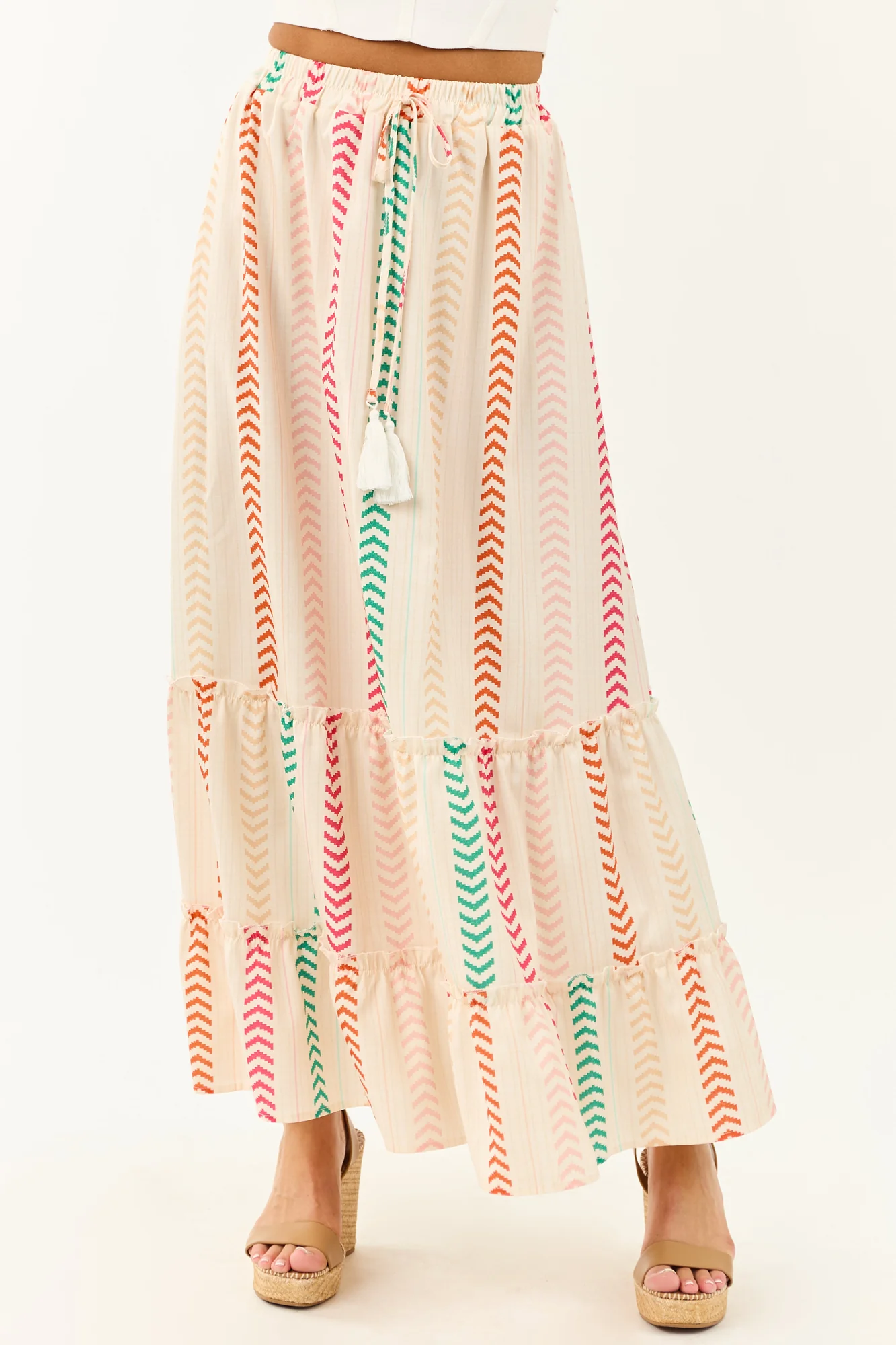 Elevate your style with our Chevron Stripe Maxi Skirt in Multicolor. Crafted for comfort and charm, this skirt features a forgiving elastic waistband and a vibrant pattern in shades of Jade, Aqua, Amber, Cherry Blossom, Fire, and Crimson. Perfect for any occasion, this maxi skirt is 100% Polyester and comes with a non-adjustable drawstring with tassels. Embrace bohemian elegance with this stunning piece that fits true to size.