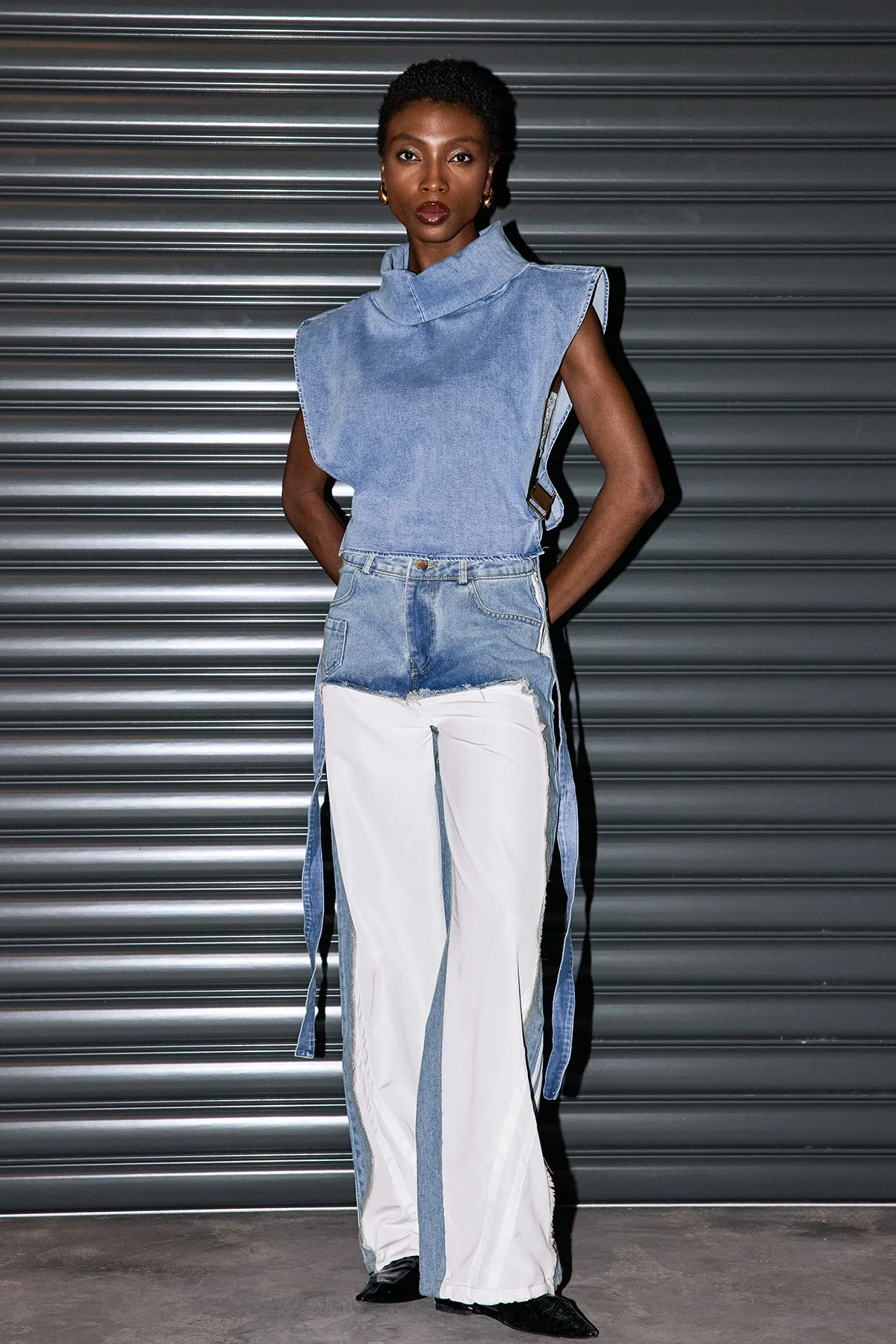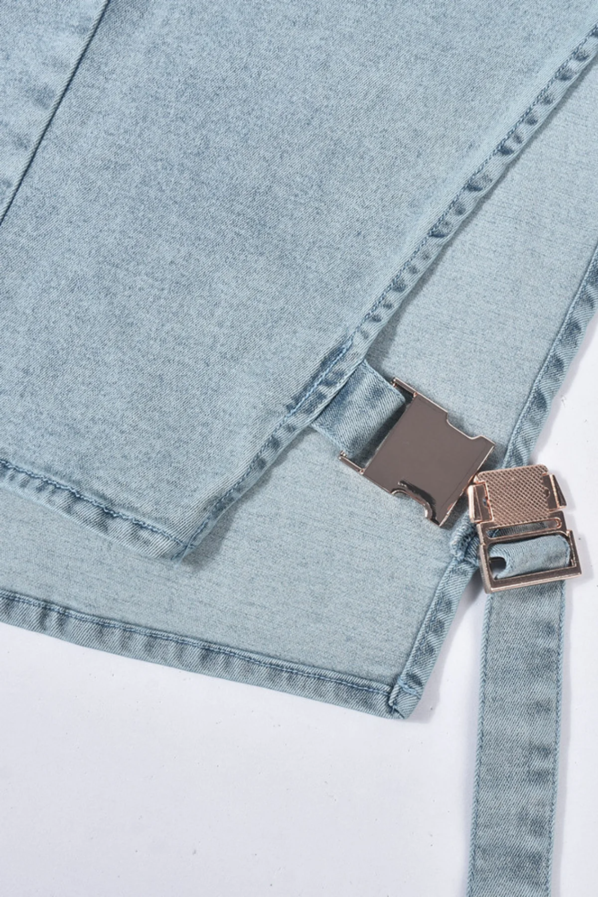 Elevate your wardrobe with our chic Abstract Buckle Detail Sleeveless Denim Top. Crafted from 100% polyester for a flattering fit, this top showcases a high neck, cutout accents, and a unique buckle detail at the waist. With a blend of style and edge, this top is perfect for any occasion. The non-stretch material ensures durability, while the gentle machine wash makes care a breeze. Add this must-have piece to your collection for a touch of flair. Please note that color may vary slightly due to lighting. Shop now!