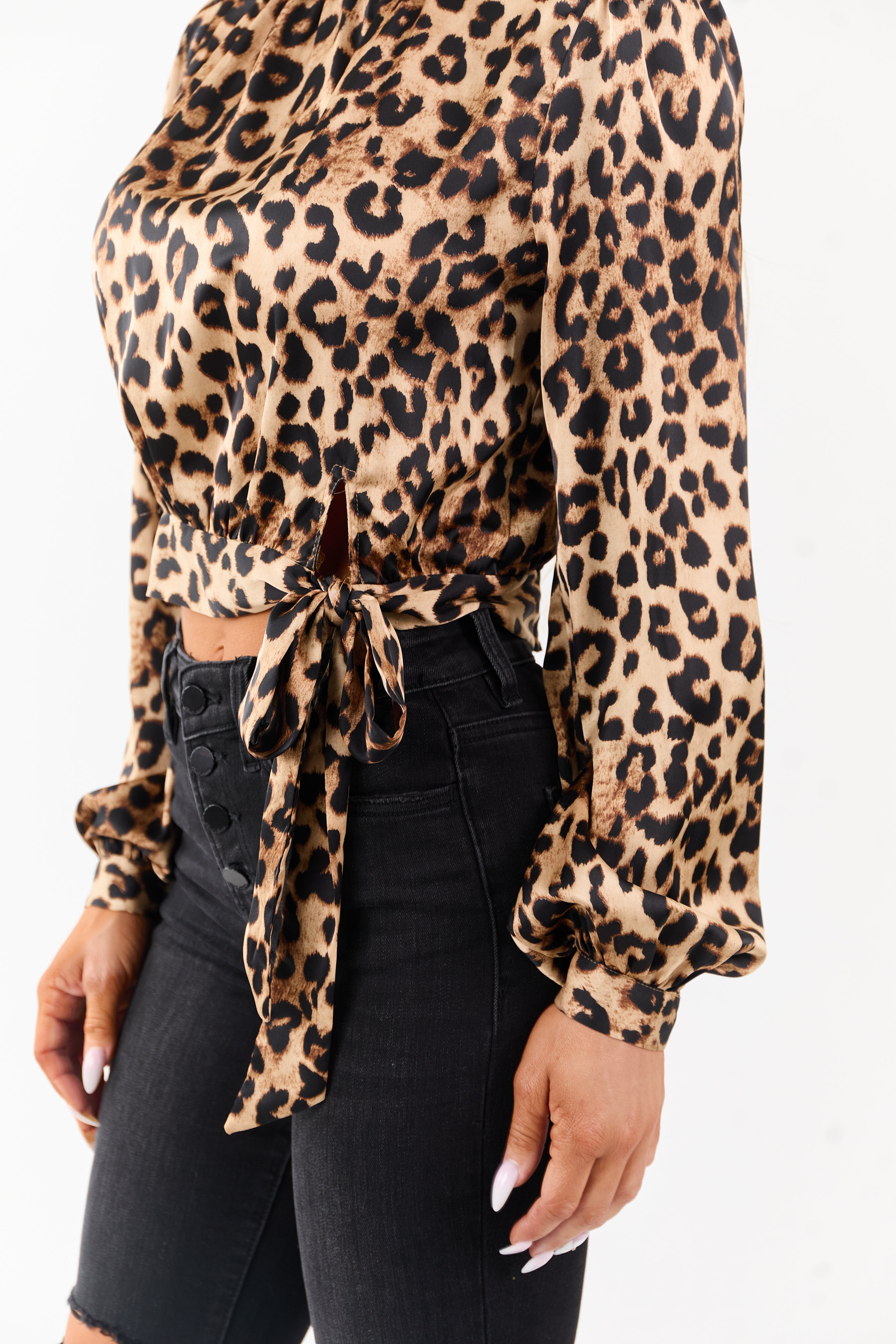 Elevate your wardrobe with our sophisticated beige leopard print top. Crafted from 100% polyester, this dressy top features a high neck, front tie detail, smocked hem, and button cuffs for a modern and feminine look. With a relaxed fit and keyhole button clasp, this top exudes effortless style and elegance. Perfect for any occasion, whether paired with jeans for a casual outing or dressed up for a night out. Available in sizes S, M, and L. Model is wearing a size Small. Model’s Profile: Size 3, Height 57″, Bust 35″, Waist 26″.