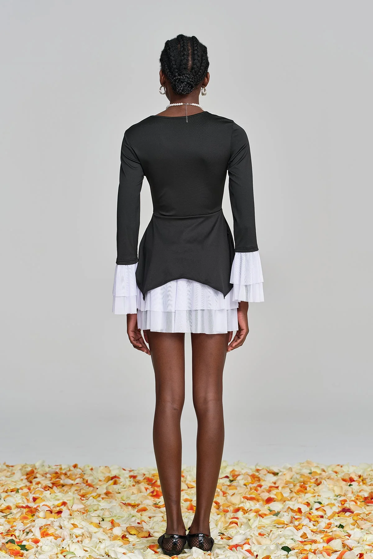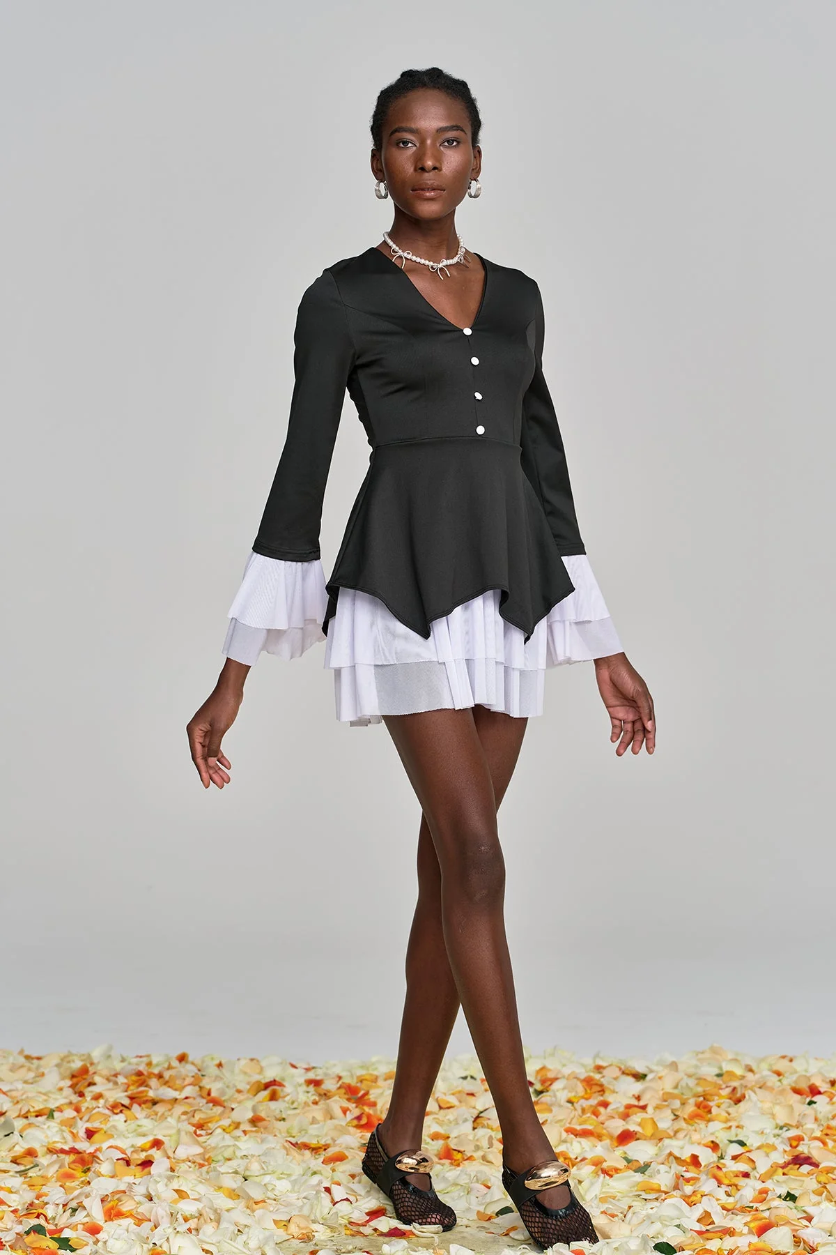 Elevate your style with this chic essential black mini dress featuring an elegant asymmetric ruffle design and a flattering V neck. Made from high-quality materials with slight stretch, this dress offers both comfort and style. Perfect for any occasion, this dress is a versatile addition to your wardrobe. Gentle machine wash recommended. Please note: color may vary slightly due to lighting effects on images.