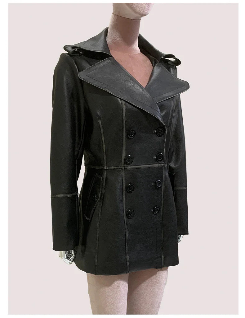 Indulge in the timeless elegance of our Limited Edition Chic Black Faux Leather Womens Blazer crafted from premium faux leather & cotton blend. Elevate your style with this one-of-a-kind showstopper, featuring a flattering silhouette and luxurious feel. Whether its a casual day out or a special evening, this blazer will effortlessly enhance your look. Embrace sophistication with this wardrobe essential available in various sizes. Feel the luxury, feel the Chic Black Faux Leather Womens Blazer.