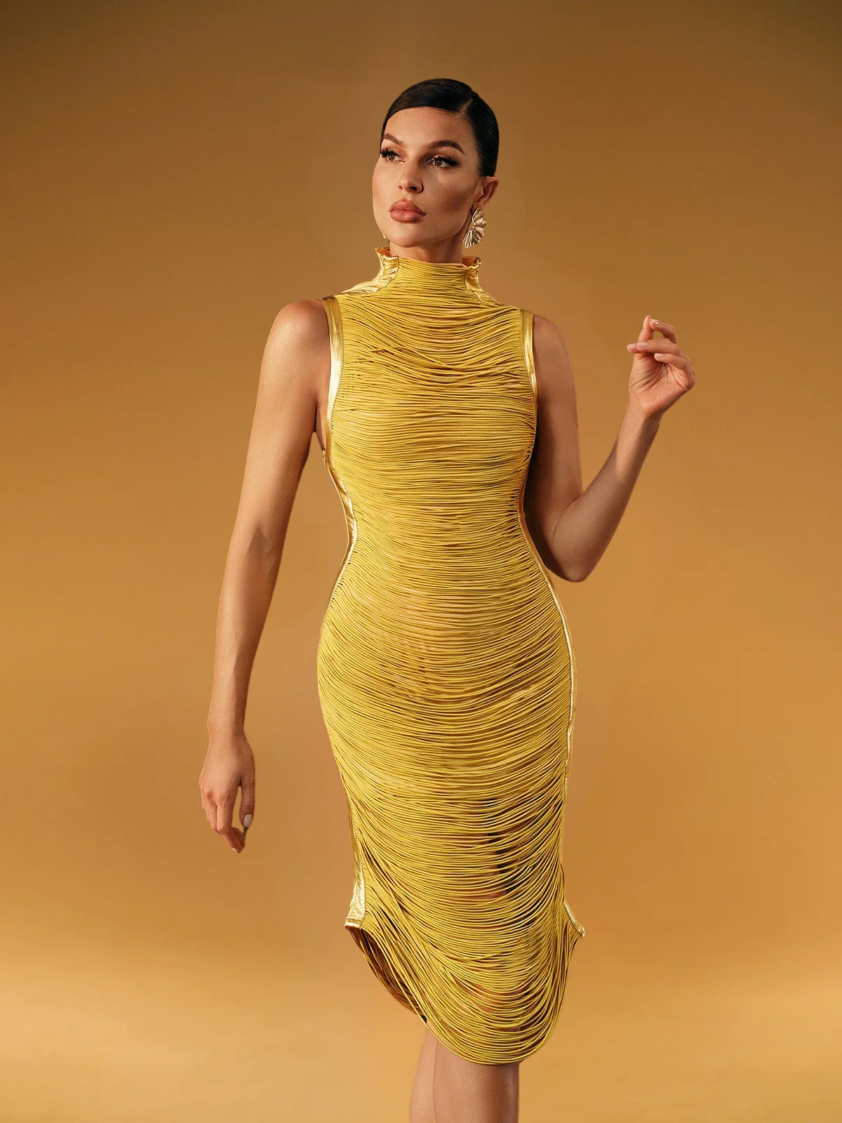 Elevate your style with the chic Black Fringe Midi Dress. Crafted from high-quality 100% Polyester with a slight stretch, this dress features a trendy high neck design and eye-catching fringe detailing. Whether its a cocktail party or a formal event, this dress ensures you stand out with confidence and empowerment. Make a statement in your wardrobe with this essential piece! Please note: Color variations may occur due to lighting effects in images. Dry clean only. Model shown wearing size S.