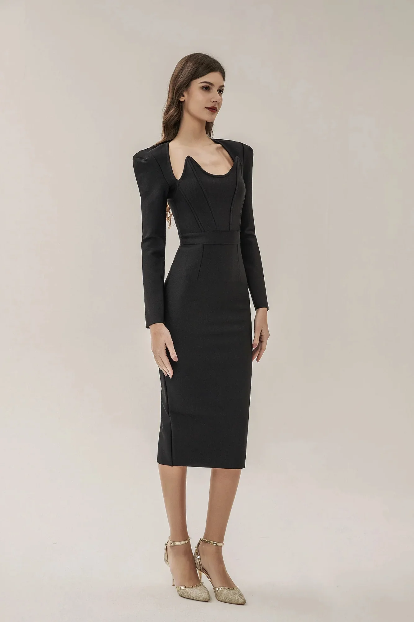 Indulge in the sophistication of our Clara Black Long Sleeve Midi Work Dress, a classic wardrobe essential exuding elegance and professionalism. Tailored from high-quality bandage fabric (90% Rayon, 9% Nylon, 1% Spandex), this knee-length dress features flattering long sleeves and exquisite skinny silhouette bandage details for a refined look. Whether its a day at the office or a business meeting, this dress pairs perfectly with heels and a stylish bag. Dress Length: Approx 118cm.Color may vary due to lighting. Available in Black, sizes XS, S, M, L, and XL. Care Instructions: Gentle Dry Clean Only.