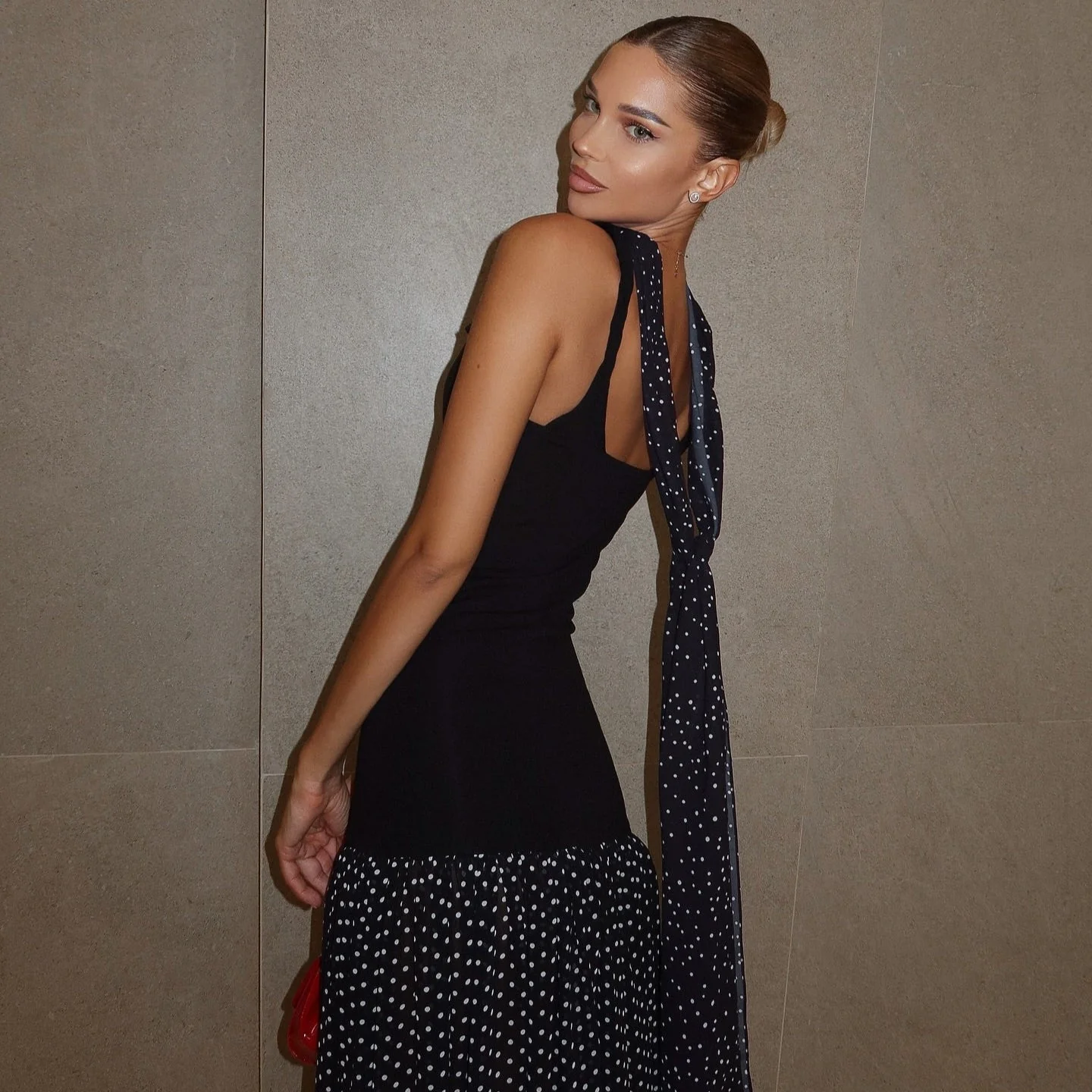 Elevate your style with the chic Black Polka Dot Maxi Dress featuring a curve-enhancing bodice and a flowing skirt that moves gracefully with every step. This sleeveless dress showcases a square neckline for a sophisticated look, complemented by a matching polka dot scarf detail inspired fashion. Perfect for galas, cocktail parties, and elegant occasions where you want to make a statement. Crafted from lightweight fabric for comfort and style, this dress is a must-have for your evening wardrobe. Discover the allure of this dress that combines timeless sophistication with modern flair. Why You’ll Adore It: – Slimming black bodice for a flattering silhouette – Effortlessly chic polka dot skirt for a touch of charm – Stylish scarf detail that exudes high-fashion elegance Make every moment unforgettable with this captivating dress that is sure to turn heads wherever you go. Dont miss the chance to shine brighter than ever before. For more fashion ideas, explore our Instagram @mermaidway for inspiration. Need a different size? Enjoy a complimentary exchange for the perfect fit.