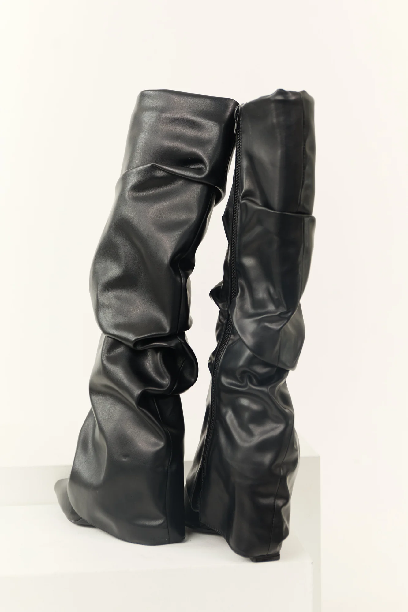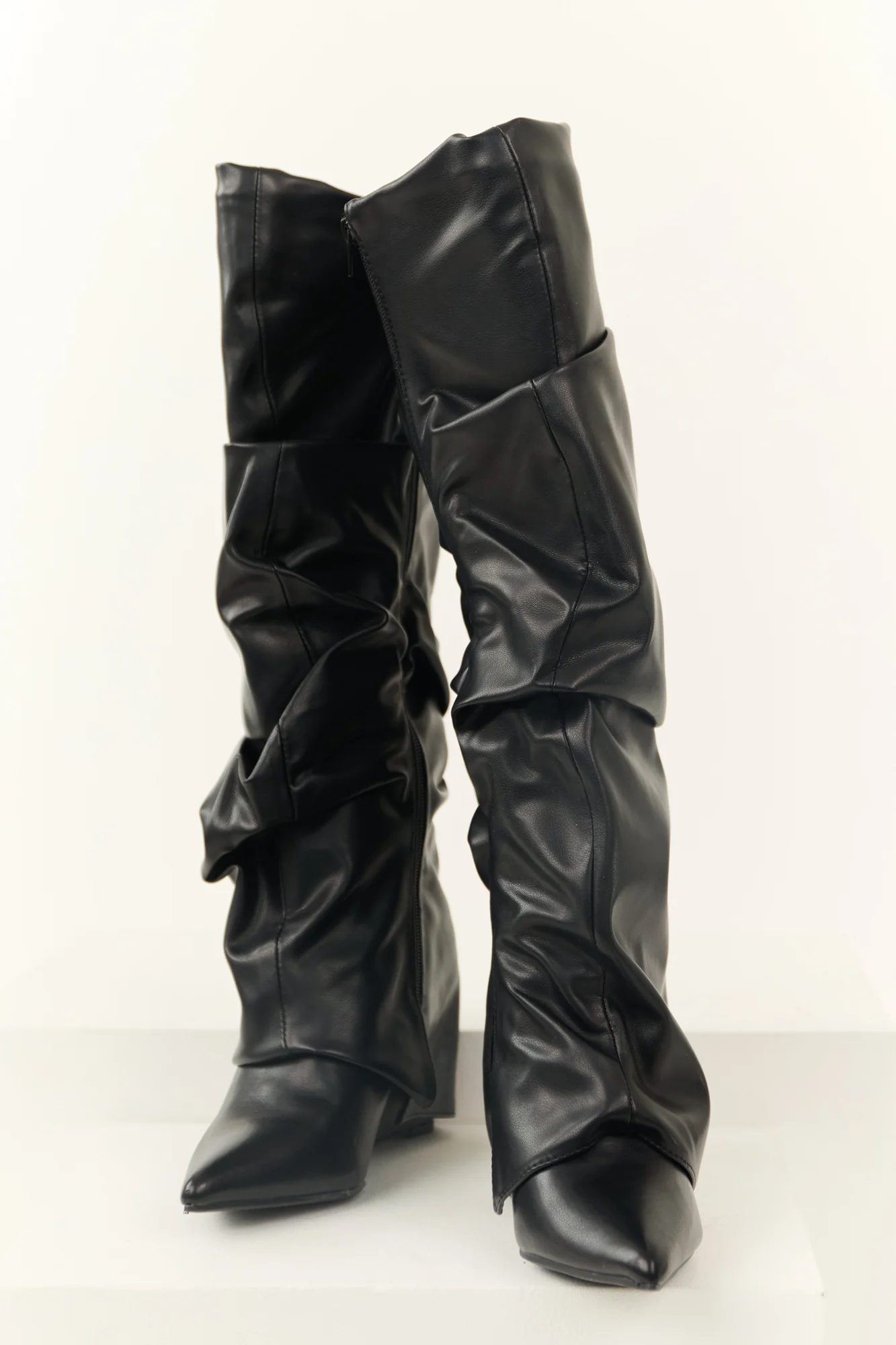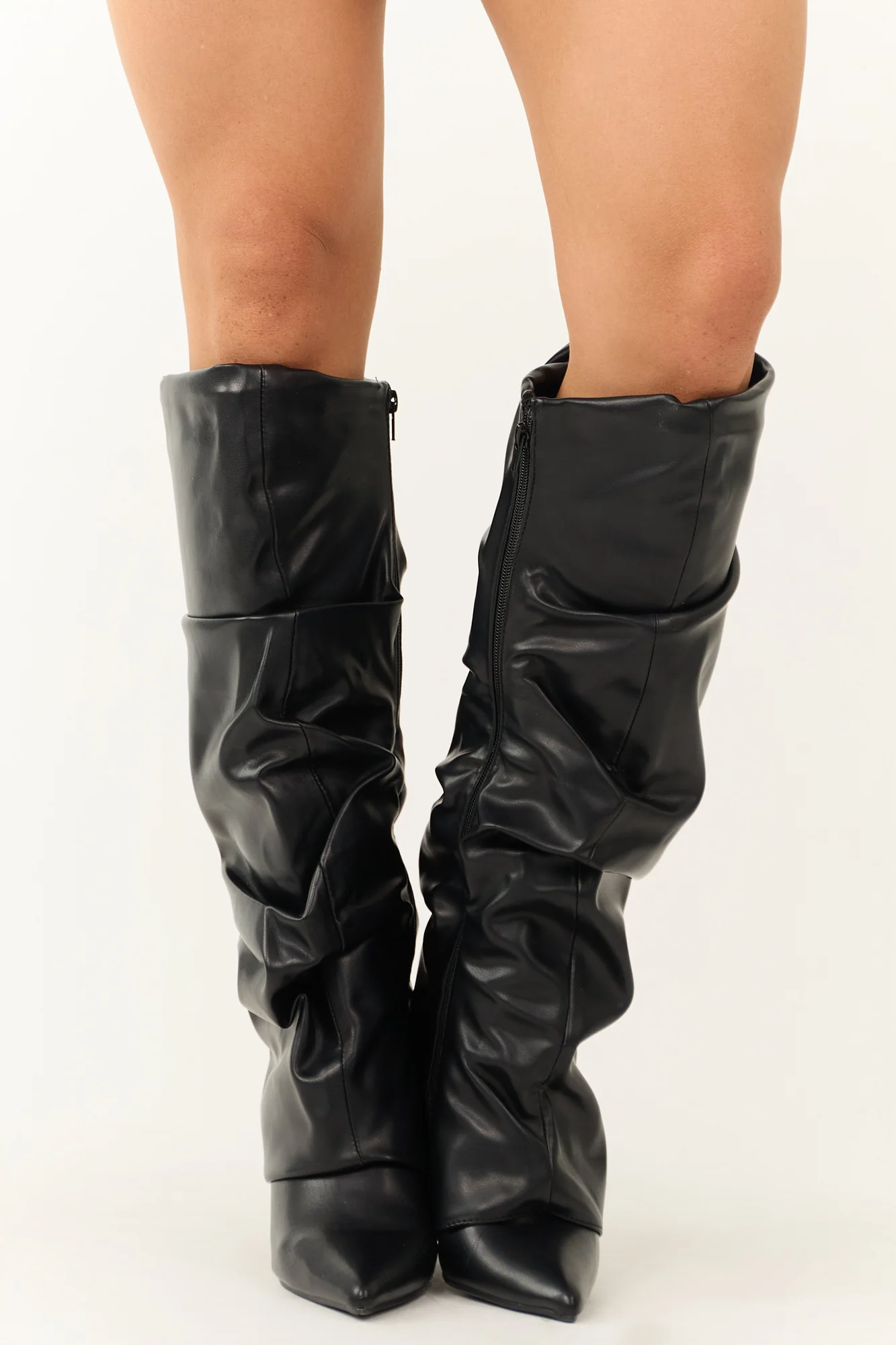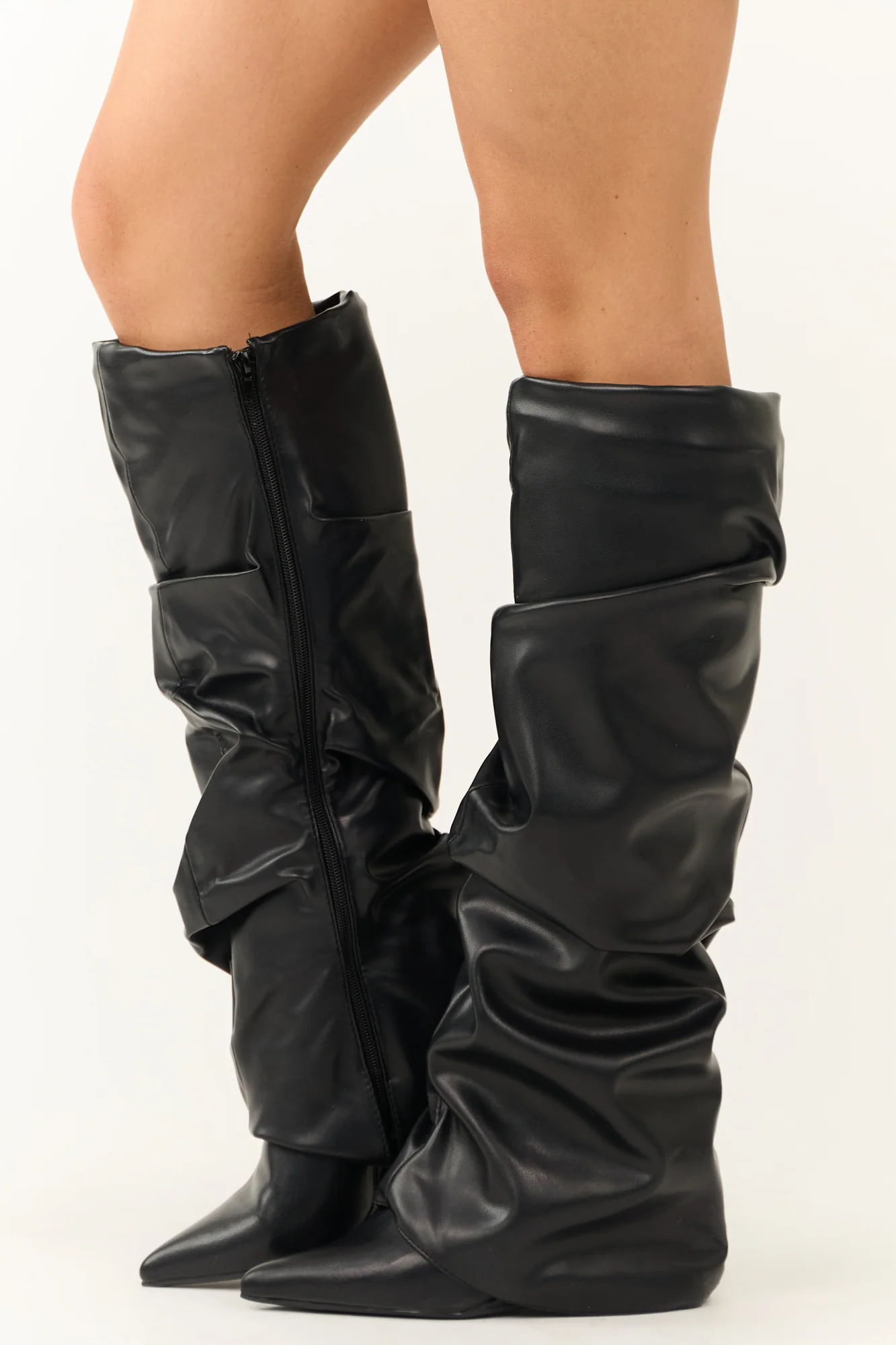 Embrace elegance with these chic black knee-high boots for women. Crafted from semi-stretchy faux leather with a pointed toe and wedge heel. Complete with a side zipper, foldover design, and measuring 3.5″ heel, 19″ shaft, and 15″ circumference on size 8. Ideal for daytime outings or date nights. Elevate your style effortlessly with these imported statement boots.