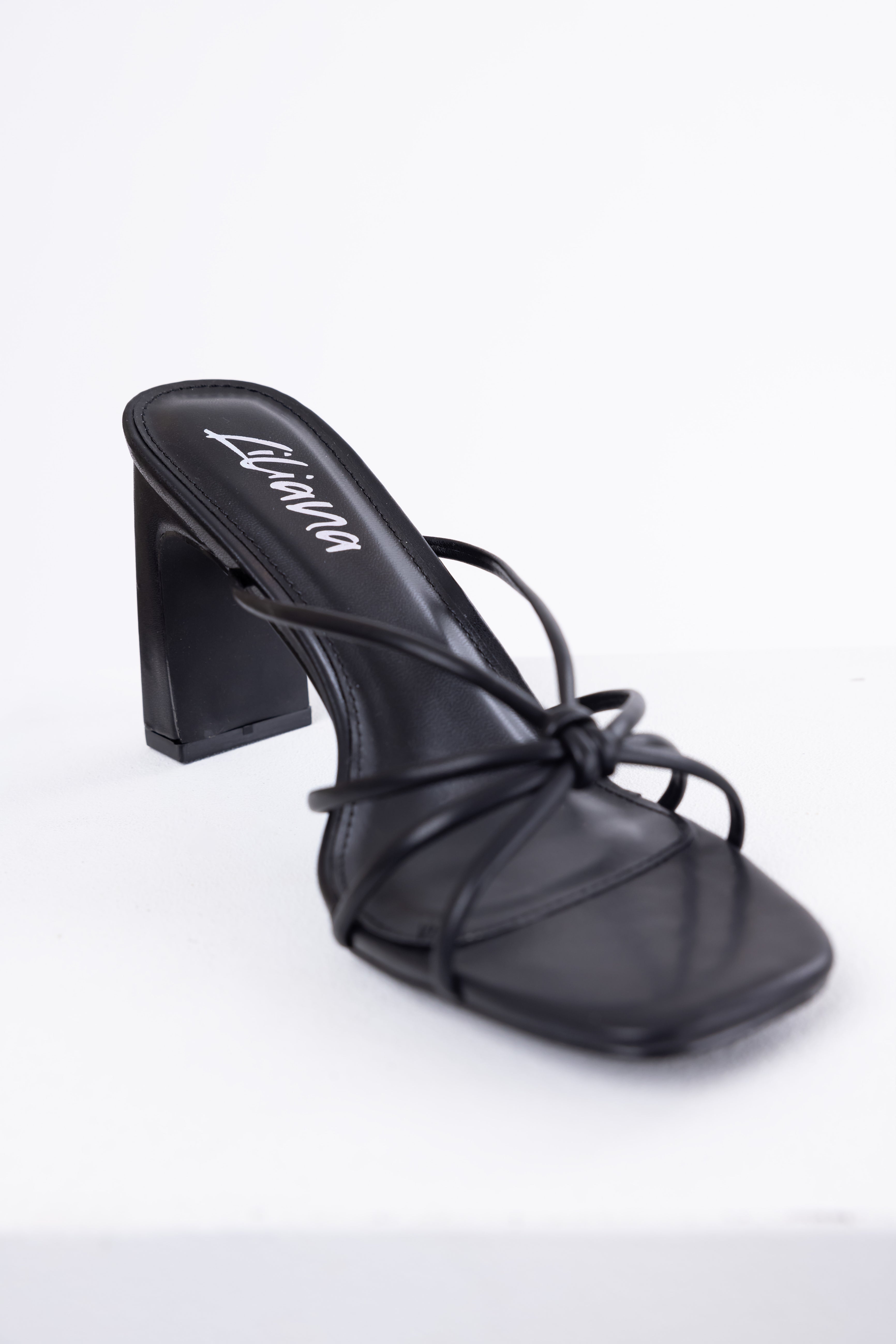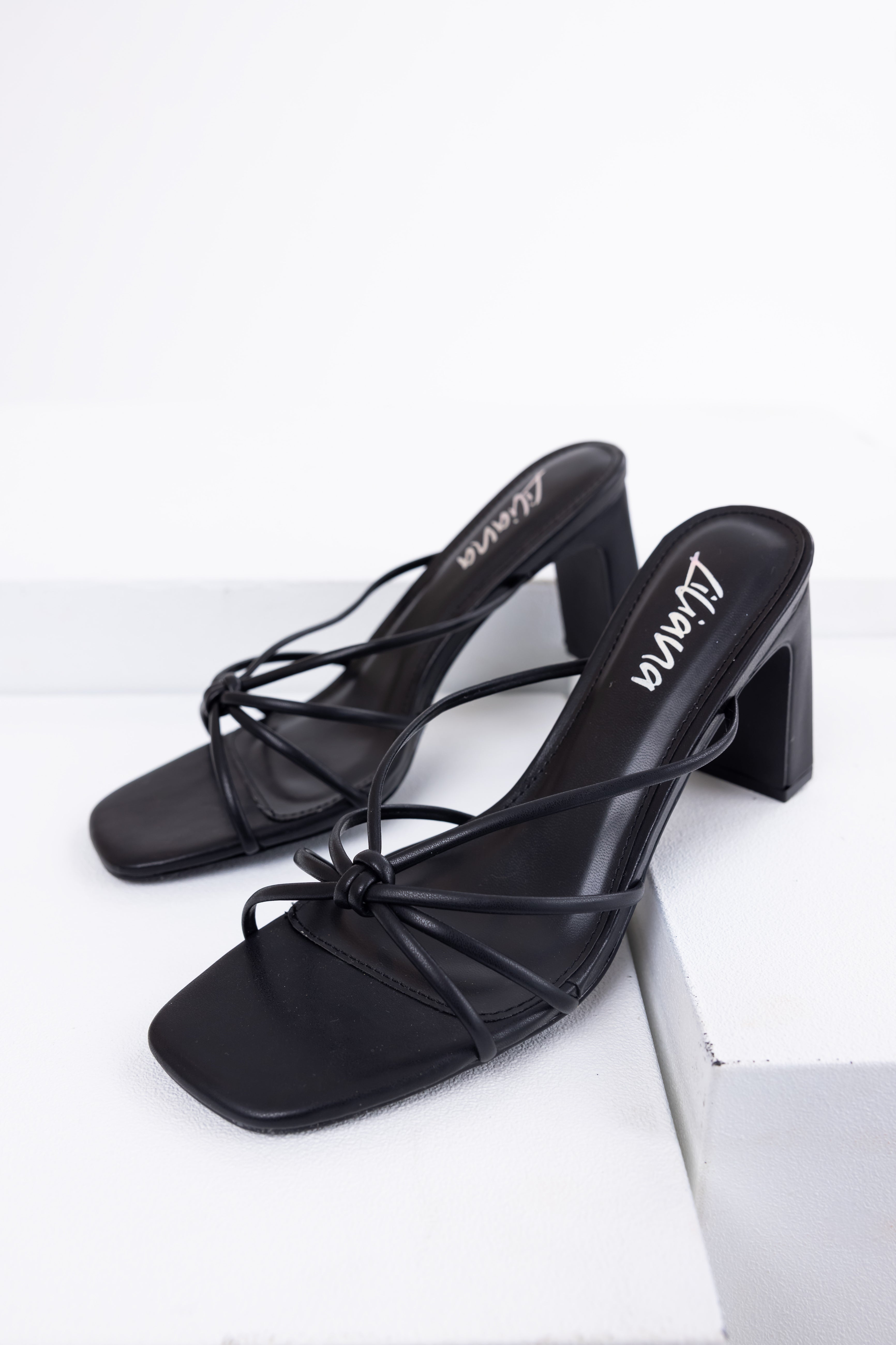 Make a striking statement with these black strappy dress heels. Crafted from faux leather, they feature an open square toe design and a stylish backless mule silhouette. The block heel adds significant height and style, measuring 3.5 inches. Imported and designed for size 8, these chic dress heels are perfect for elevating any outfit.