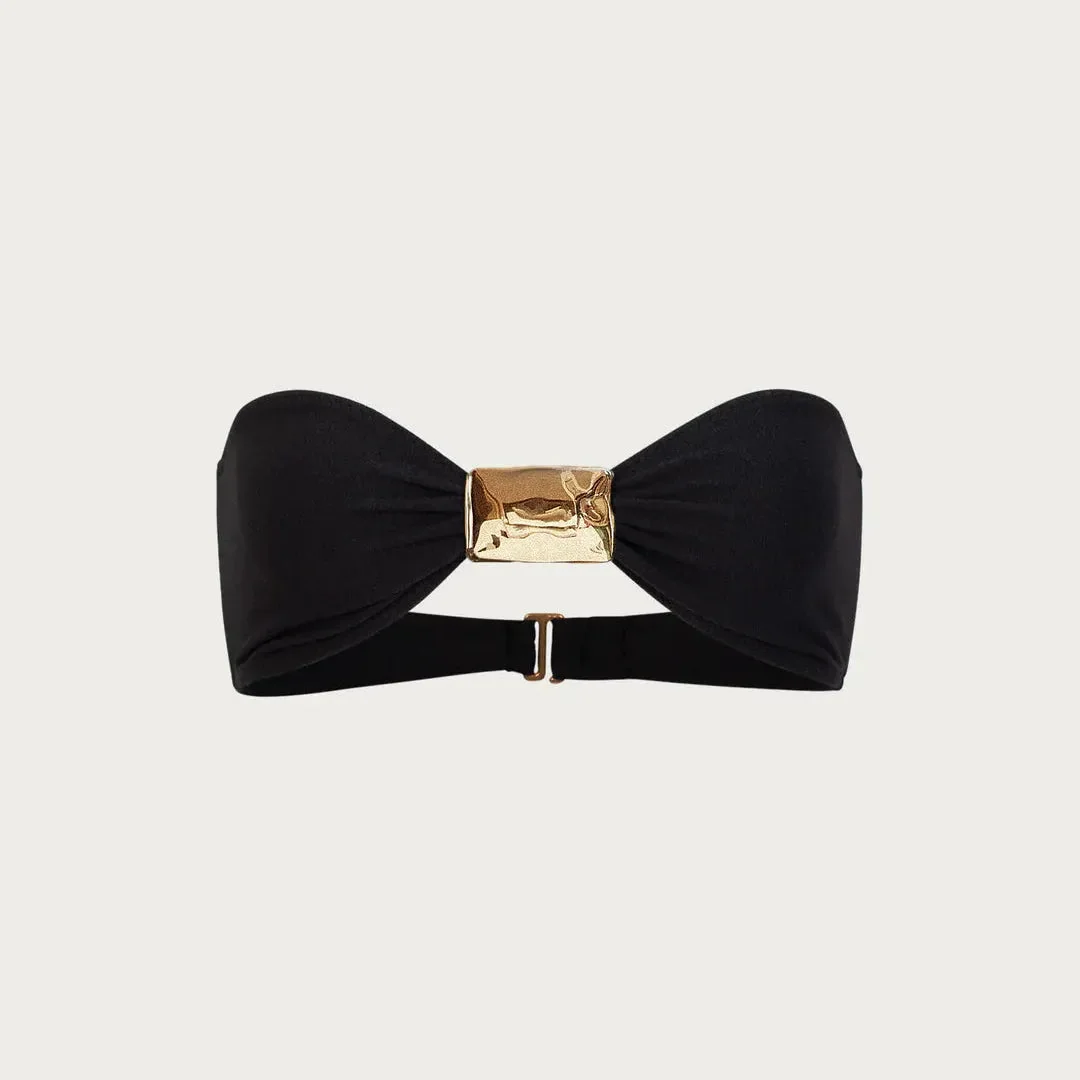 Elevate your beach look with this strapless bikini in classic black. Designed to flaunt a tan-line-free silhouette, the gold accents add a touch of sophistication. Stay confidently chic whether lounging by the pool or taking a dip. The versatile minimalist design pairs effortlessly with cover-ups for a stylish ensemble. Dont miss out on this must-have fashion piece for beach enthusiasts. Get yours now for the perfect blend of comfort and elegance. Explore style ideas on Instagram @mermaid_way. Enjoy hassle-free size exchanges for the ideal fit.