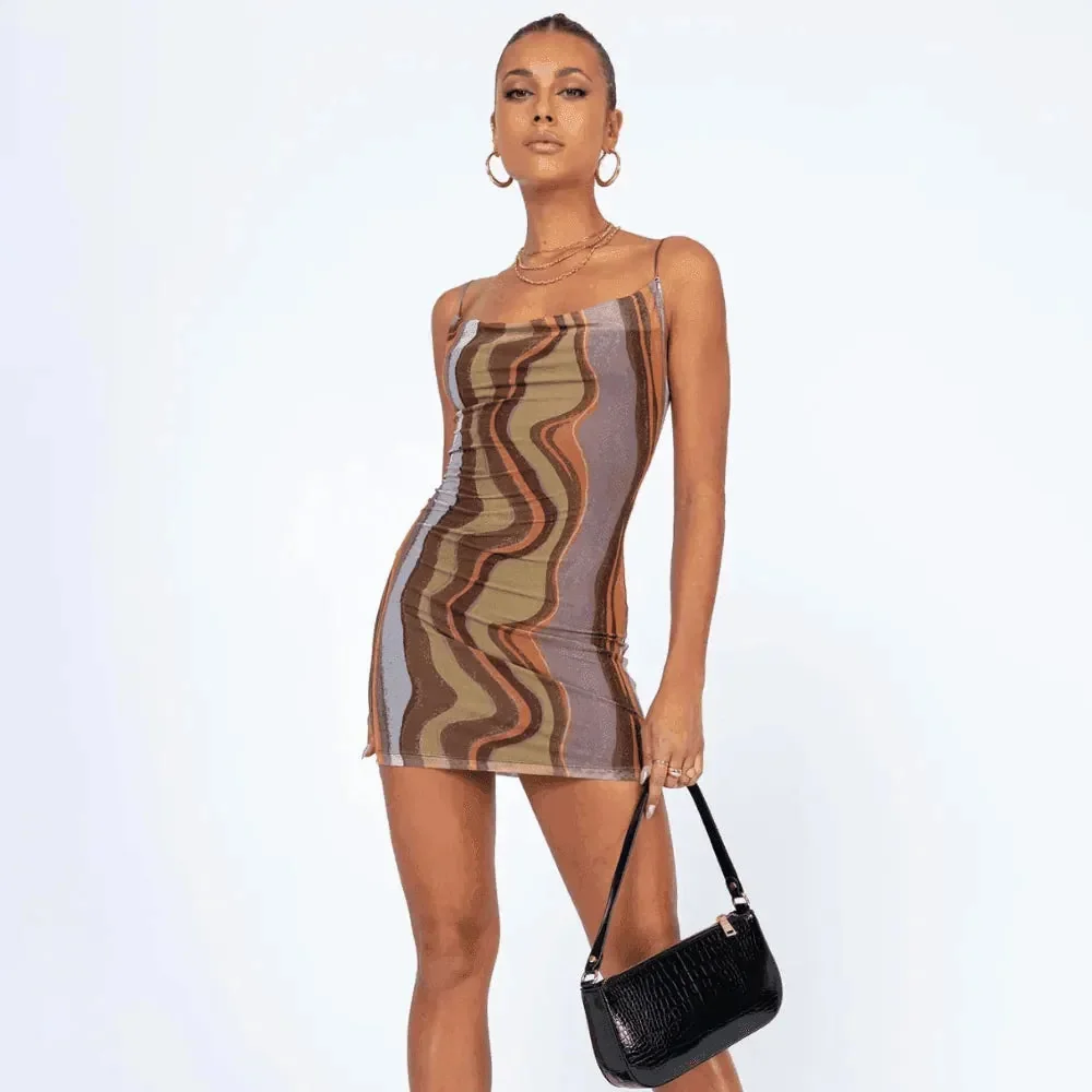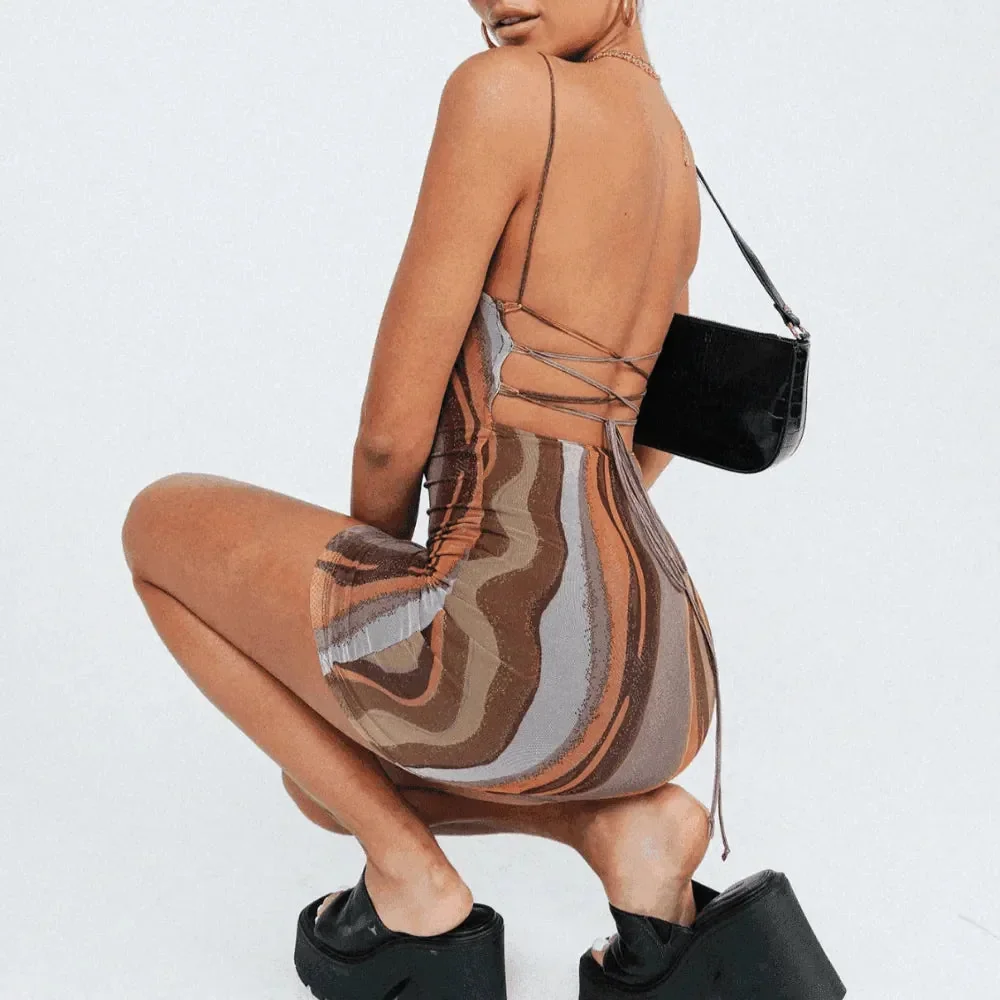 Elevate your wardrobe with our chic Brown Gradient Print Backless Mini Dress . Designed with a slim fit and crafted from 100% polyester mesh material, this earthy print dress features a cowl neck, thin shoulder straps, and a lace-up back detail. The fully exposed back adds allure while providing a good stretch for comfort. Perfect for any occasion, this dress will make you stand out and feel confident. Its unique print and graceful silhouette ensure sophistication for both daytime and evening events. Embrace elegance with this exquisite dress and let every moment be magical! For more style inspiration, follow us on Instagram @mermaid_way.
